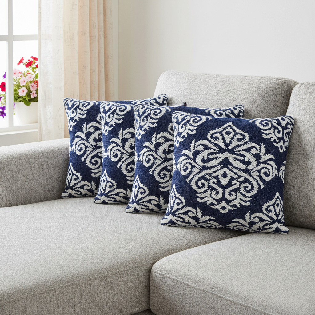 Add an air of fashion to your room and rejuvenate the space with this cute and fashionable set of four 20-inch blue and white damask cotton blend throw pillow covers. These great looking soft decorative pillow covers are expertly made of durable and long lasting cotton blend in a blue and white coloration. Pillow covers are a good idea for anyone that loves to decorate or accent their space with color and texture. Combine with your own fill or insert to add decoration and dimension to your favorite chair, accent your sofa, or to use as part of your bed ensemble. 20.00-inch h x 20.00-inch w x 0.25-inch d.