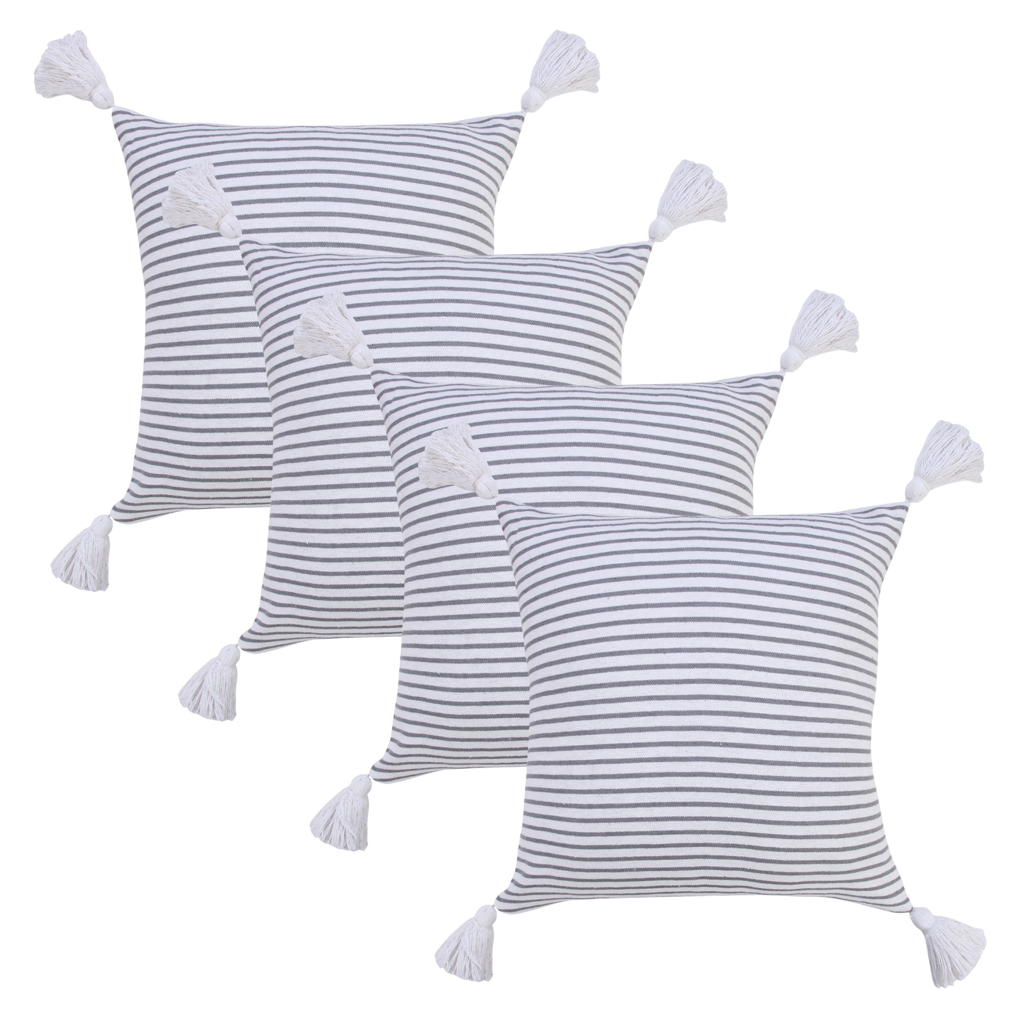Bring a bit of fashion and zip to your space with this eye-catching and comfy set of four 20-inch gray and white striped cotton throw pillow covers. Ultra durable gray and white cotton has been used to make this decorative pillow cover set a beautiful look that will stand the test of time. Pillow covers are a good idea for anyone that loves to decorate or accent their space with color and texture. Combine with your own fill or insert to add decoration and dimension to your favorite chair, accent your sofa, or to use as part of your bed ensemble. 20.00-inch h x 20.00-inch w x 0.25-inch d.