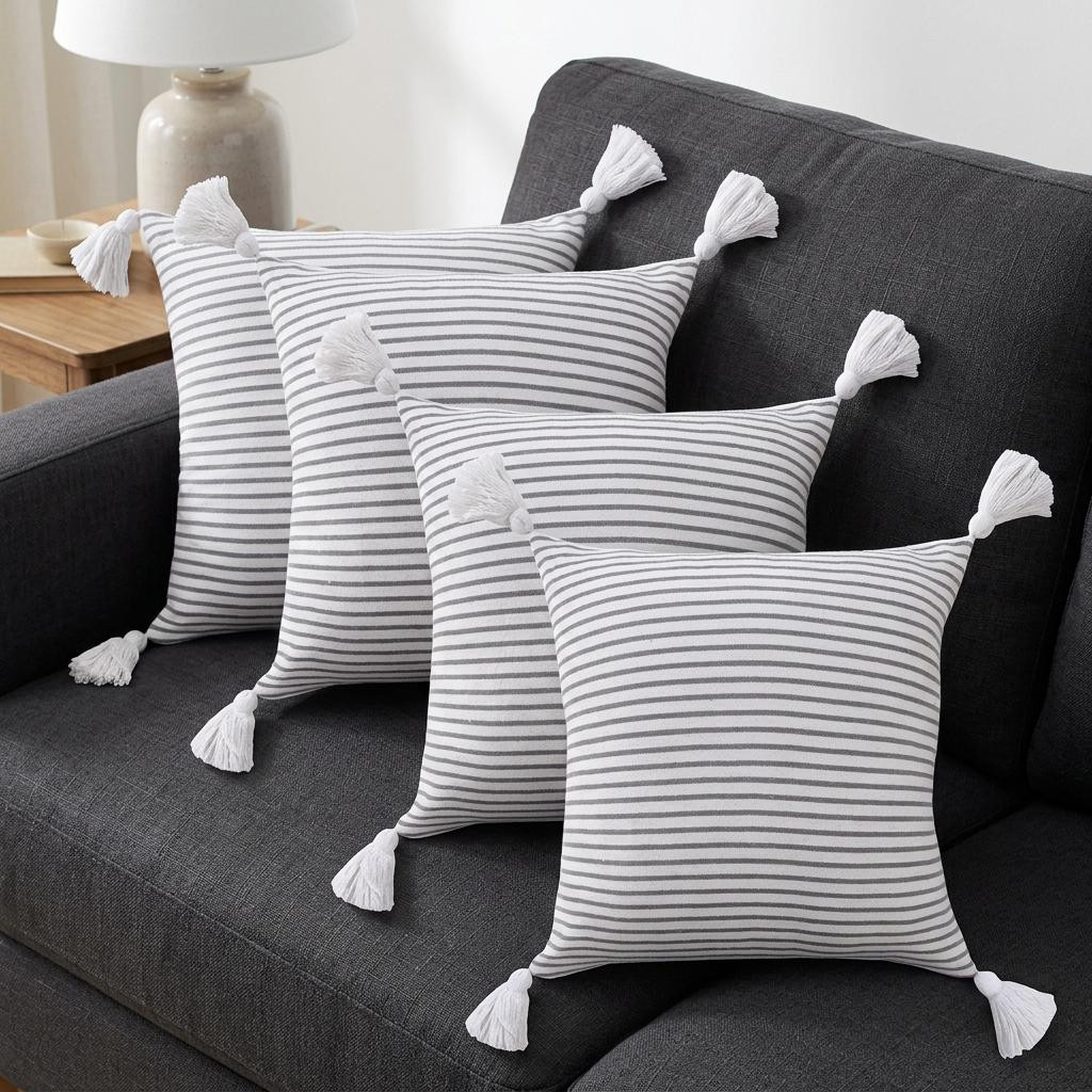 This set of four 20-inch x 20-inch gray and white lumbar striped cotton throw pillow covers with tassels will add a beautiful decorative accent to your decor. This gray and white colored decorative pillow cover set is made from high grade cotton that is durable and soft to the touch. Charming decorative tassels give this design texture along with a hand-crafted look and feel. Pillow covers are a good idea for anyone that loves to decorate or accent their space with color and texture. Combine with your own fill or insert to add decoration and dimension to your favorite chair, accent your sofa, or to use as part of your bed ensemble. 20.00-inch h x 20.00-inch w x 18.00-inch d.