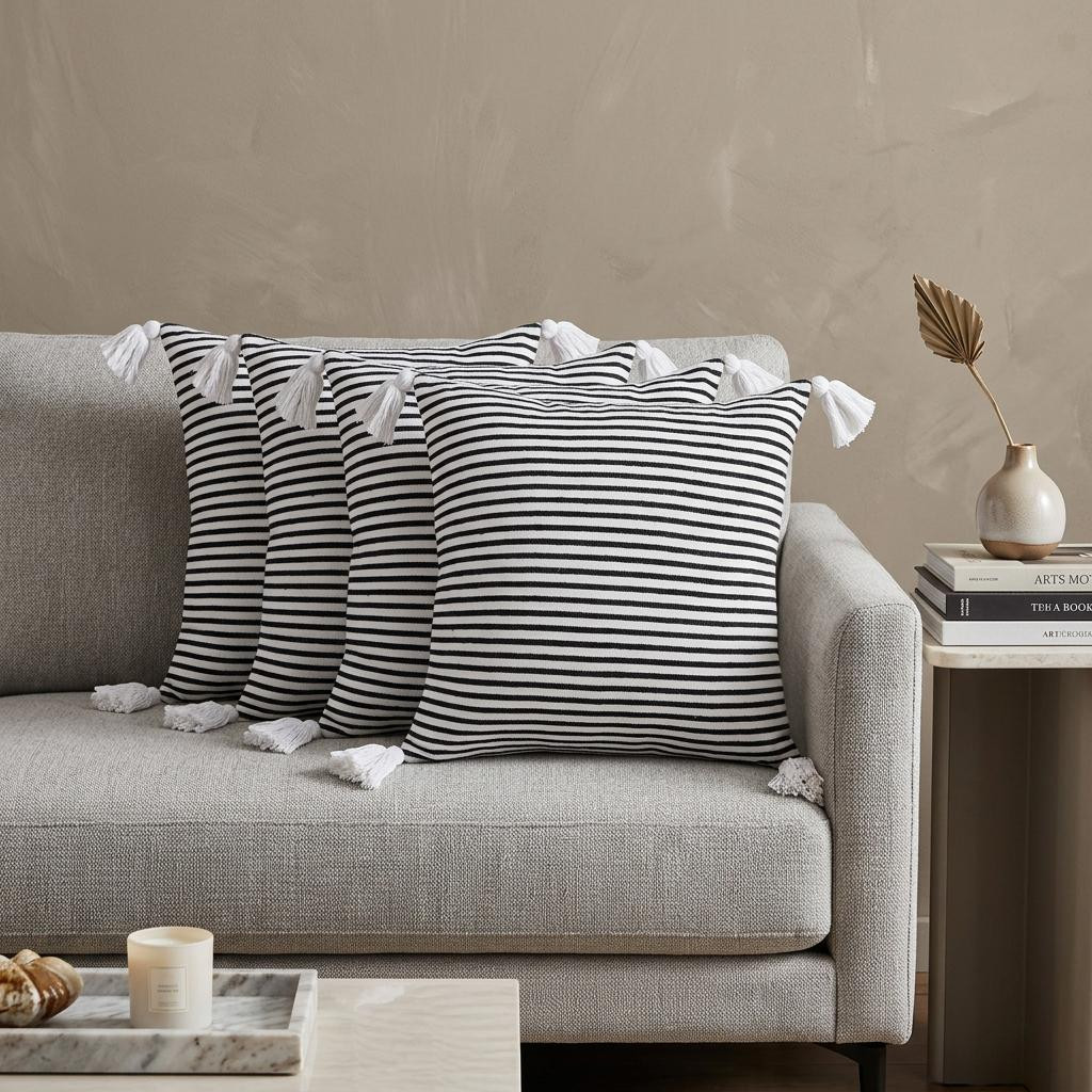 Add an air of fashion to your room and rejuvenate the space with this cute and fashionable set of four 20-inch x 20-inch black and white lumbar striped cotton throw pillow covers with tassels. This black and white colored decorative pillow cover set is made from high grade cotton that is durable and soft to the touch. Fun and decorative tassels add some high end and hand-crafted textural designer touches. Pillow covers are a good idea for anyone that loves to decorate or accent their space with color and texture. Combine with your own fill or insert to add decoration and dimension to your favorite chair, accent your sofa, or to use as part of your bed ensemble. 20.00-inch h x 20.00-inch w x 18.00-inch d.