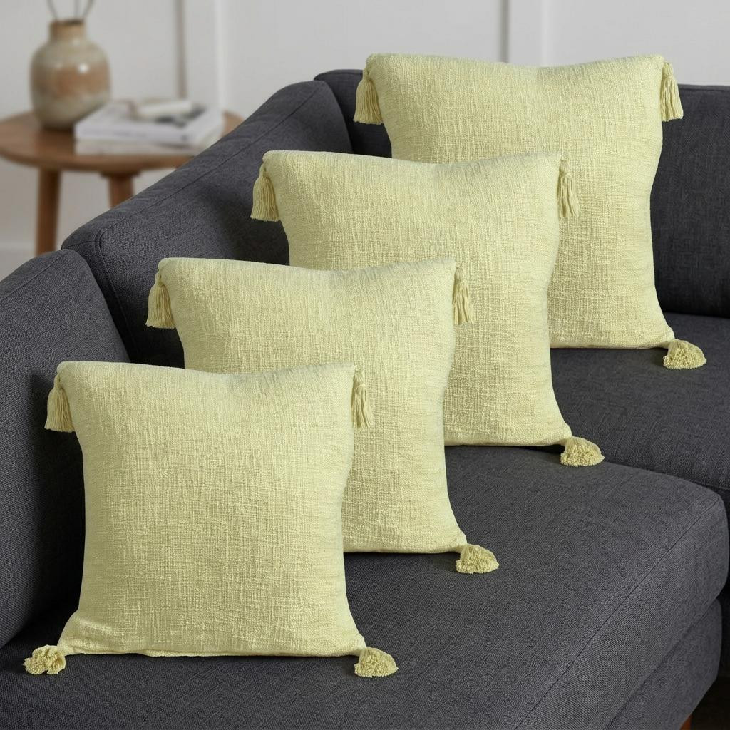 The set of four 20-inch x 20-inch yellow lumbar cotton throw pillow covers with tassels is the perfect decorative accessory for your home. This yellow colored decorative pillow cover set is made from high grade cotton that is durable and soft to the touch. Charming decorative tassels give this design texture along with a hand-crafted look and feel. Pillow covers are a good idea for anyone that loves to decorate or accent their space with color and texture. Combine with your own fill or insert to add decoration and dimension to your favorite chair, accent your sofa, or to use as part of your bed ensemble. 20.00-inch h x 20.00-inch w x 18.00-inch d.