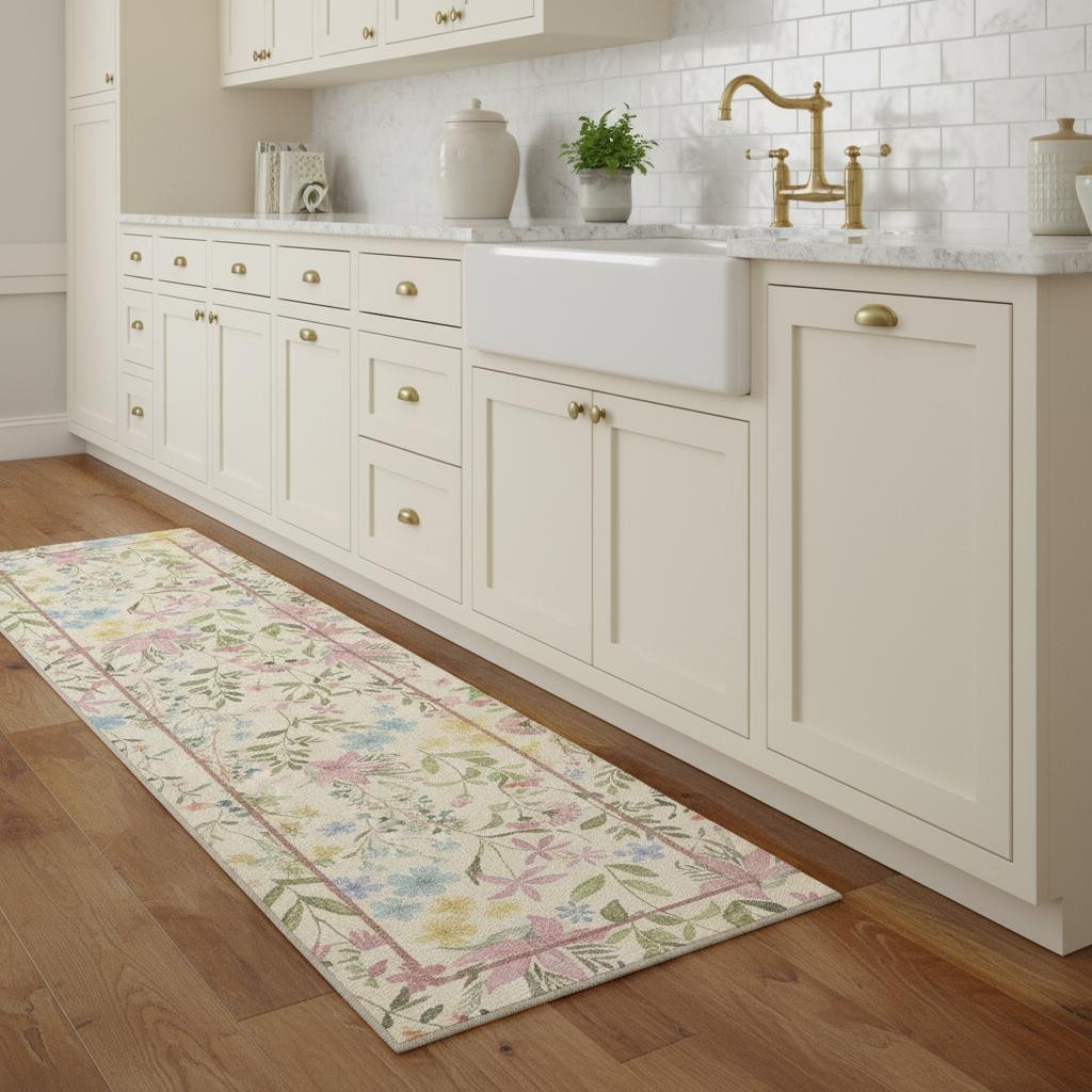 Set an inviting tone in your space with this 8-foot ivory pink and green floral washable area rug. Ideal for spaces with kids and pets, this rug is stain resistant to help repel dirt and spilled liquids. Built to last, this rug crafted from polyester fibers is known for its durability and long lasting appeal. Rugs are a great way to showcase your style, hide imperfections, warm your home and reduce noise. This larger sized, traditional styled rug is ready to create a focal point or statement piece in your room. 96.00-inch h x 24.00-inch w x 0.30-inch d.