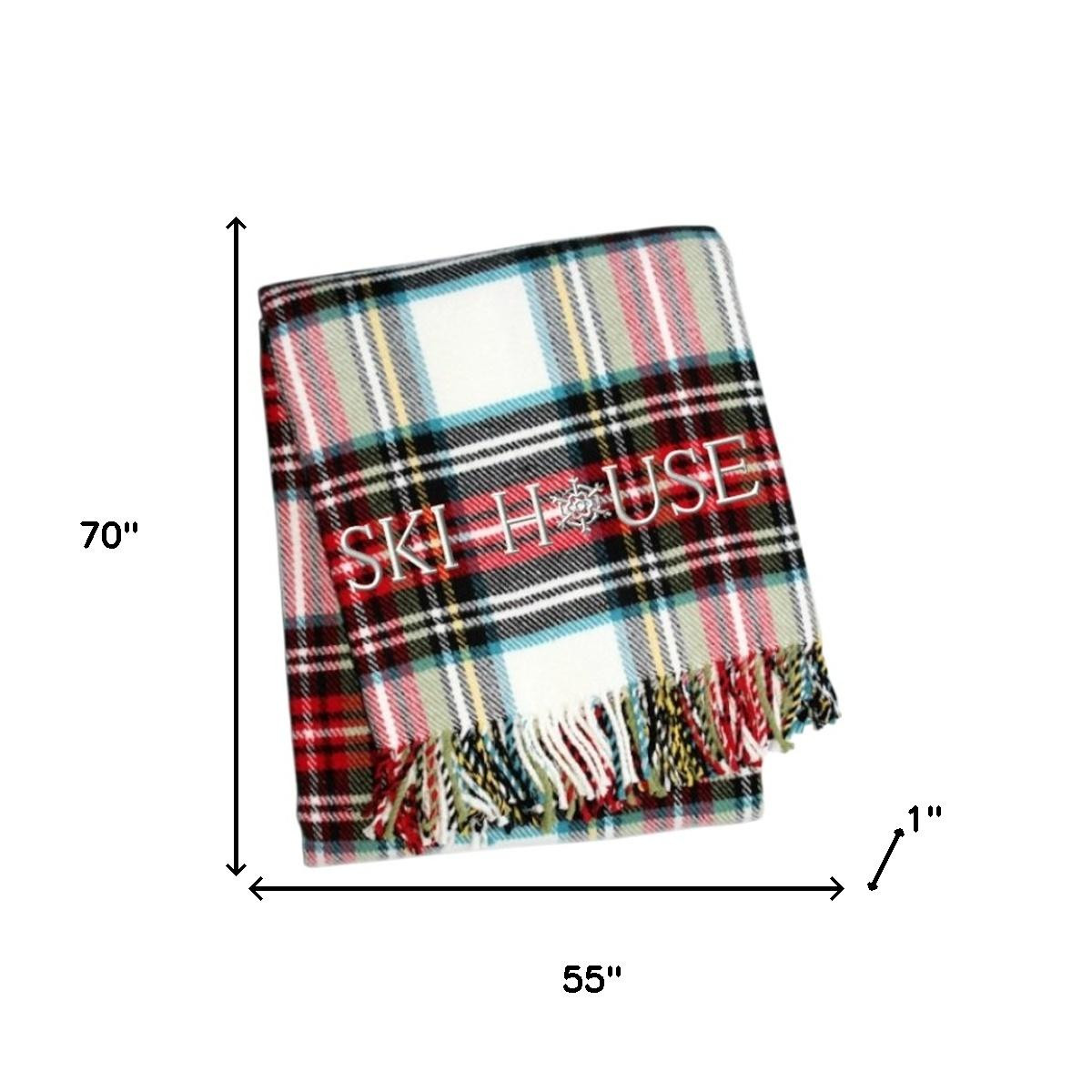 ski house plush throw blanket, house plush throw blanket, plush throw blanket fringe embroidery, woven ski house plush, cream red white plaid cotton |