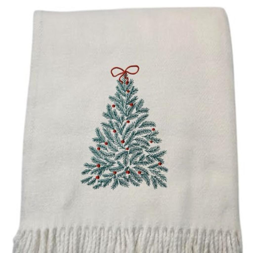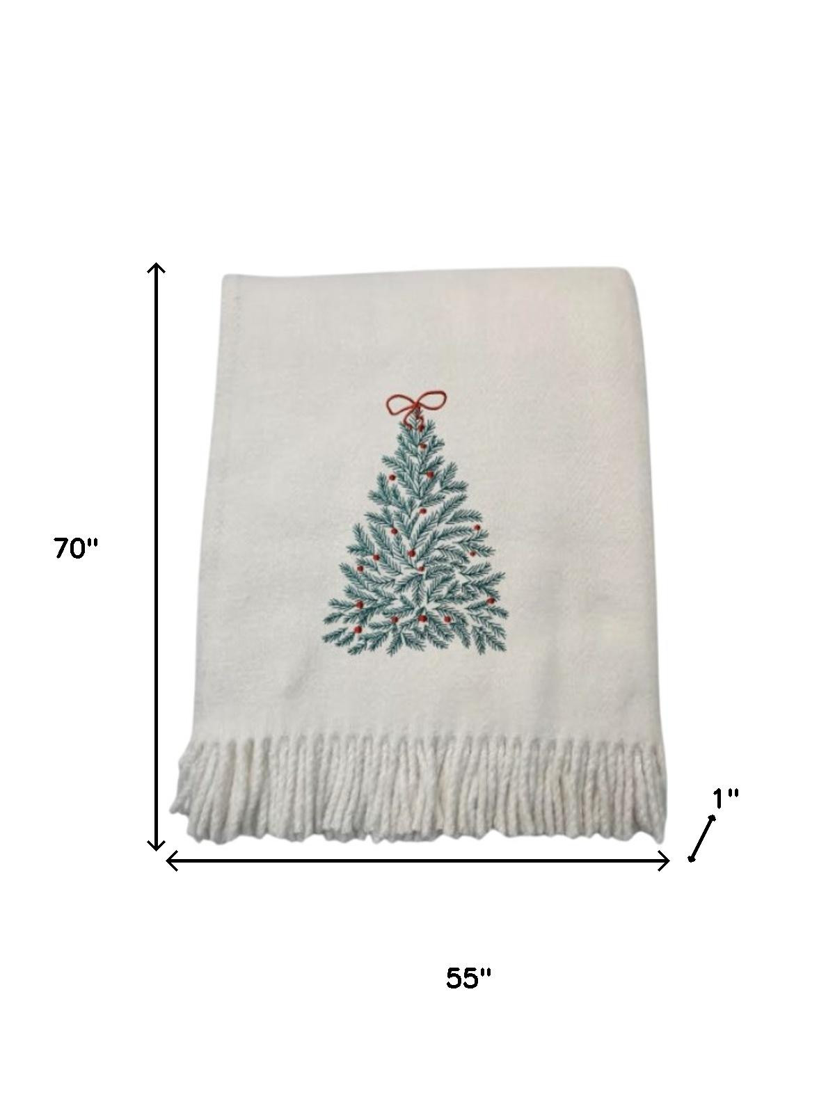 This 55-inch x 70-inch cream cotton blend woven christmas tree embroidered throw blanket with fringe is a stylish addition to any sofa. This plush throw is cozy soft beyond belief and oh-so-giftable. Featuring beautiful embroidery, this embellished throw is of the highest quality and design. This woven throw offers sumptuous softness and texture that you'll cherish for years to come. Made from cotton blend this blanket will make a great addition to any room it's added to. This cozy throw blanket is sure to become your go-to couch companion. 70.00-inch h x 55.00-inch w x 1.00-inch d.