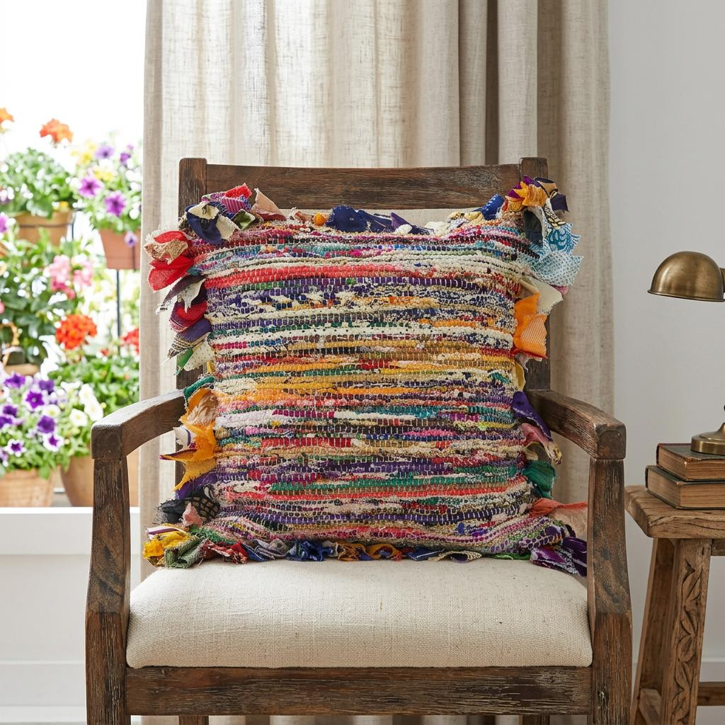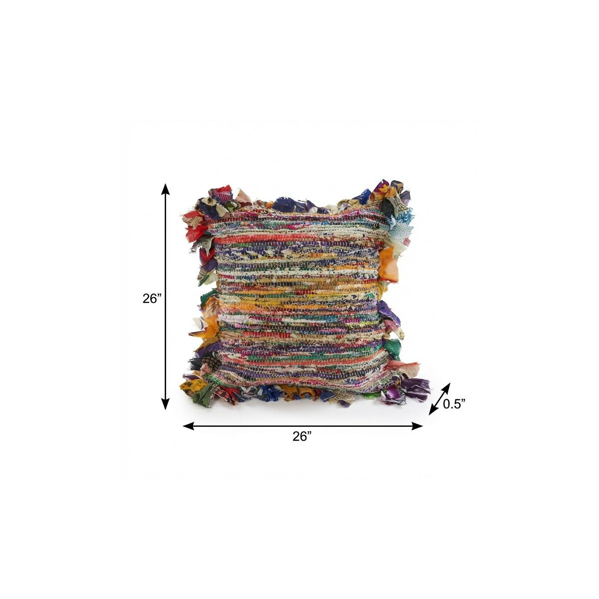 This 26-inch pink blue red and orange floor striped rayon throw pillow cover with tufts will add a beautiful decorative accent to your decor. This soft and durable decorative pillow cover is expertly made of high grade, long lasting rayon in a pink, blue, red, and orange coloration. Fun and decorative tufts add some high end and hand-crafted textural designer touches. Pillow covers are a good idea for anyone that loves to decorate or accent their space with color and texture. Combine with your own fill or insert to add decoration and dimension to your favorite chair, accent your sofa, or to use as part of your bed ensemble. 26.00-inch h x 26.00-inch w x 0.50-inch d.