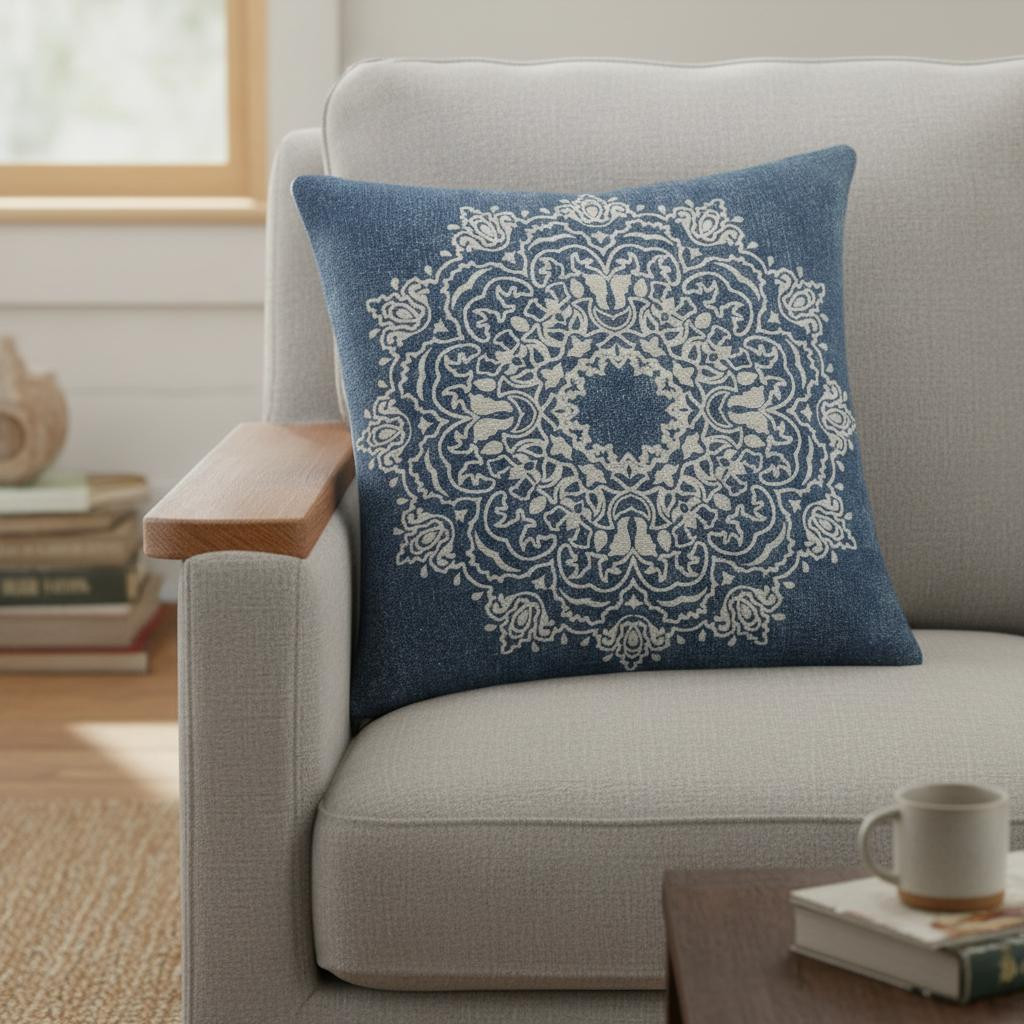 The perfect complement to your sofa, favorite chair, or bed, this 20-inch blue and white medallion cotton throw pillow cover is a great decorative accent. The blue and white coloring of the extremely durable and long lasting cotton pillow cover will add dimension and texture to your space. Pillow covers are a good idea for anyone that loves to decorate or accent their space with color and texture. Combine with your own fill or insert to add decoration and dimension to your favorite chair, accent your sofa, or to use as part of your bed ensemble. 20.00-inch h x 20.00-inch w x 0.25-inch d.