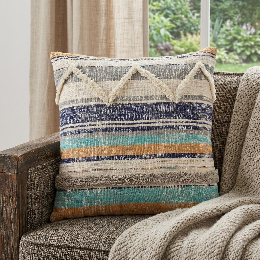 Unique and decorative, this comfortable 18-inch blue and tan beach striped cotton throw pillow cover with tufts and texture will leave a lasting impression. This blue and tan colored decorative pillow cover is made from high grade cotton that is durable and long lasting. Pillow covers are a good idea for anyone that loves to decorate or accent their space with color and texture. Combine with your own fill or insert to add decoration and dimension to your favorite chair, accent your sofa, or to use as part of your bed ensemble. 18.00-inch h x 18.00-inch w x 0.50-inch d.