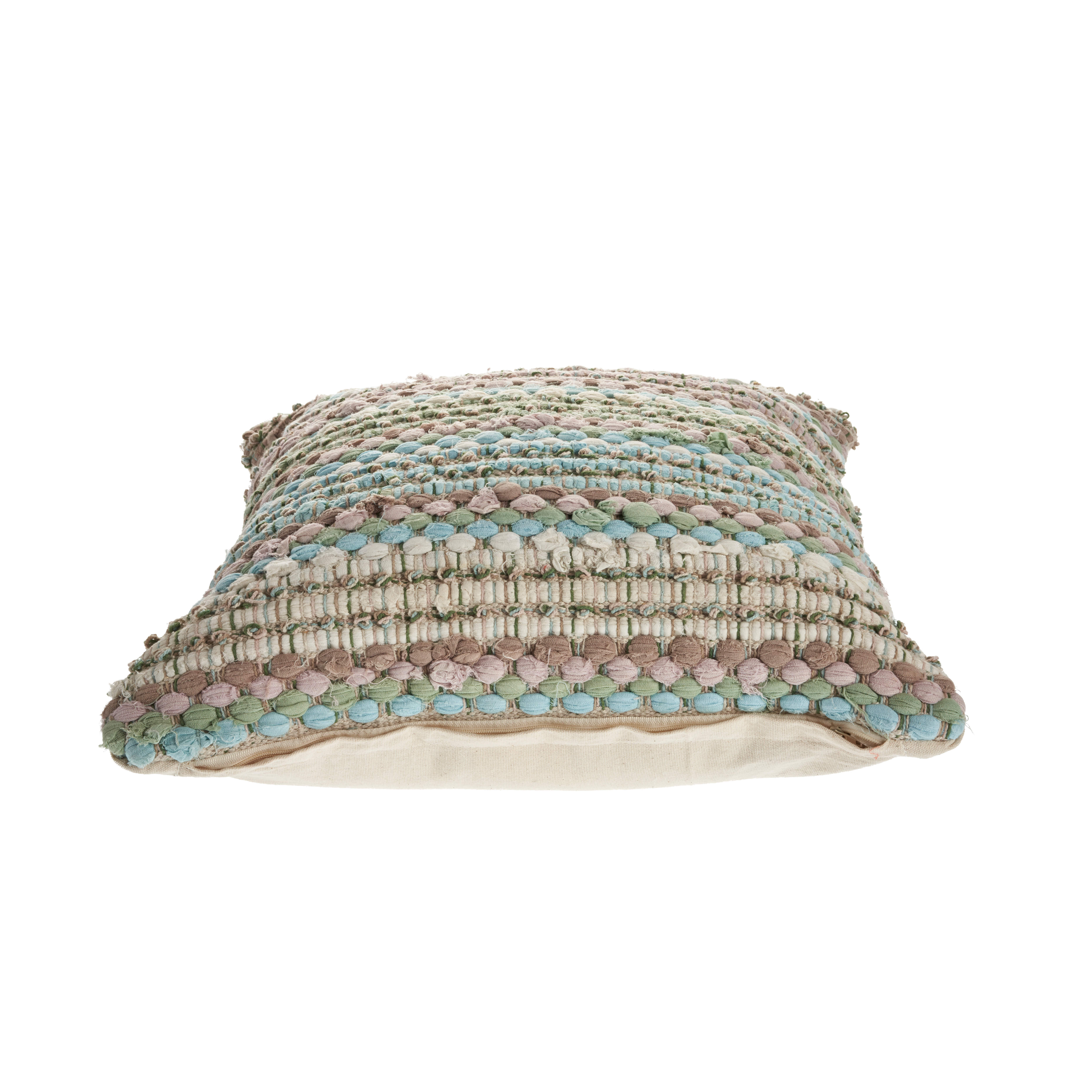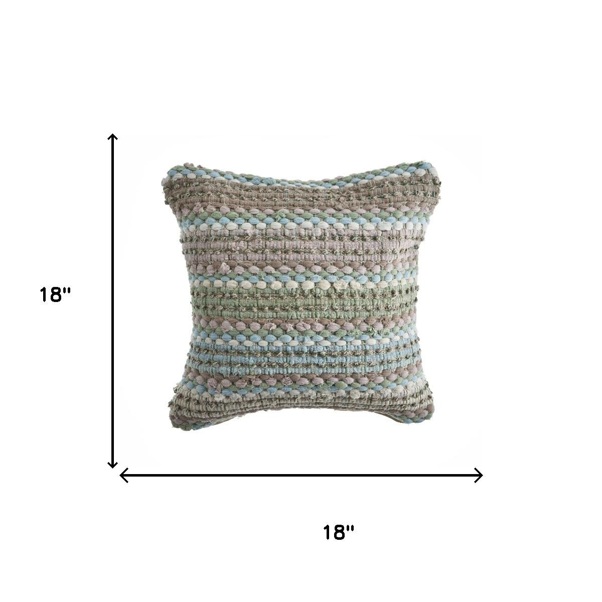 This 18-inch green and blue beach striped cotton blend throw pillow cover will add a beautiful decorative accent to your decor. This soft and durable decorative pillow cover is expertly made of high grade, long lasting cotton blend in a green and blue coloration. Decorative pillow covers are a great way to change up the look and feel of your space easily and quickly. Combine with your own fill or insert to add decoration and dimension to your favorite chair, accent your sofa, or to use as part of your bed ensemble. 18.00-inch h x 18.00-inch w x 0.50-inch d.