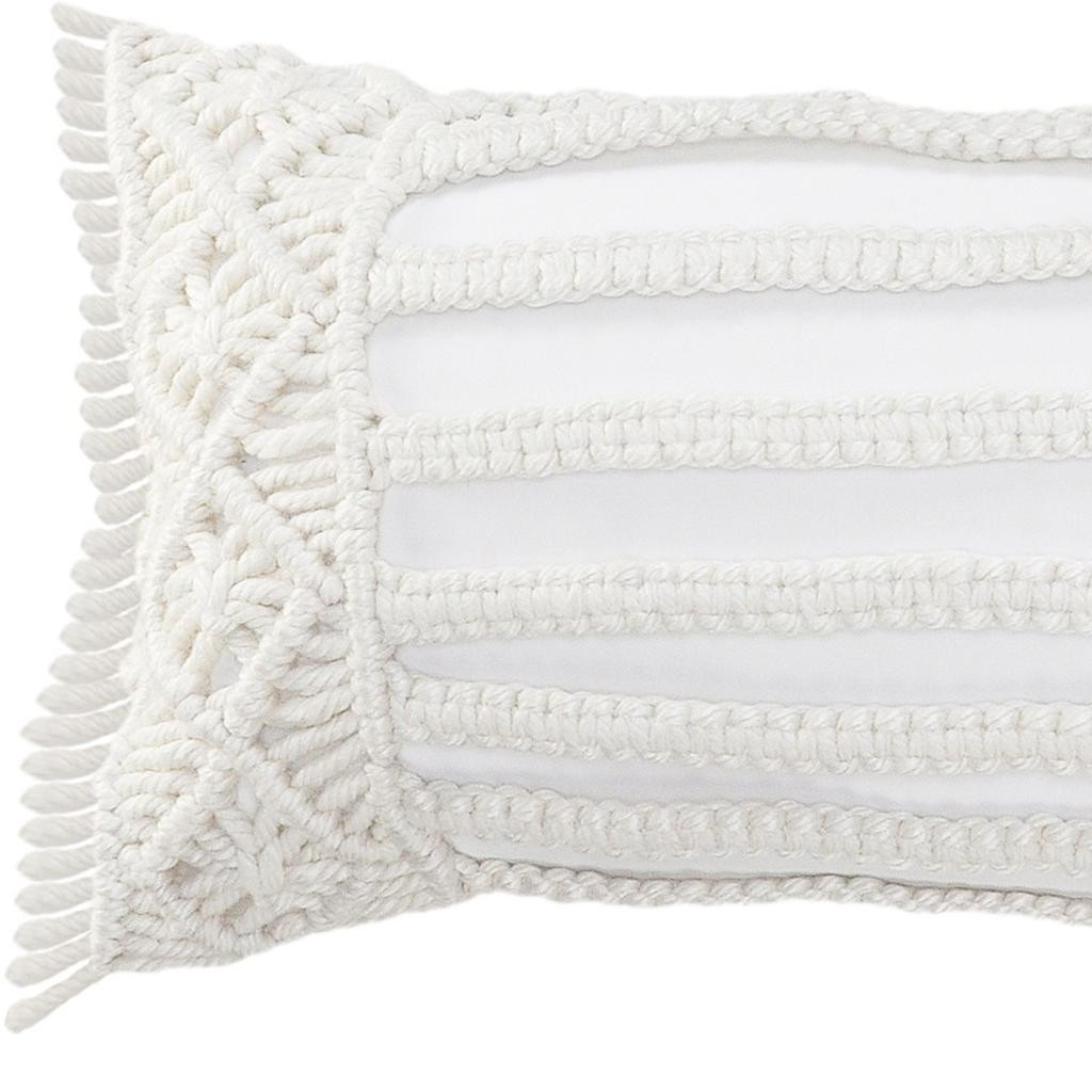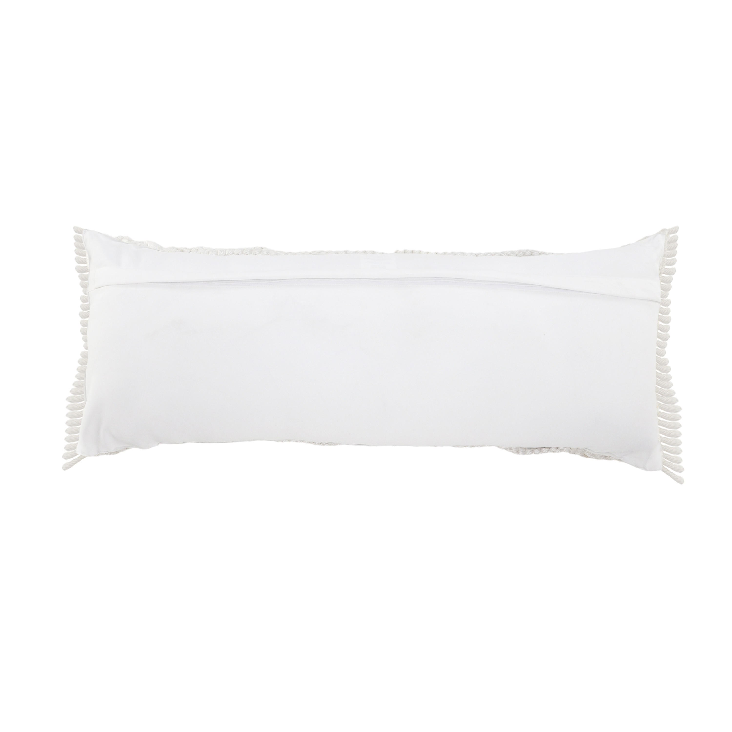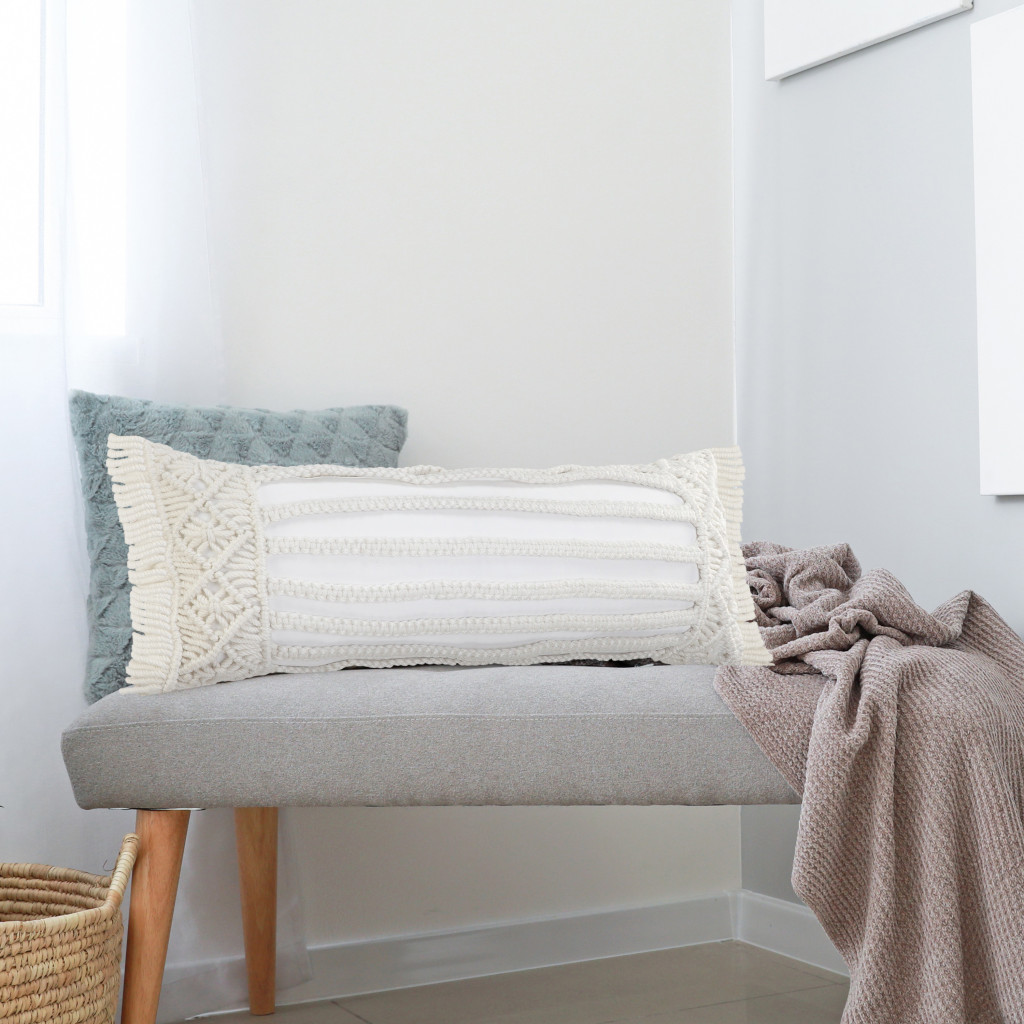 This 14-inch x 36-inch ivory and white lumbar striped throw pillow cover with fringe and texture will add a beautiful decorative accent to your decor. The ivory and white coloring of the extremely durable and long lasting polyester pillow cover will add dimension and texture to your space. Pillow covers are a good idea for anyone that loves to decorate or accent their space with color and texture. Combine with your own fill or insert to add decoration and dimension to your favorite chair, accent your sofa, or to use as part of your bed ensemble. 14.00-inch h x 36.00-inch w x 0.25-inch d.