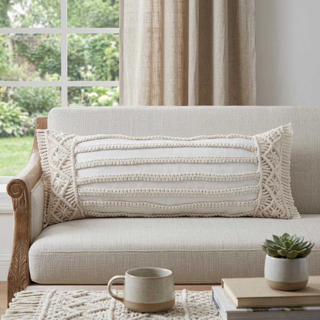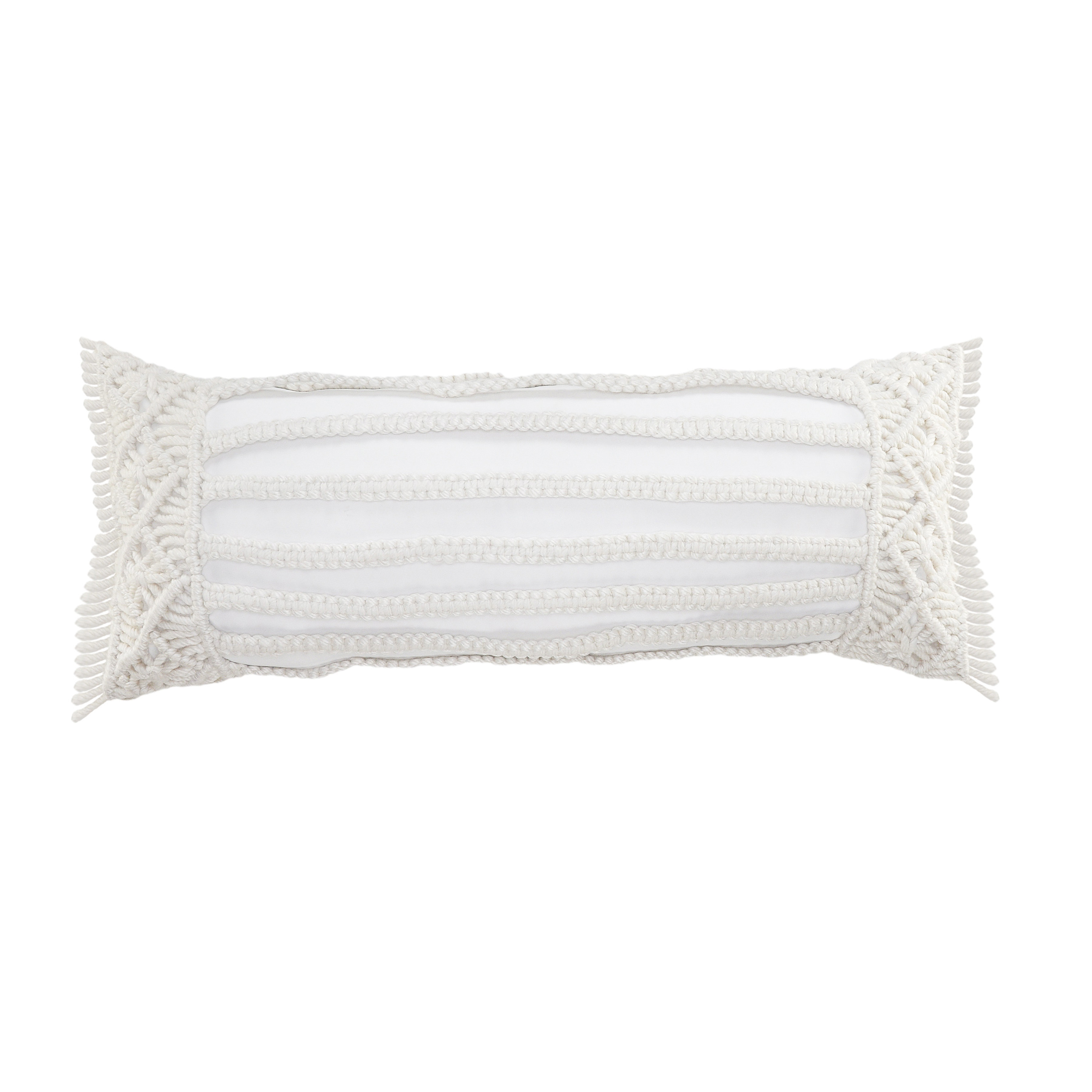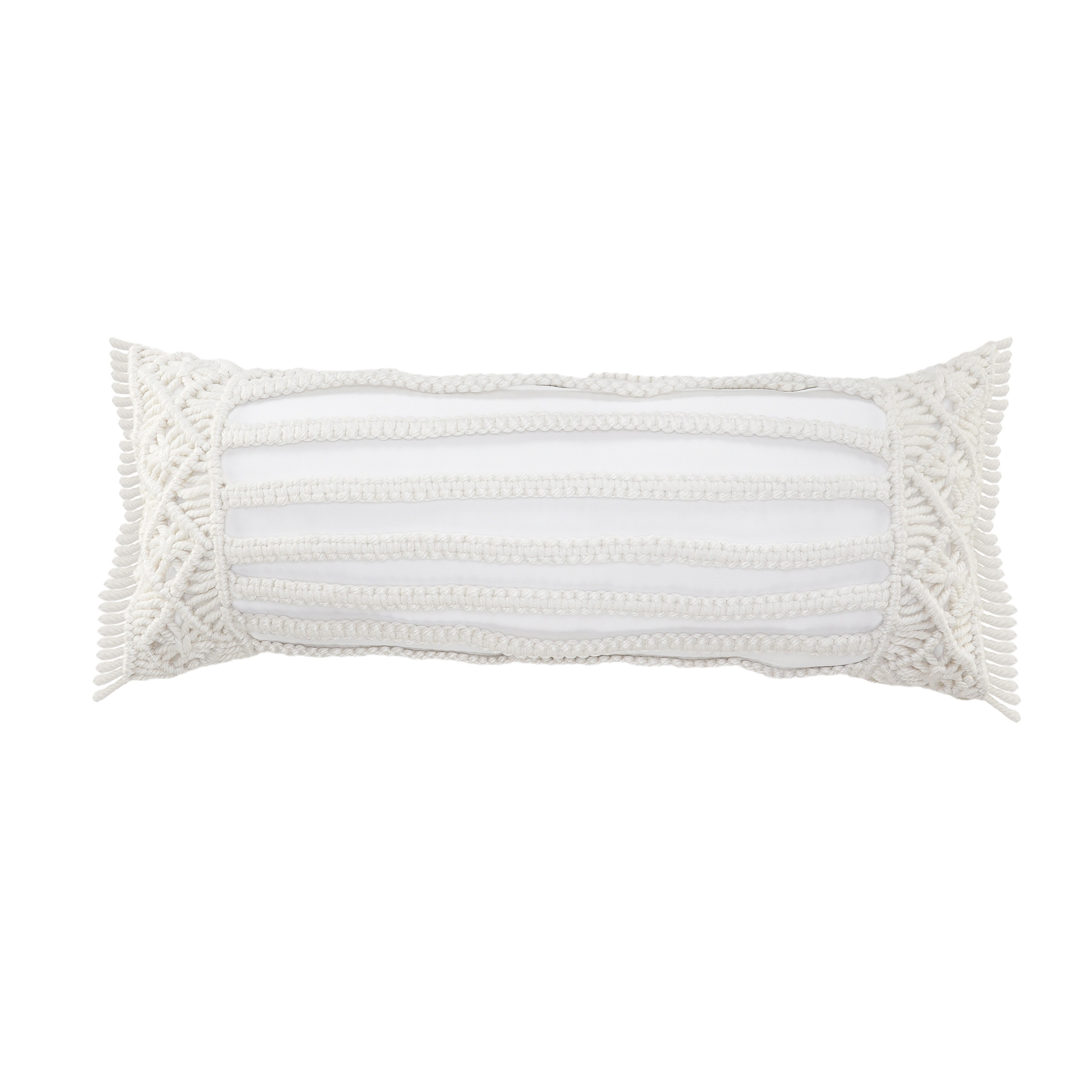 This 14-inch x 36-inch ivory and white lumbar striped throw pillow cover with fringe and texture will add a beautiful decorative accent to your decor. The ivory and white coloring of the extremely durable and long lasting polyester pillow cover will add dimension and texture to your space. Pillow covers are a good idea for anyone that loves to decorate or accent their space with color and texture. Combine with your own fill or insert to add decoration and dimension to your favorite chair, accent your sofa, or to use as part of your bed ensemble. 14.00-inch h x 36.00-inch w x 0.25-inch d.