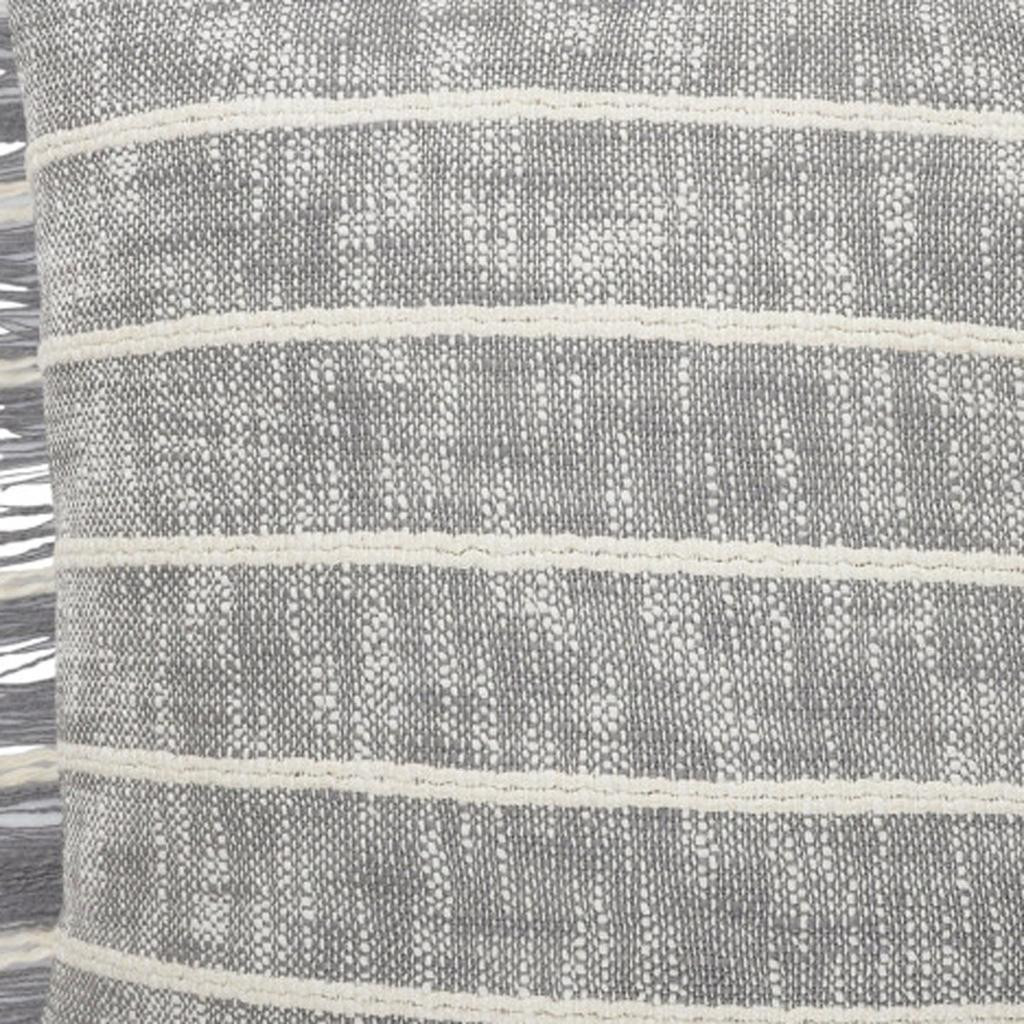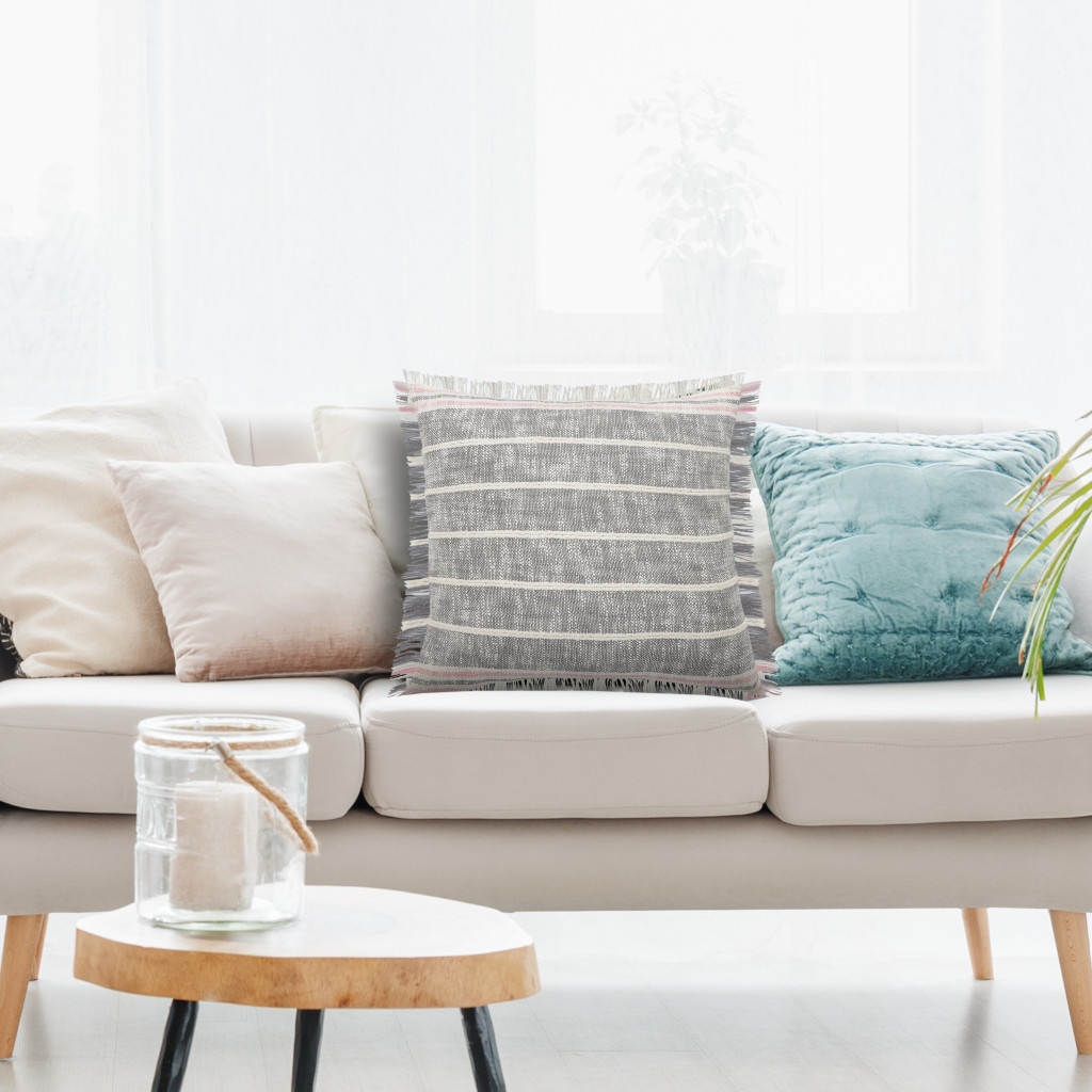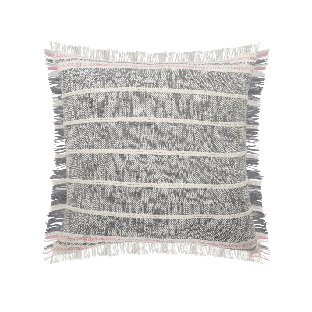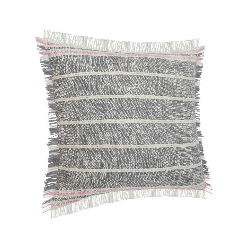 Bring a bit of fashion and zip to your space with this eye-catching and comfy 20-inch gray and pink striped cotton throw pillow cover. This soft and durable decorative pillow cover is expertly made of high grade, long lasting cotton in a gray and pink coloration. Decorative pillow covers are a great way to change up the look and feel of your space easily and quickly. Combine with your own fill or insert to add decoration and dimension to your favorite chair, accent your sofa, or to use as part of your bed ensemble. 20.00-inch h x 20.00-inch w x 0.50-inch d.