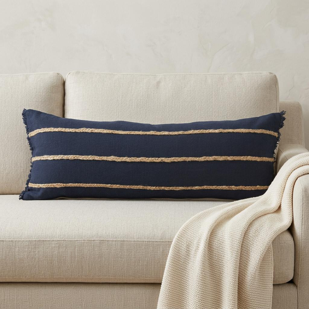 cotton blend throw pillow cover, striped cotton blend throw pillow, lumbar beach striped cotton blend, 14" X 36" blue brown lumbar beach, pillow cover fringe texture |