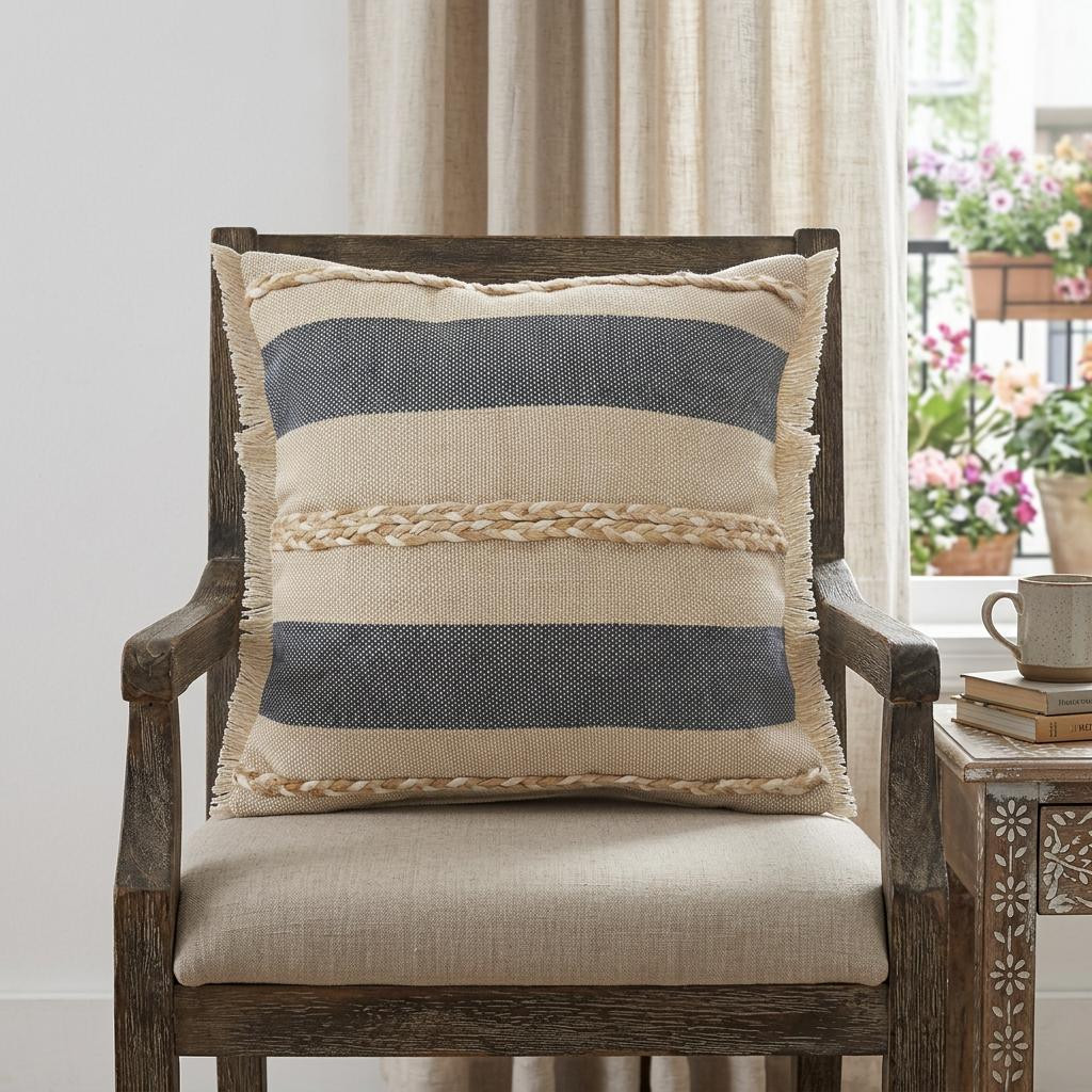 Unique and decorative, this comfortable 24-inch beige and blue beach striped cotton blend throw pillow cover with fringe and texture will leave a lasting impression. Durable beige and blue cotton blend has been used to give this pillow cover a beautiful look that will stand the test of time. Decorative pillow covers are a great way to change up the look and feel of your space easily and quickly. Combine with your own fill or insert to add decoration and dimension to your favorite chair, accent your sofa, or to use as part of your bed ensemble. 24.00-inch h x 24.00-inch w x 0.25-inch d.