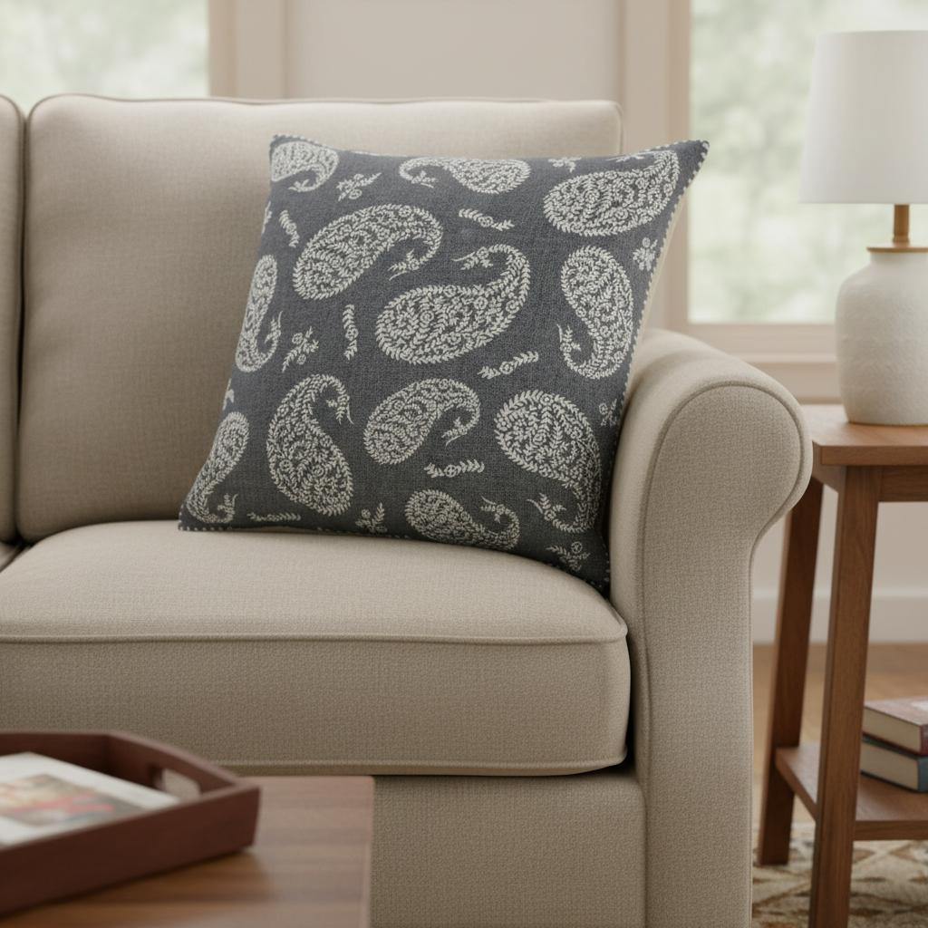 This 24-inch gray and white paisley cotton throw pillow cover will add a beautiful decorative accent to your decor. The gray and white coloring of the extremely durable and long lasting cotton pillow cover will add dimension and texture to your space. Decorative pillow covers are a great way to change up the look and feel of your space easily and quickly. Combine with your own fill or insert to add decoration and dimension to your favorite chair, accent your sofa, or to use as part of your bed ensemble. 24.00-inch h x 24.00-inch w x 0.50-inch d.