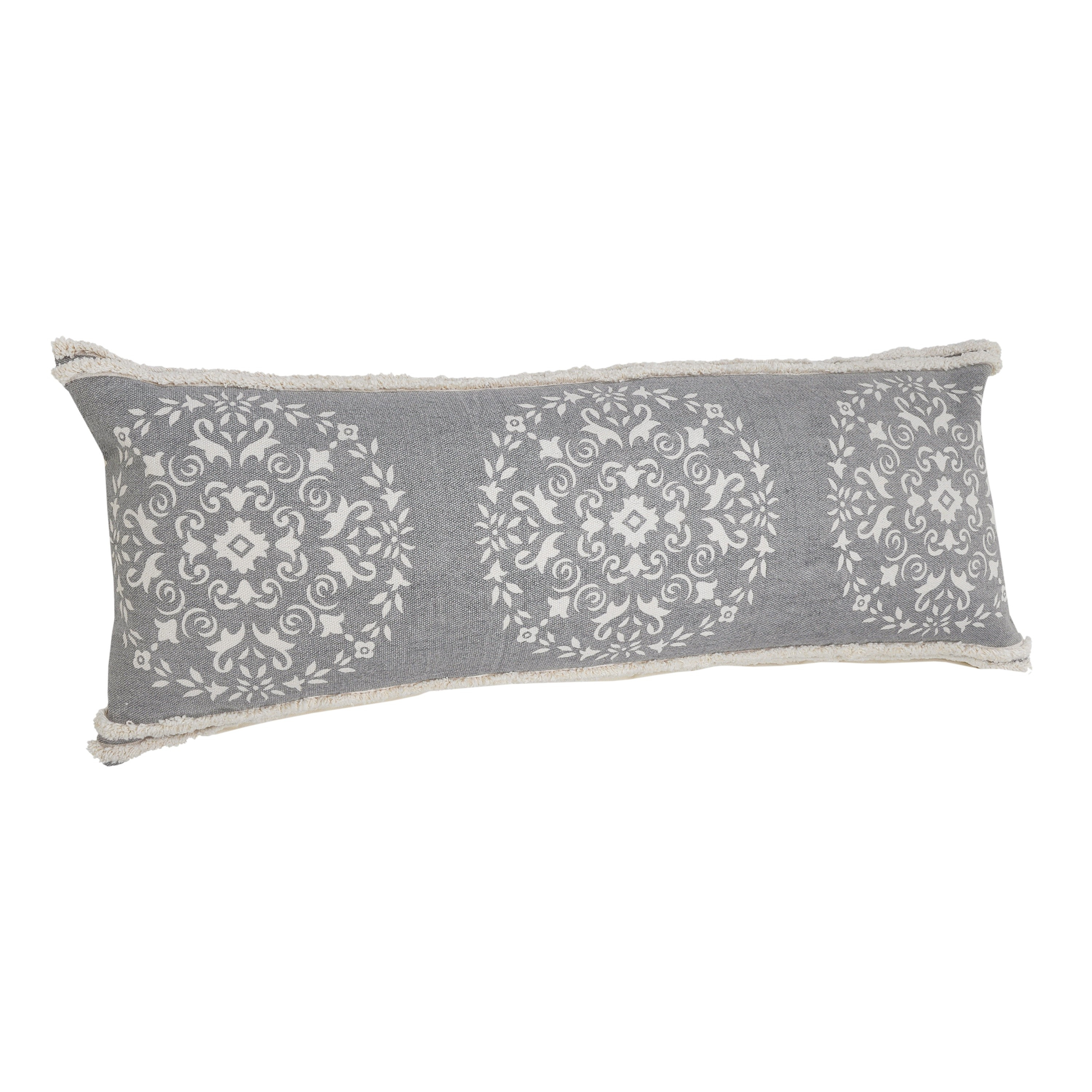 The 14-inch x 36-inch gray and white lumbar medallion cotton throw pillow cover is the perfect decorative accessory for your home. The gray and white coloring of the extremely durable and long lasting cotton pillow cover will add dimension and texture to your space. Decorative pillow covers are a great way to change up the look and feel of your space easily and quickly. Combine with your own fill or insert to add decoration and dimension to your favorite chair, accent your sofa, or to use as part of your bed ensemble. 14.00-inch h x 36.00-inch w x 0.50-inch d.