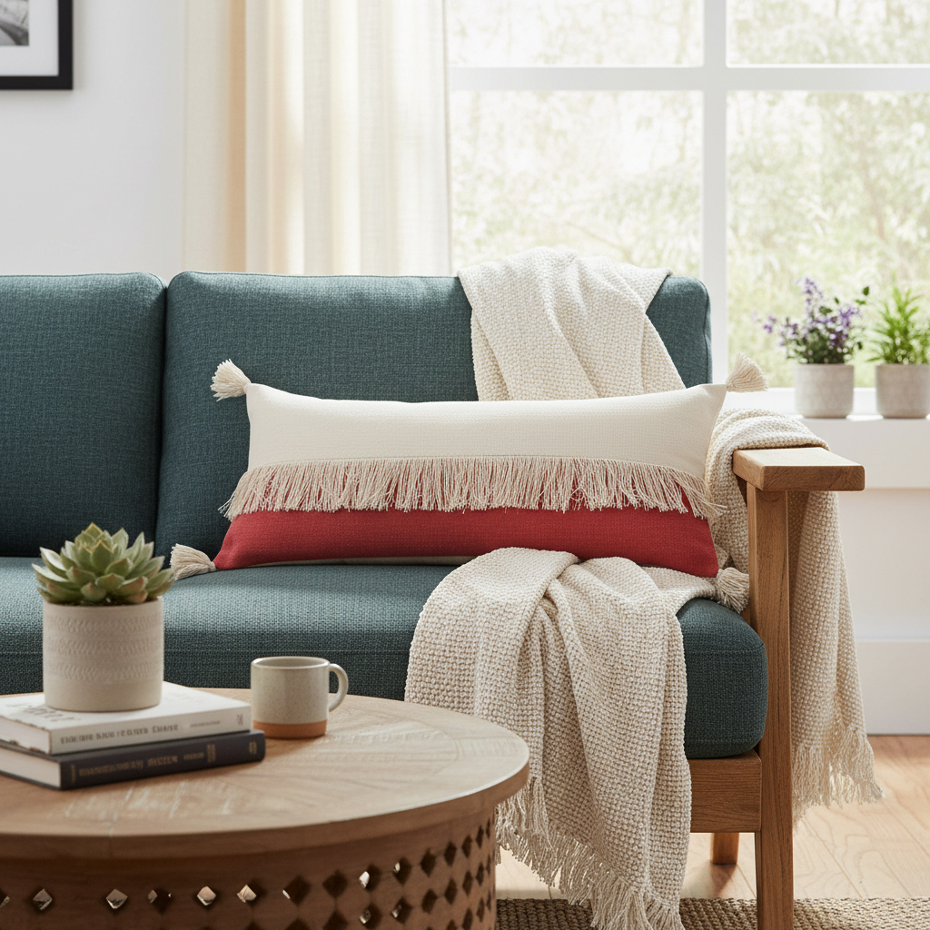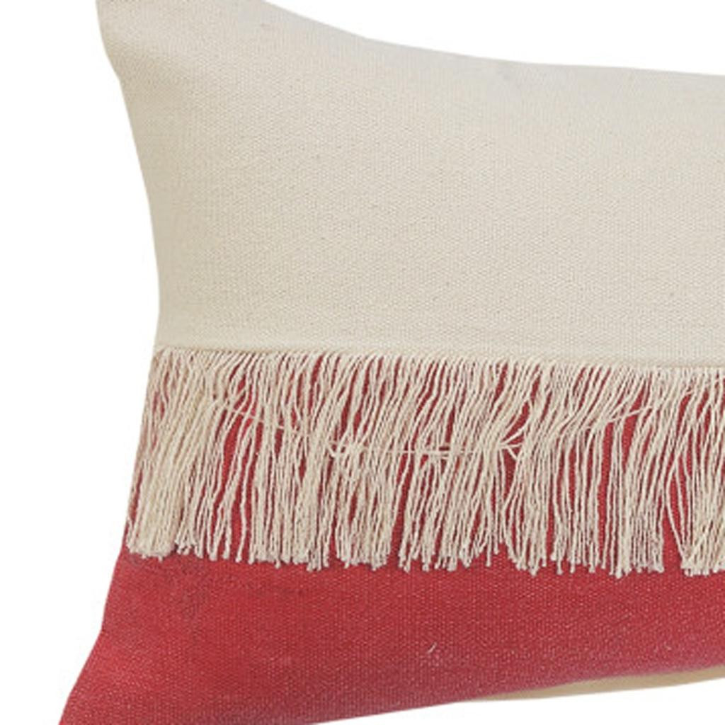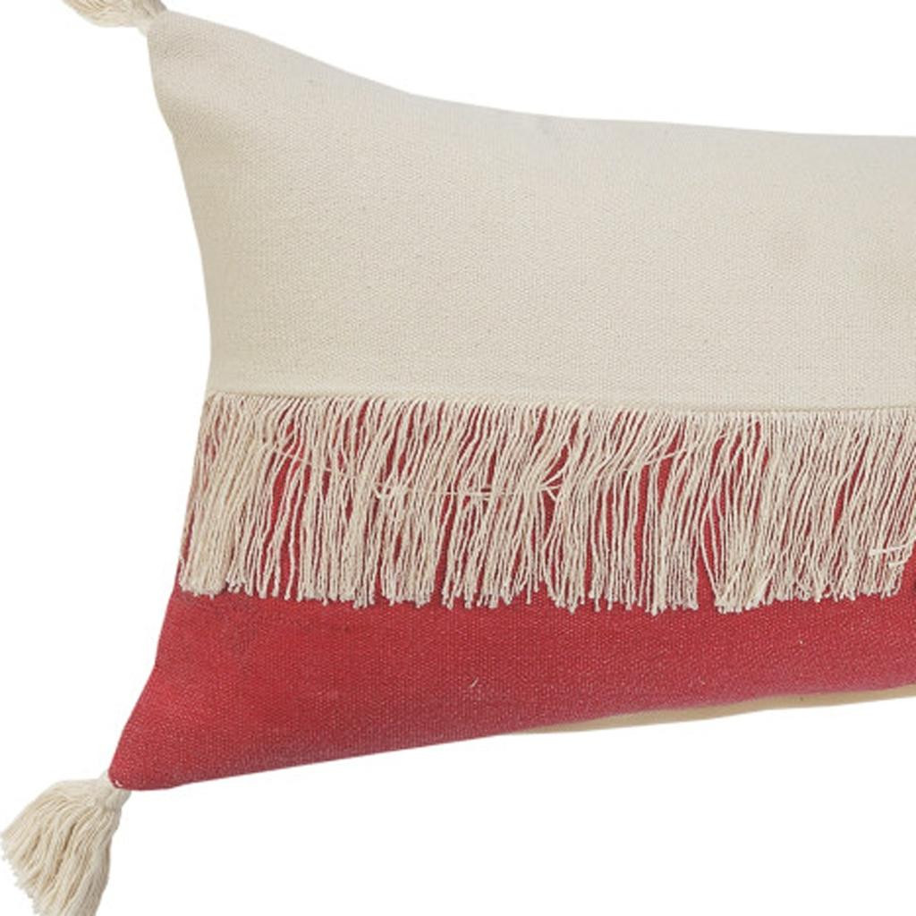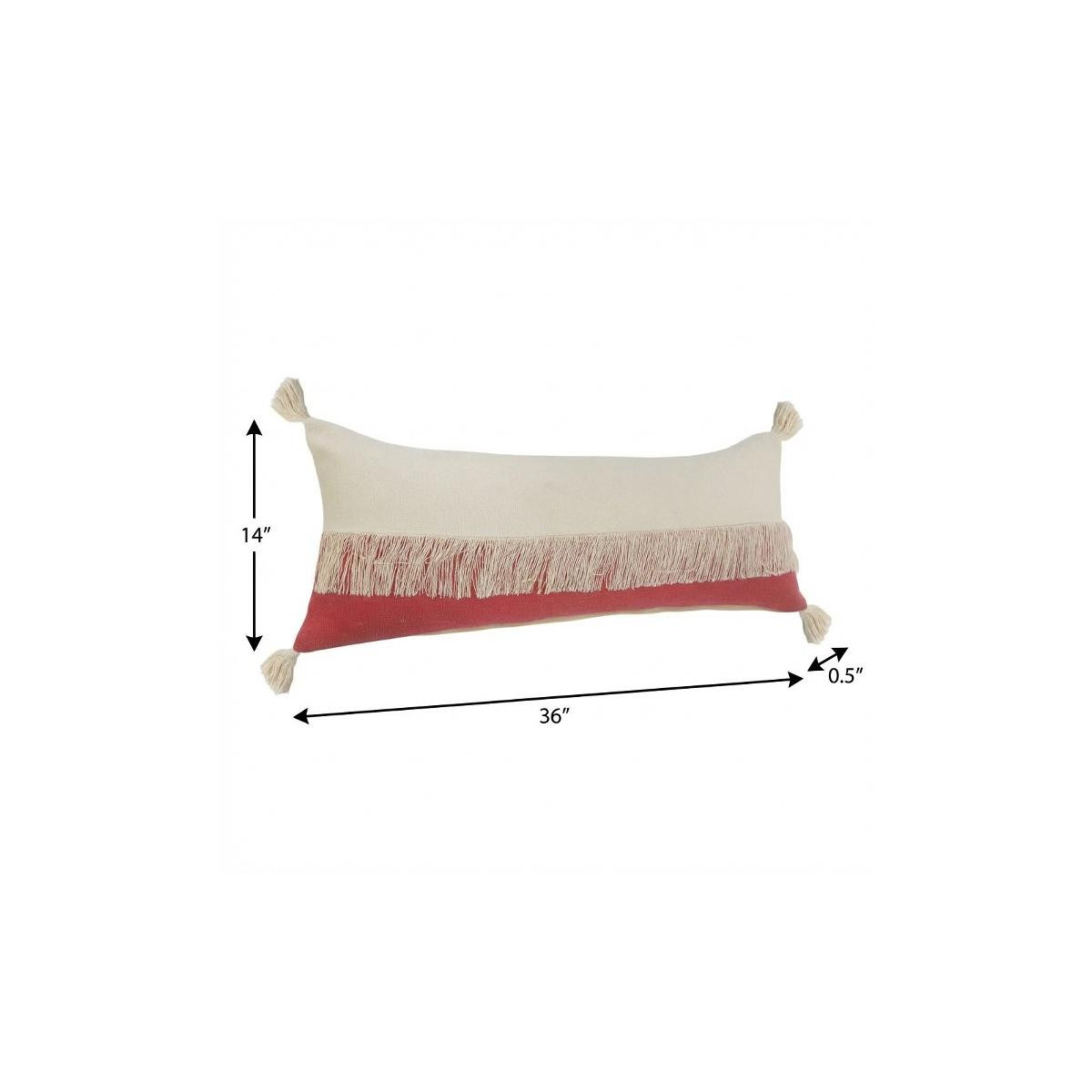 This 14-inch x 36-inch raspberry and off white lumbar beach cotton throw pillow cover with tassels will add a beautiful decorative accent to your decor. This soft and durable decorative pillow cover is expertly made of high grade, long lasting cotton in a raspberry and off white coloration. Charming decorative tassels give this design texture along with a hand-crafted look and feel. Decorative pillow covers are a great way to change up the look and feel of your space easily and quickly. Combine with your own fill or insert to add decoration and dimension to your favorite chair, accent your sofa, or to use as part of your bed ensemble. 14.00-inch h x 36.00-inch w x 0.50-inch d.