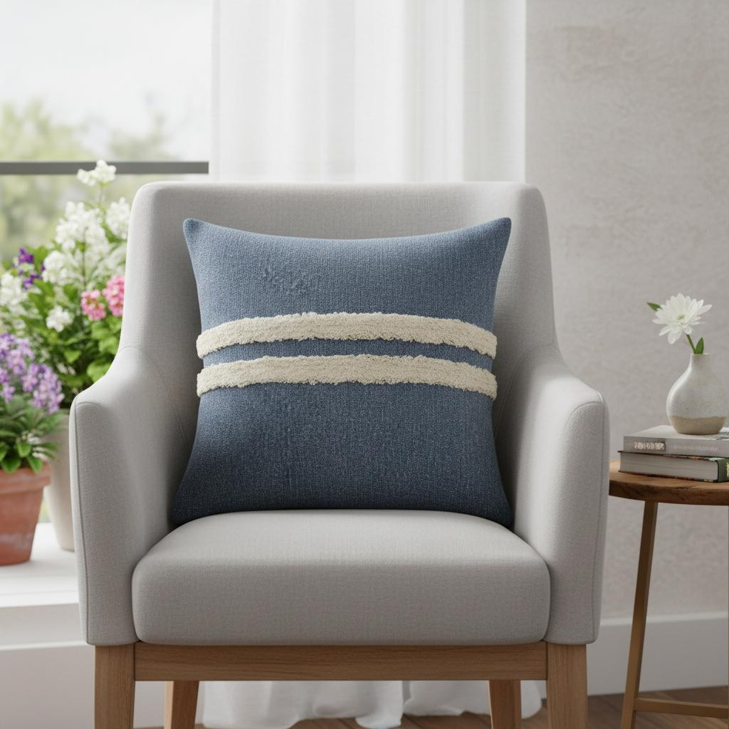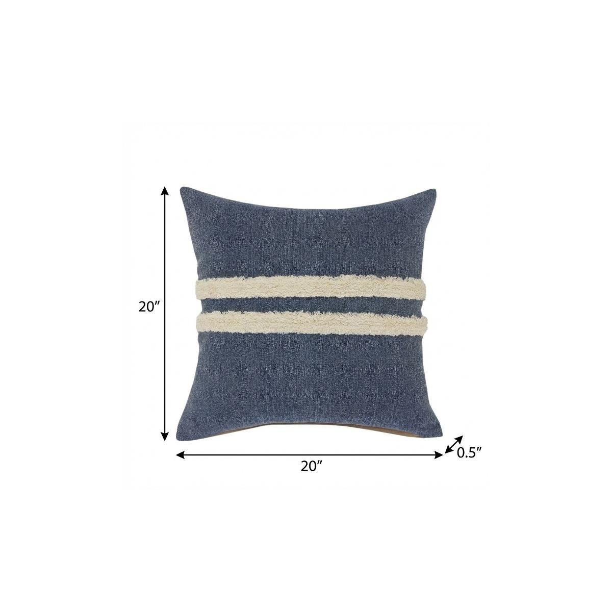 Add an air of fashion to your room and rejuvenate the space with this cute and fashionable 20-inch denim blue and ivory striped cotton throw pillow cover with applique. Durable denim blue and ivory cotton has been used to give this pillow cover a beautiful look that will stand the test of time. Pillow covers are a good idea for anyone that loves to decorate or accent their space with color and texture. Combine with your own fill or insert to add decoration and dimension to your favorite chair, accent your sofa, or to use as part of your bed ensemble. 20.00-inch h x 20.00-inch w x 0.50-inch d.