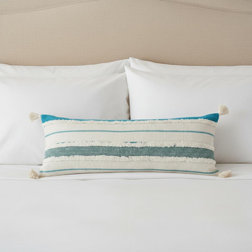 Unique and decorative, this comfortable 14-inch x 36-inch off white and turquoise lumbar beach striped cotton throw pillow cover with tassels will leave a lasting impression. This soft and durable decorative pillow cover is expertly made of high grade, long lasting cotton in a off white and turquoise coloration. Fun and decorative tassels add some high end and hand-crafted textural designer touches. Pillow covers are a good idea for anyone that loves to decorate or accent their space with color and texture. Combine with your own fill or insert to add decoration and dimension to your favorite chair, accent your sofa, or to use as part of your bed ensemble. 14.00-inch h x 36.00-inch w x 0.50-inch d.