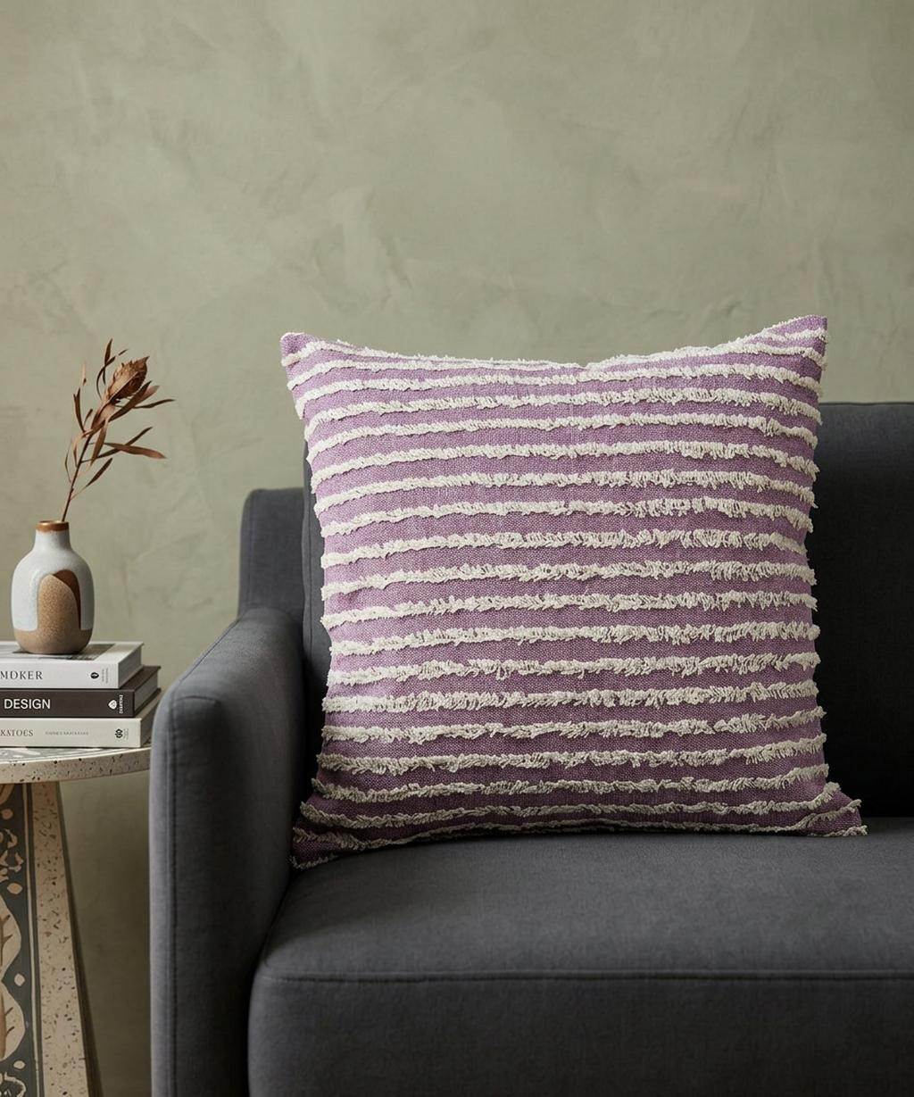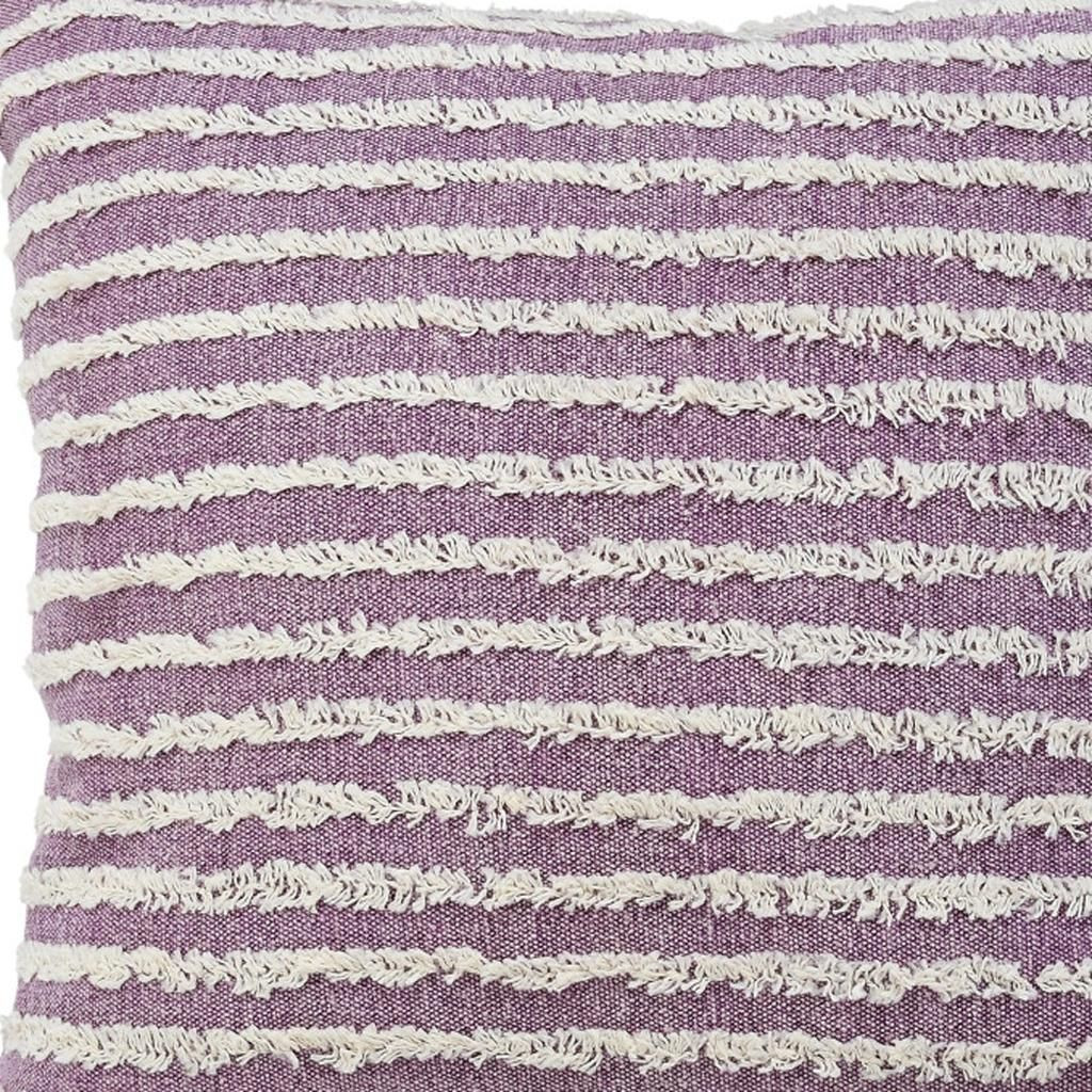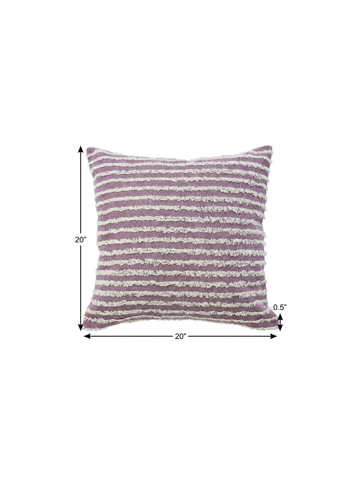 This 20-inch lavender and off white striped cotton throw pillow cover with tufts will add a beautiful decorative accent to your decor. The lavender and off white coloring of the extremely durable and long lasting cotton pillow cover will add dimension and texture to your space. Charming decorative tufts give this design texture along with a hand-crafted look and feel. Decorative pillow covers are a great way to change up the look and feel of your space easily and quickly. Combine with your own fill or insert to add decoration and dimension to your favorite chair, accent your sofa, or to use as part of your bed ensemble. 20.00-inch h x 20.00-inch w x 0.50-inch d.