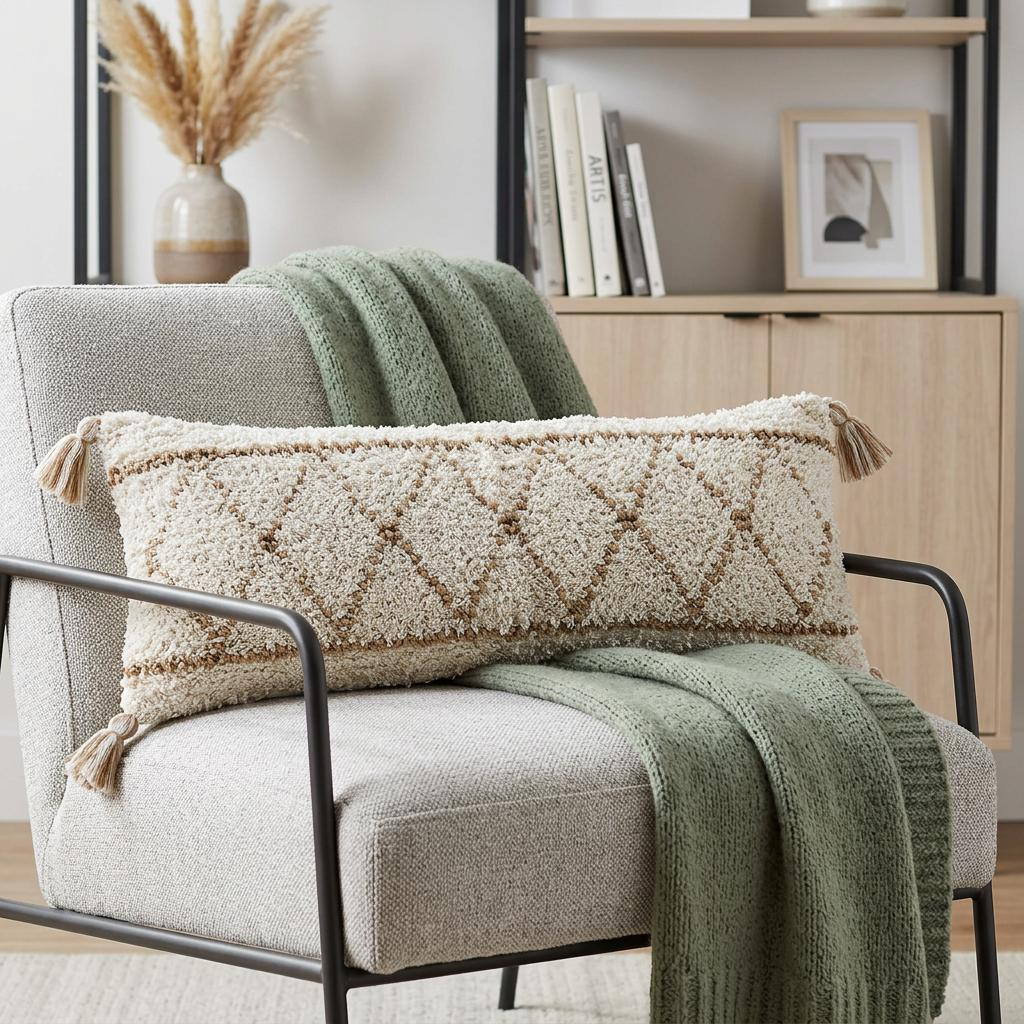 pillow cover tassels, shag throw pillow cover tassels, beige ivory lumbar geometric jute, jute shag throw pillow cover, 14" X 36" beige ivory |
