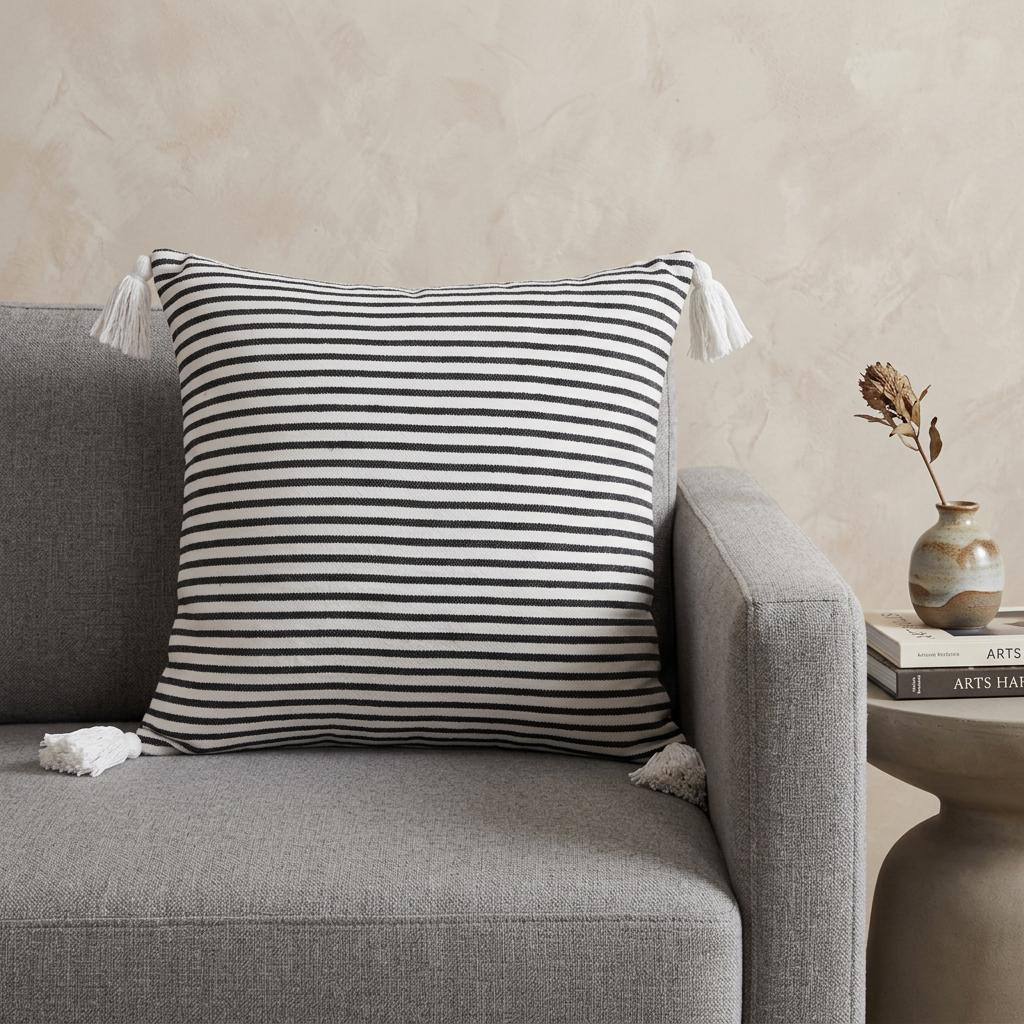 Unique and decorative, this comfortable 20-inch black and white striped cotton throw pillow cover with tassels will leave a lasting impression. This black and white colored decorative pillow cover is made from high grade cotton that is durable and long lasting. Fun and decorative tassels add some high end and hand-crafted textural designer touches. Pillow covers are a good idea for anyone that loves to decorate or accent their space with color and texture. Combine with your own fill or insert to add decoration and dimension to your favorite chair, accent your sofa, or to use as part of your bed ensemble. 20.00-inch h x 20.00-inch w x 0.50-inch d.