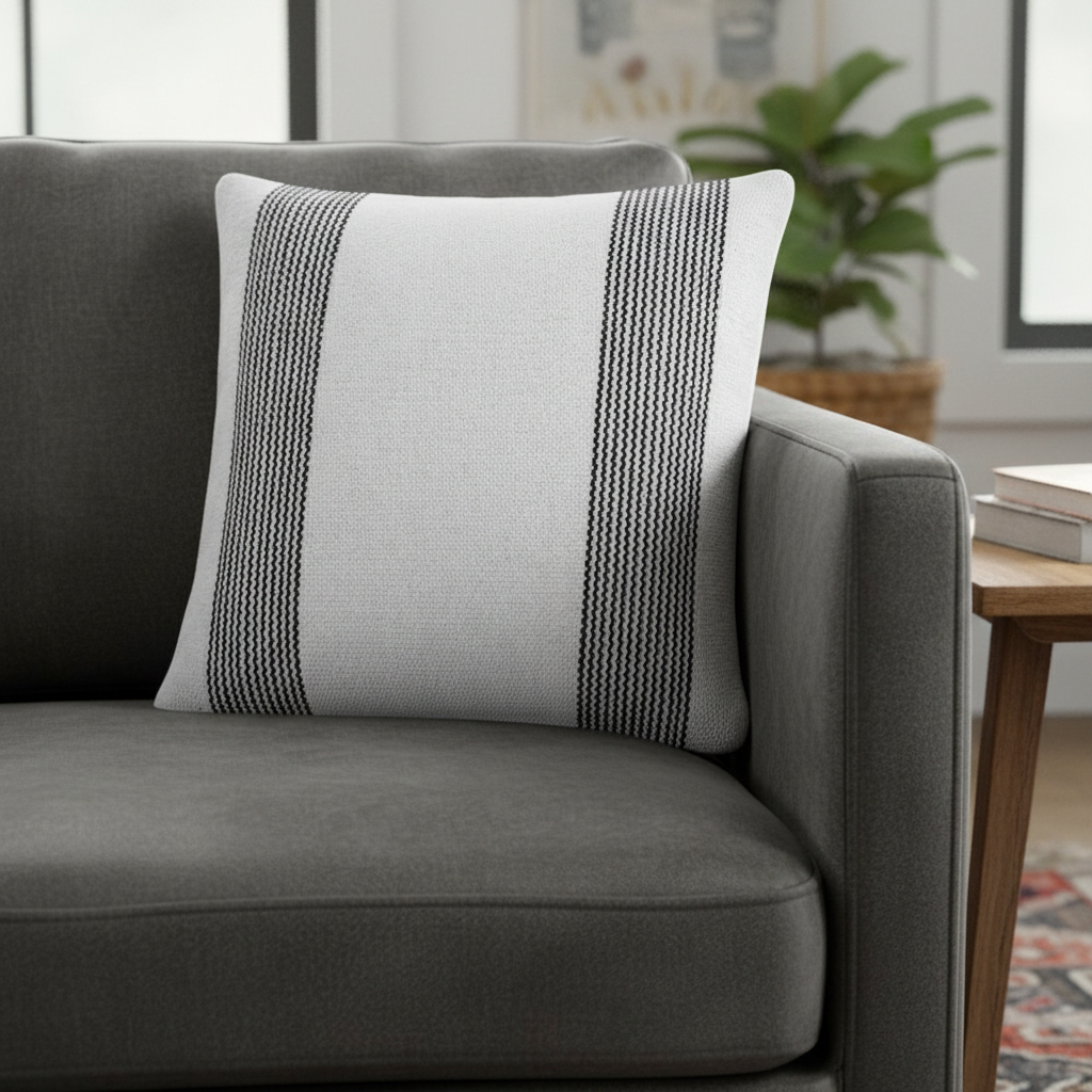 The perfect complement to your sofa, favorite chair, or bed, this 20-inch white and black beach striped cotton throw pillow cover is a great decorative accent. This white and black hued, accent pillow cover, represents quality construction, expertly made from durable cotton that is not only long lasting but soft to the touch as well. Pillow covers are a good idea for anyone that loves to decorate or accent their space with color and texture. Combine with your own fill or insert to add decoration and dimension to your favorite chair, accent your sofa, or to use as part of your bed ensemble. 20.00-inch h x 20.00-inch w x 0.50-inch d.