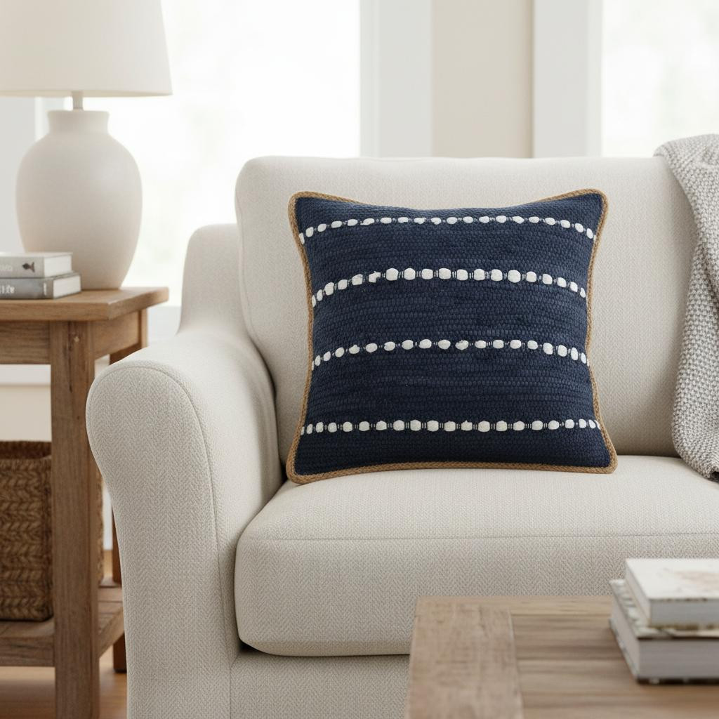 Add an air of fashion to your room and rejuvenate the space with this cute and fashionable 20-inch navy blue and white beach striped cotton blend throw pillow cover. The navy blue and white coloring of the extremely durable and long lasting cotton blend pillow cover will add dimension and texture to your space. Decorative pillow covers are a great way to change up the look and feel of your space easily and quickly. Combine with your own fill or insert to add decoration and dimension to your favorite chair, accent your sofa, or to use as part of your bed ensemble. 20.00-inch h x 20.00-inch w x 0.50-inch d.