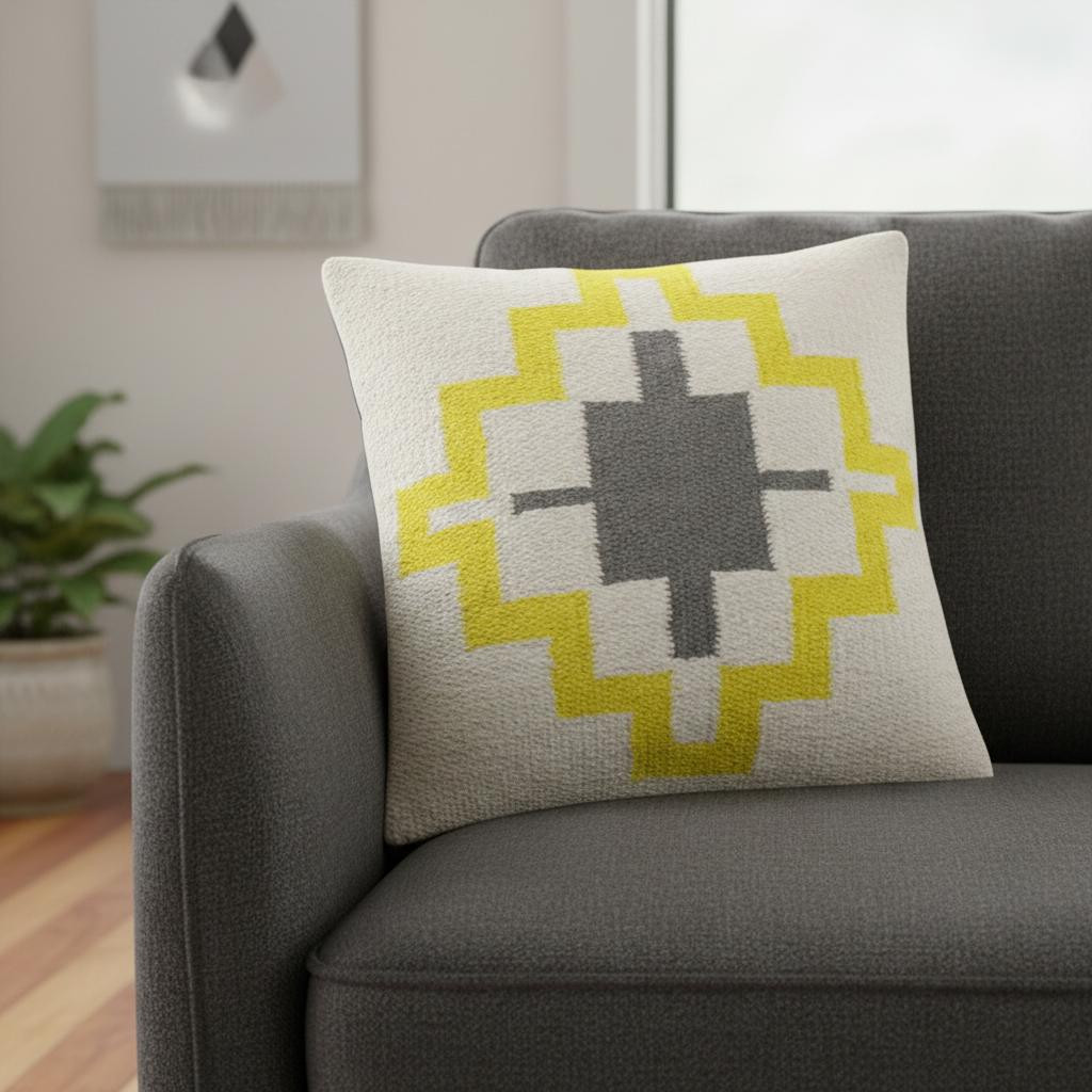 This 20-inch gray white and yellow geometric cotton throw pillow cover will add a beautiful decorative accent to your decor. Durable gray, white, and yellow cotton has been used to give this pillow cover a beautiful look that will stand the test of time. Decorative pillow covers are a great way to change up the look and feel of your space easily and quickly. Combine with your own fill or insert to add decoration and dimension to your favorite chair, accent your sofa, or to use as part of your bed ensemble. 20.00-inch h x 20.00-inch w x 0.50-inch d.