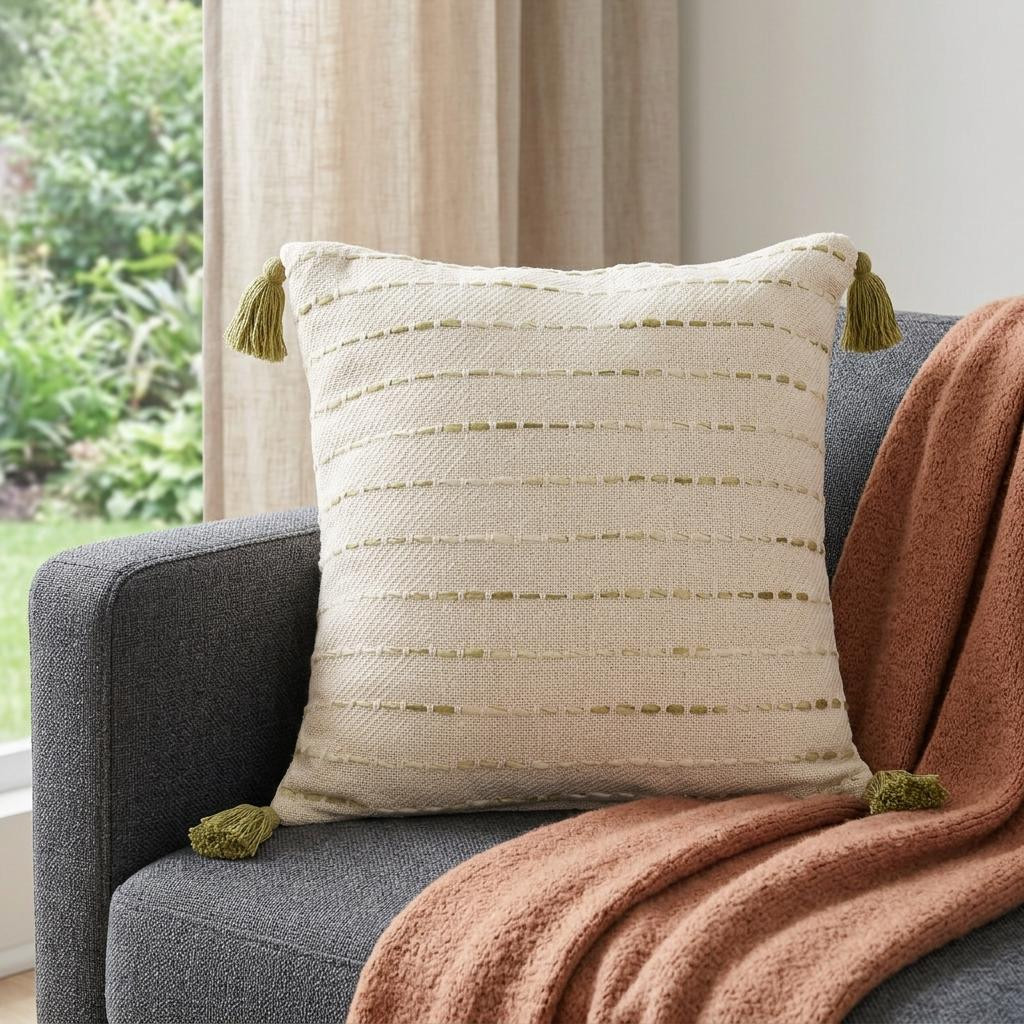 This 20-inch green and ivory striped cotton blend throw pillow cover with tassels will add a beautiful decorative accent to your decor. The green and ivory coloring of the extremely durable and long lasting cotton blend pillow cover will add dimension and texture to your space. Charming decorative tassels give this design texture along with a hand-crafted look and feel. Pillow covers are a good idea for anyone that loves to decorate or accent their space with color and texture. Combine with your own fill or insert to add decoration and dimension to your favorite chair, accent your sofa, or to use as part of your bed ensemble. 20.00-inch h x 20.00-inch w x 0.25-inch d.