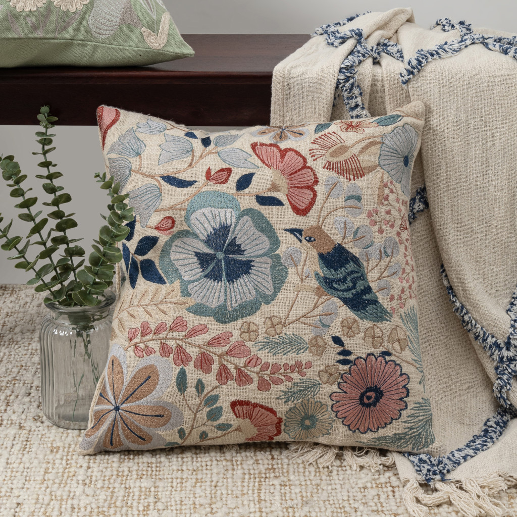 Add an air of fashion to your room and rejuvenate the space with this cute and fashionable 20-inch ivory blue and pink floral cotton throw pillow cover. The ivory, blue, and pink coloring of the extremely durable and long lasting cotton pillow cover will add dimension and texture to your space. Pillow covers are a good idea for anyone that loves to decorate or accent their space with color and texture. Combine with your own fill or insert to add decoration and dimension to your favorite chair, accent your sofa, or to use as part of your bed ensemble. 20.00-inch h x 20.00-inch w x 0.25-inch d.