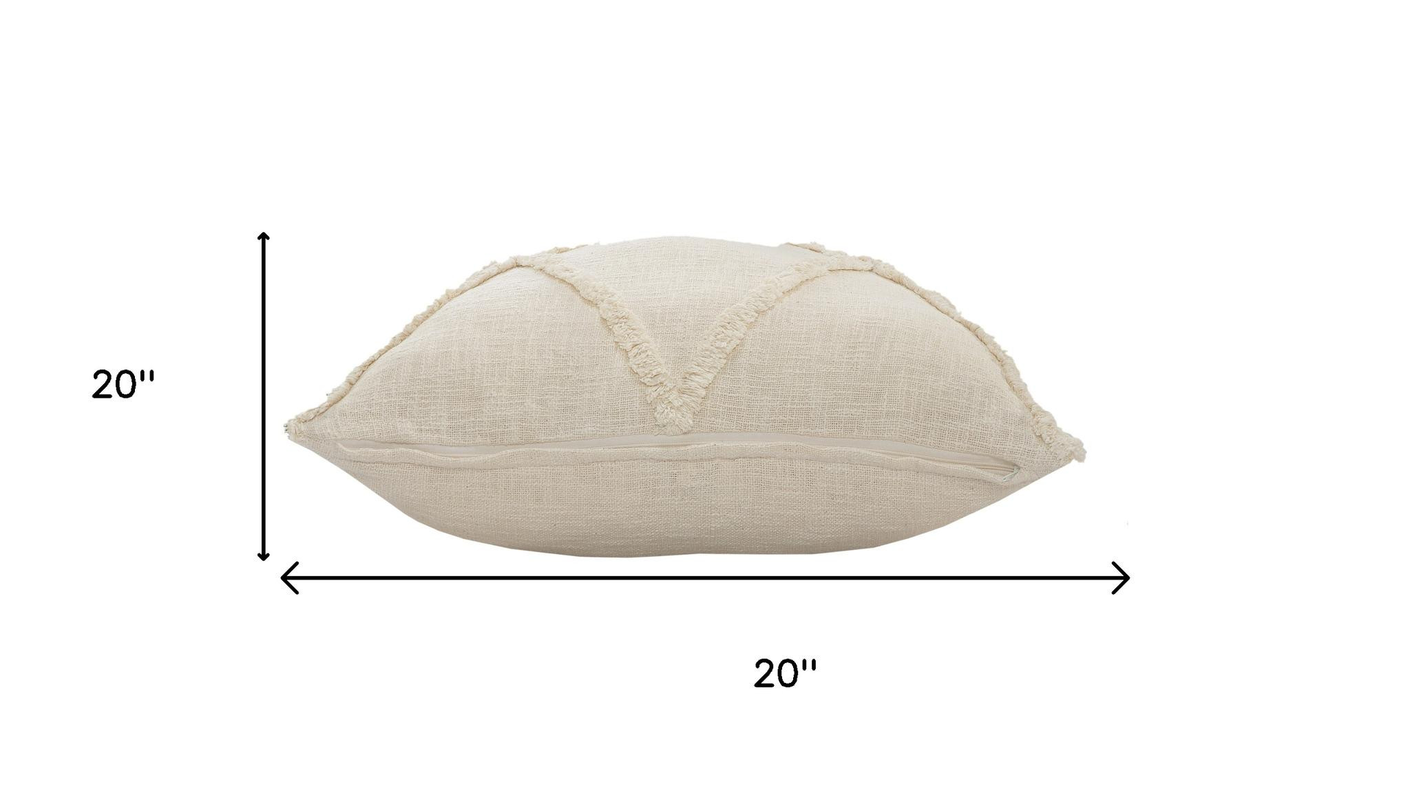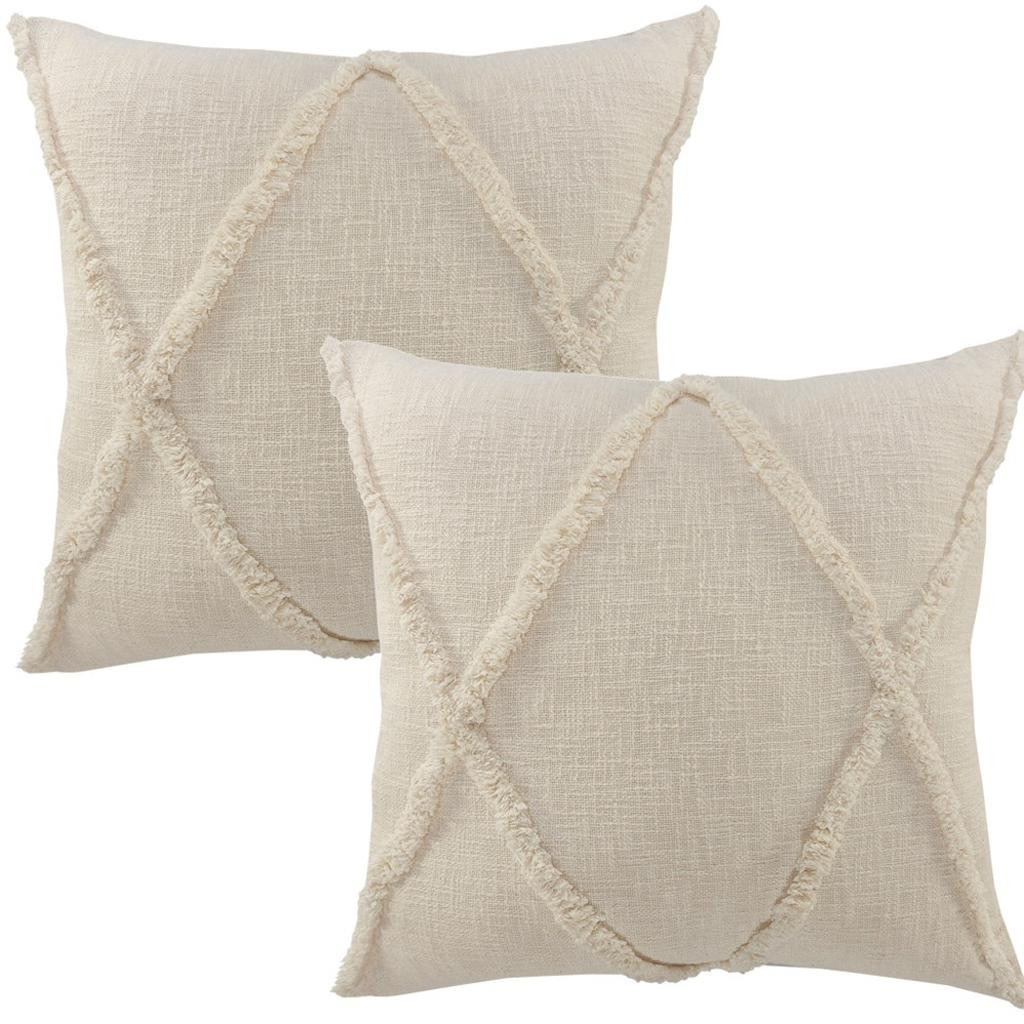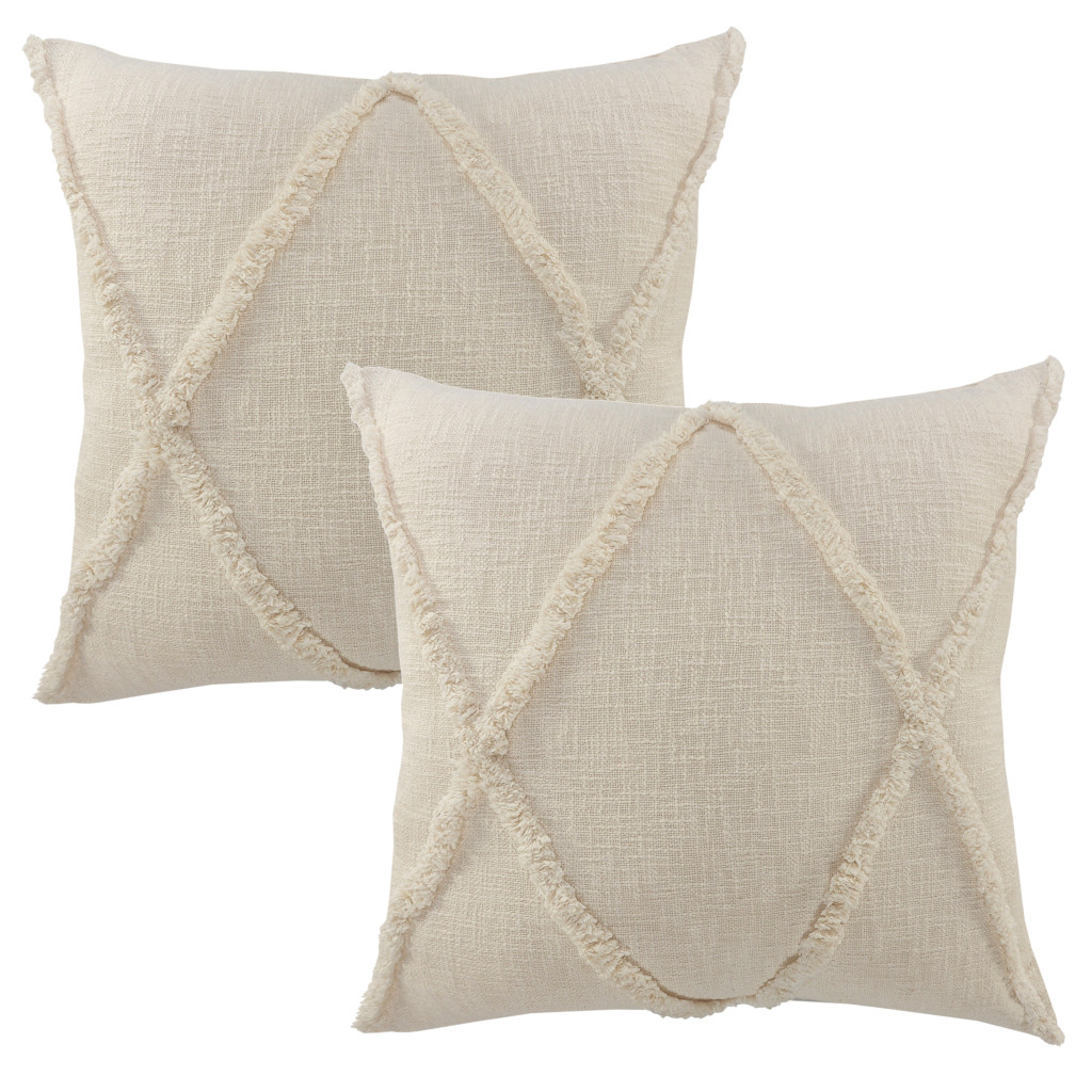 Add an air of fashion to your room and rejuvenate the space with this cute and fashionable set of two 20-inch beige and cream diamond cotton throw pillows. The beige and cream coloring of the extremely durable and long lasting cotton pillows will add dimension and texture to your space. Super soft and built to hold its shape, this polyester-filled pillow is a great option. Great to use on its own or mix with other decorations for the perfect look. Decorative throw pillows not only add color and dimension to your space but can be comfy and supportive when you are lounging and cuddling as well. 20.00-inch h x 20.00-inch w x 0.50-inch d.