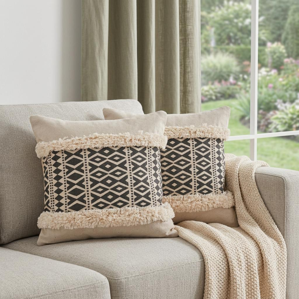 This set of two 18-inch black and natural abstract cotton throw pillows with tufts will add a beautiful decorative accent to your decor. These great looking soft decorative pillows are expertly made of durable and long lasting cotton in a black and natural coloration. Charming decorative tufts give this design texture along with a hand-crafted look and feel. Super soft and built to hold its shape, this polyfill-filled pillow is a great option. Decorative pillows are a great way to change up the look and feel of your space easily and quickly. A great decorative accessory to add color and dimension to your favorite chair, accent your sofa, or to use as part of your bed ensemble. 18.00-inch h x 18.00-inch w x 4.00-inch d.