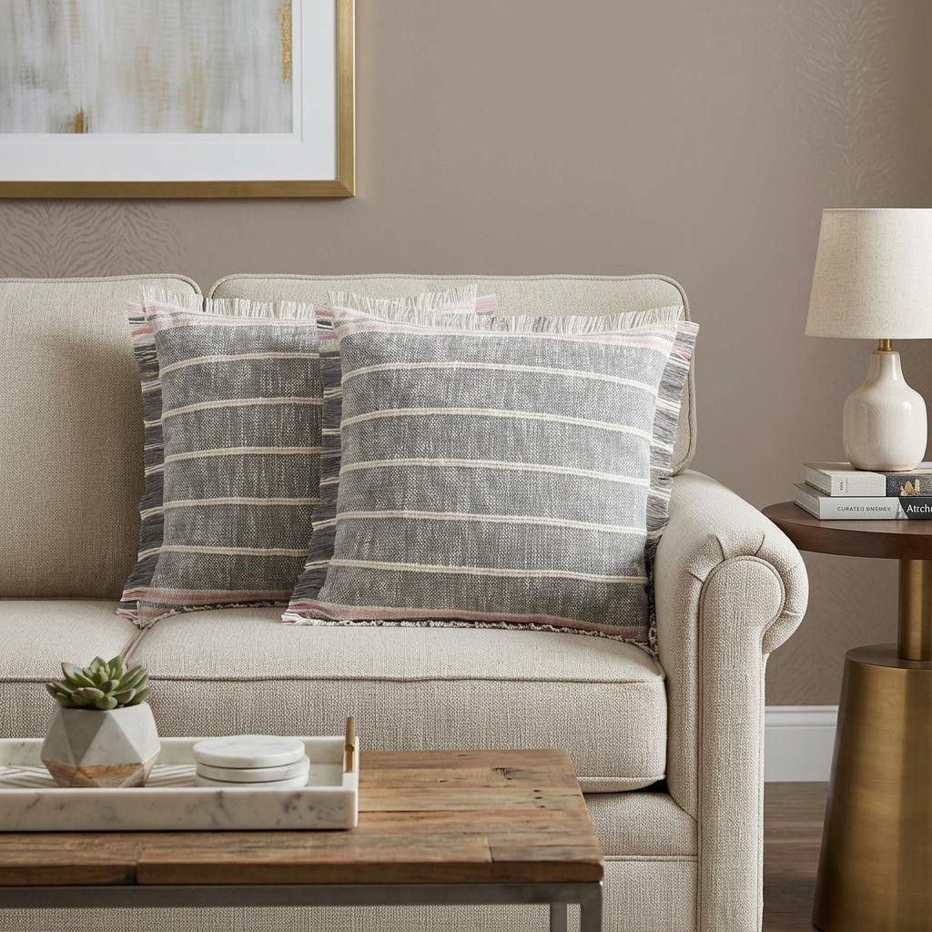 The set of two 20-inch gray and pink striped cotton throw pillows with fringe is the perfect decorative accessory for your home. Ultra durable gray and pink cotton has been used to make this decorative pillow set a beautiful look that will stand the test of time. This soft polyfill filled pillow not only is decorative but made to be comfy and cozy all day long. Great to use on its own or mix with other decorations for the perfect look. Decorative throw pillows not only add color and dimension to your space but can be comfy and supportive when you are lounging and cuddling as well. 20.00-inch h x 20.00-inch w x 0.50-inch d.