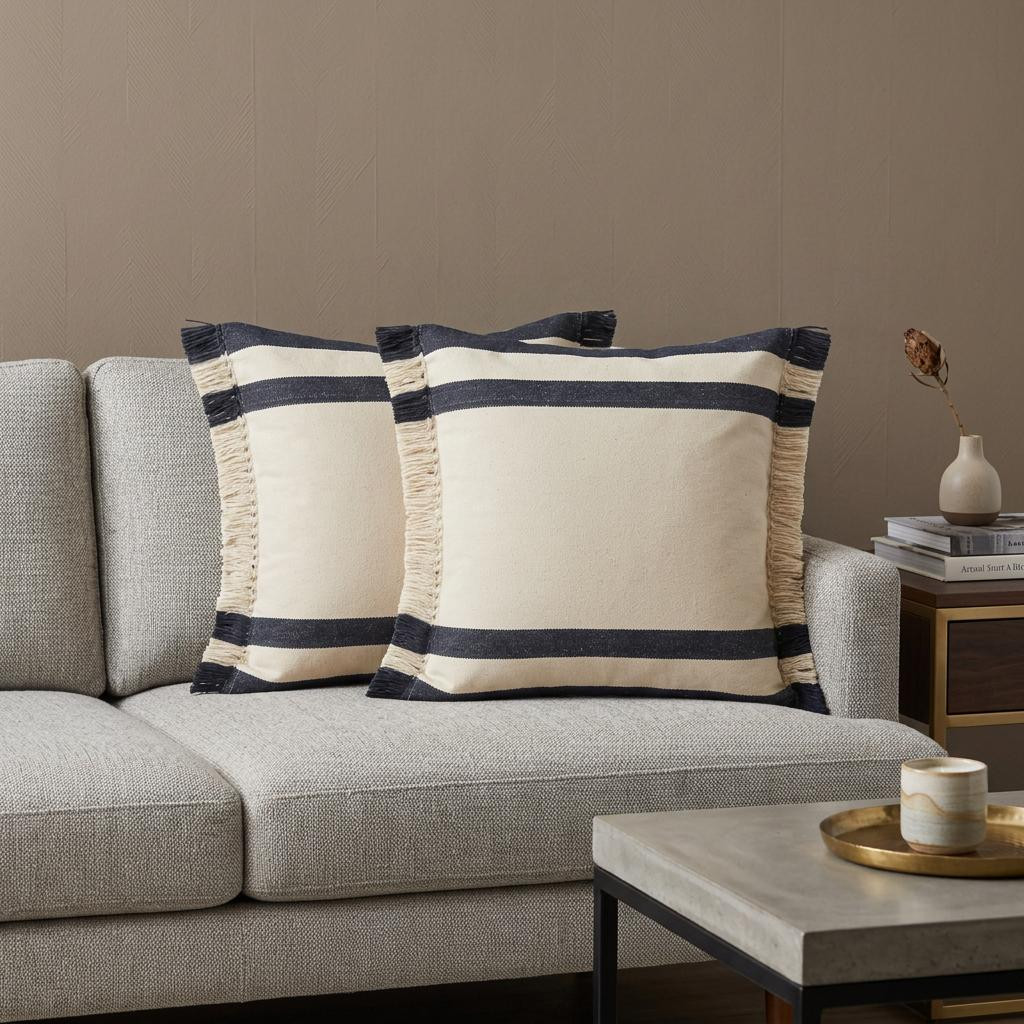 The set of two 20-inch blue and white striped cotton throw pillows with fringe is the perfect decorative accessory for your home. The blue and white coloring of the extremely durable and long lasting cotton pillows will add dimension and texture to your space. Super soft and built to hold its shape, this polyfill-filled pillow is a great option. Decorative pillows are a great way to change up the look and feel of your space easily and quickly. Decorative throw pillows not only add color and dimension to your space but can be comfy and supportive when you are lounging and cuddling as well. 20.00-inch h x 20.00-inch w x 0.50-inch d.