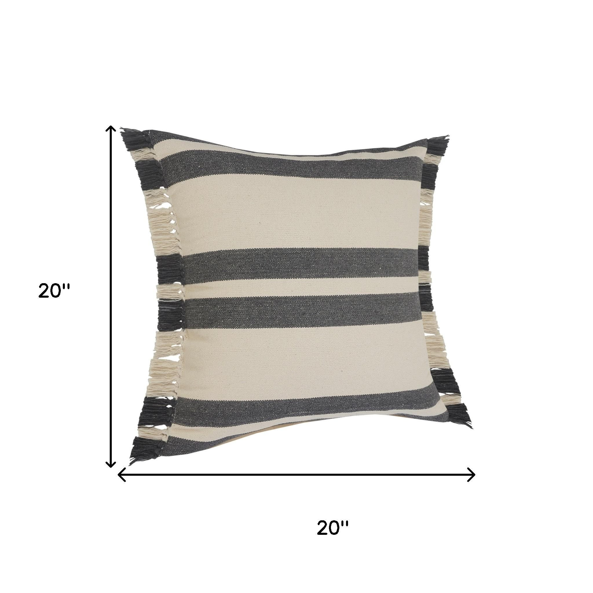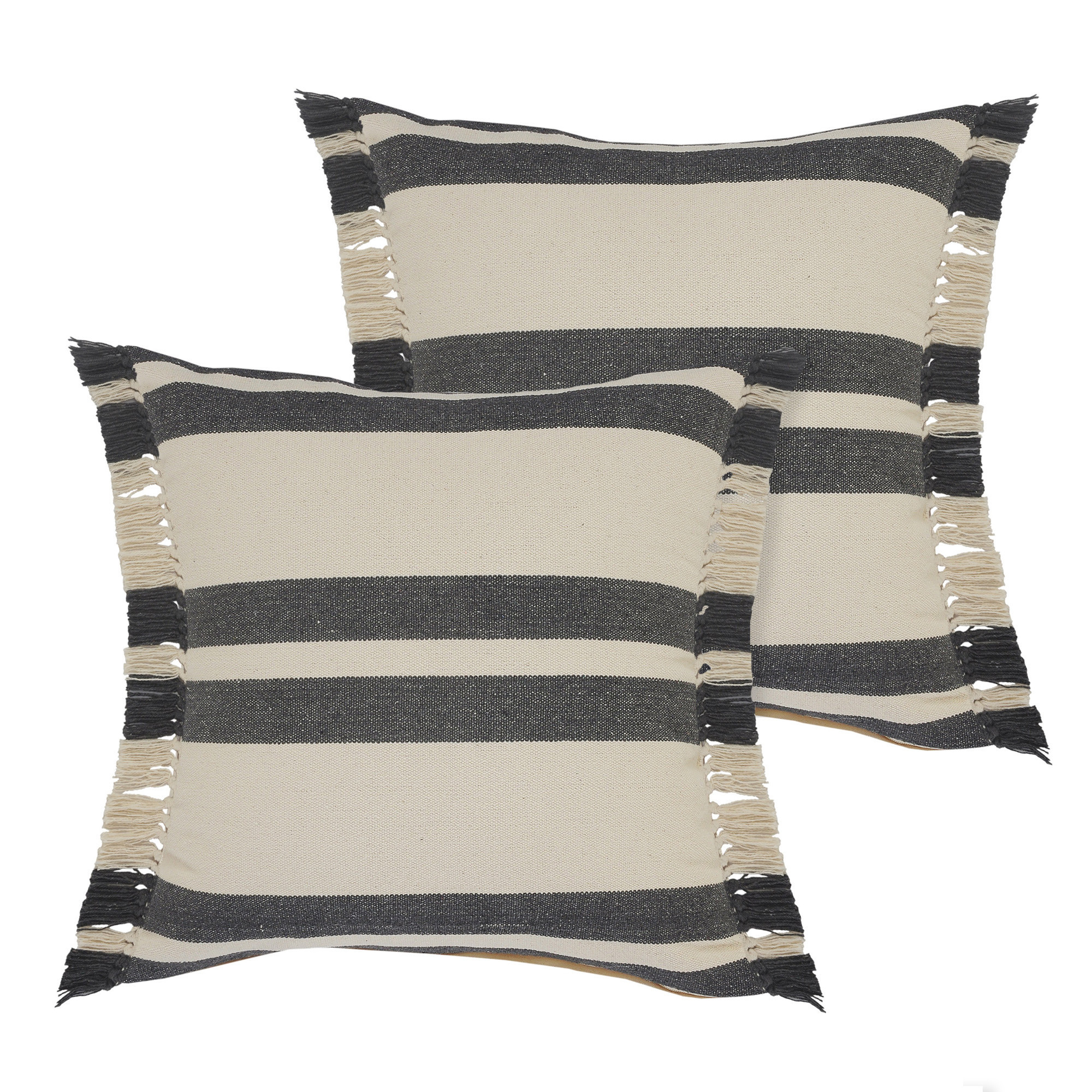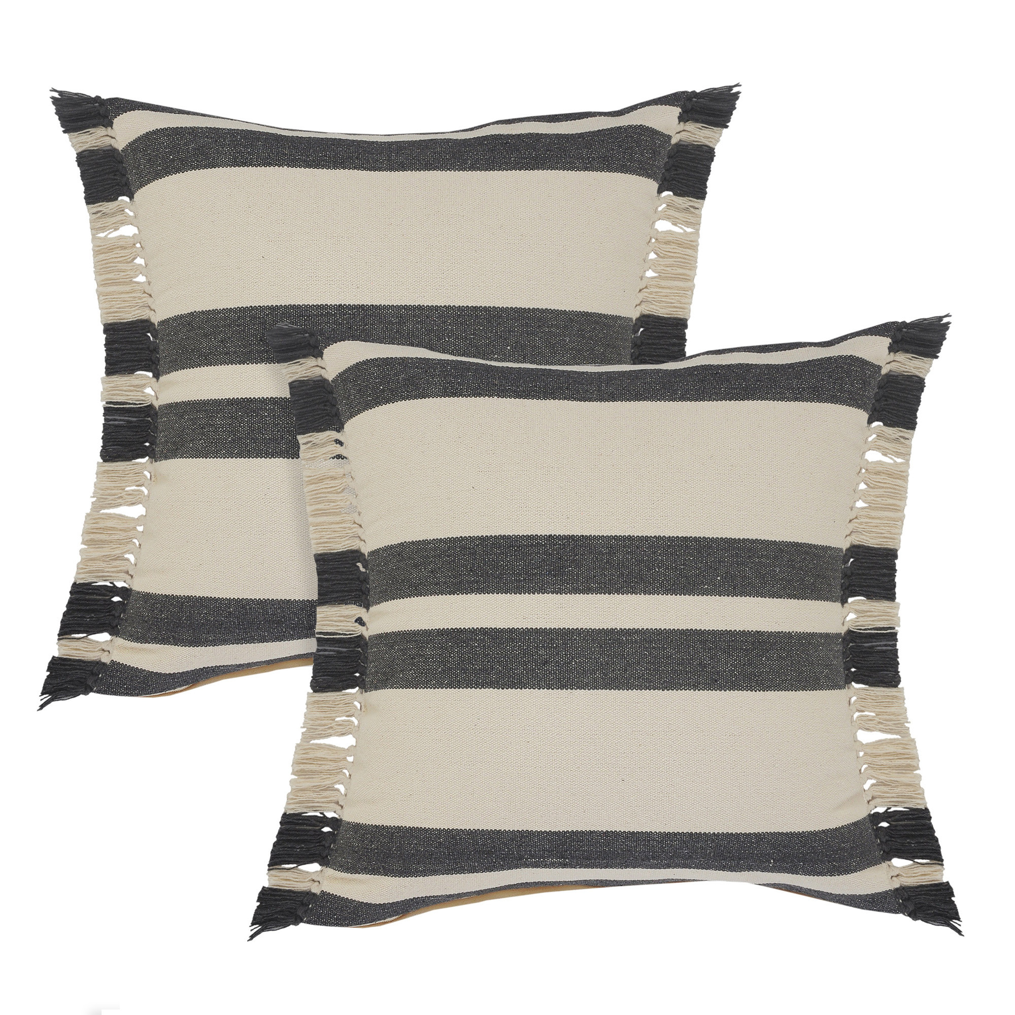 The perfect complement to your sofa, favorite chair, or bed, this set of two 20-inch gray and white striped cotton throw pillows is a great decorative accent. The gray and white coloring of the extremely durable and long lasting cotton pillows will add dimension and texture to your space. This soft polyester filled pillow not only is decorative but made to be comfy and cozy all day long. Great to use on its own or mix with other decorations for the perfect look. Decorative throw pillows not only add color and dimension to your space but can be comfy and supportive when you are lounging and cuddling as well. 20.00-inch h x 20.00-inch w x 0.50-inch d.