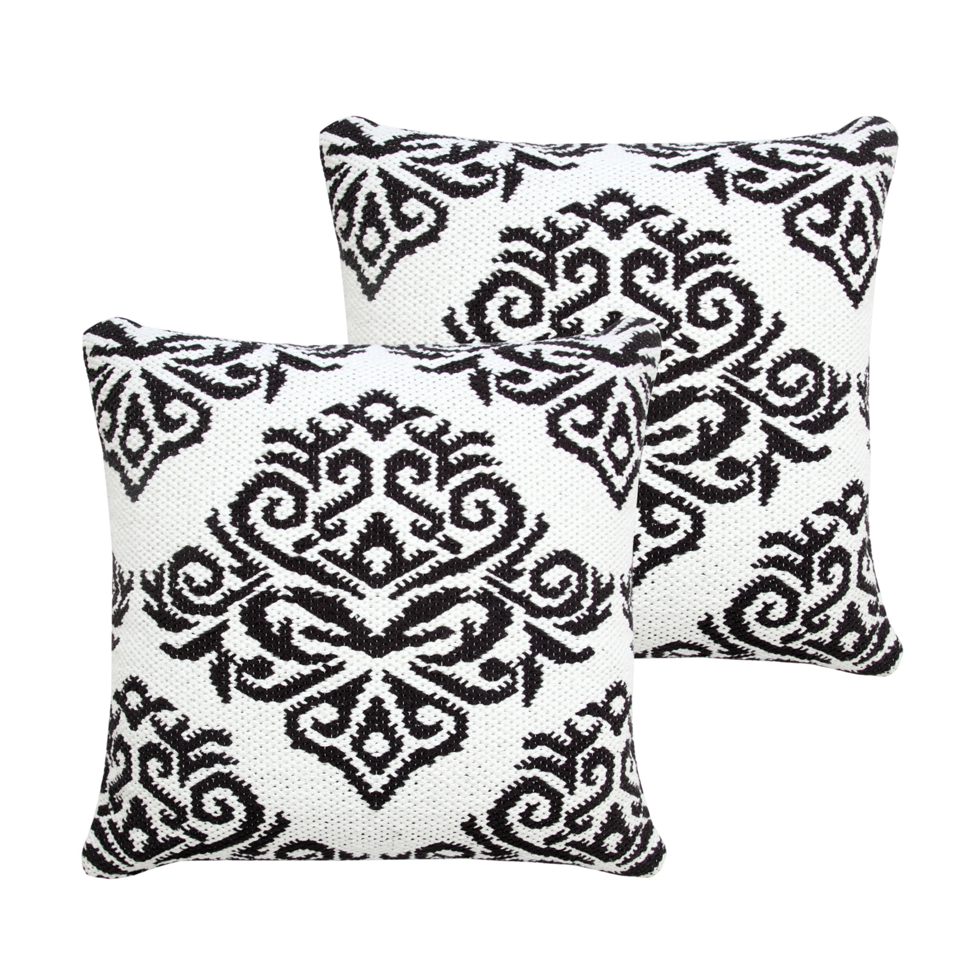 Unique and decorative, this comfortable set of two 20-inch white and black damask cotton blend throw pillows will leave a lasting impression. Ultra durable white and black cotton blend has been used to make this decorative pillow set a beautiful look that will stand the test of time. Super soft and built to hold its shape, this polyester-filled pillow is a great option. For anyone that loves to decorate or accent their space with color and texture. Decorative throw pillows not only add color and dimension to your space but can be comfy and supportive when you are lounging and cuddling as well. 20.00-inch h x 20.00-inch w x 4.00-inch d.