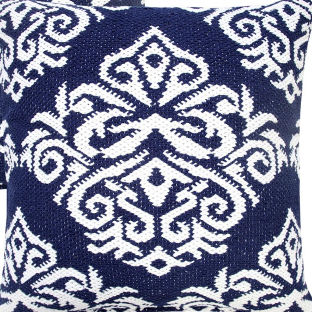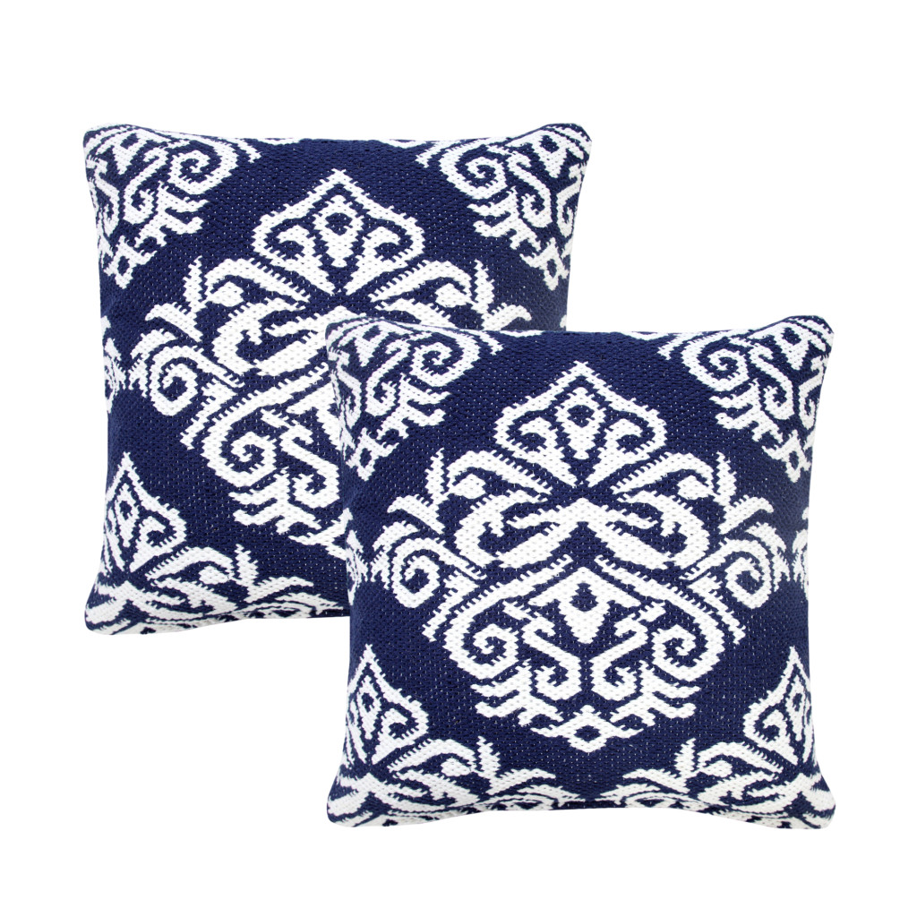 The perfect complement to your sofa, favorite chair, or bed, this set of two 20-inch blue and white damask cotton blend throw pillows is a great decorative accent. These great looking soft decorative pillows are expertly made of durable and long lasting cotton blend in a blue and white coloration. This soft polyester filled pillow not only is decorative but made to be comfy and cozy all day long. Great to use on its own or mix with other decorations for the perfect look. A great decorative accessory to add color and dimension to your favorite chair, accent your sofa, or to use as part of your bed ensemble. 20.00-inch h x 20.00-inch w x 4.00-inch d.