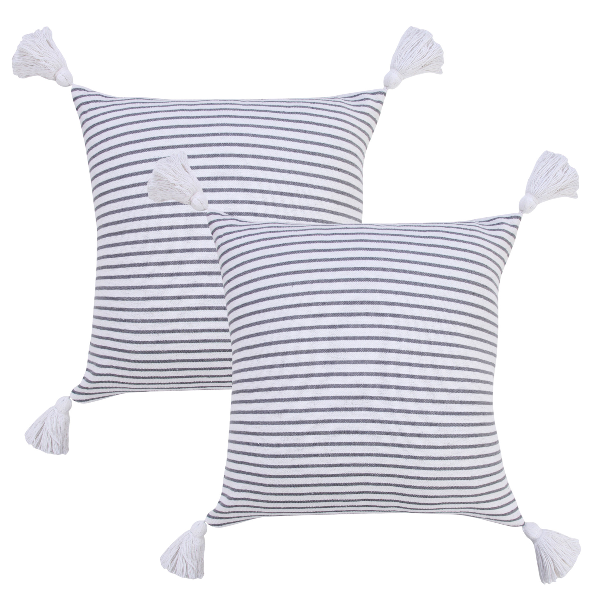 Bring a bit of fashion and zip to your space with this eye-catching and comfy set of two 20-inch gray and white striped cotton throw pillows. These gray and white hued pillows represent quality construction, expertly made from durable cotton that is not only long lasting but super soft to the touch as well. This soft polyester filled pillow not only is decorative but made to be comfy and cozy all day long. Great to use on its own or mix with other decorations for the perfect look. A great decorative accessory to add color and dimension to your favorite chair, accent your sofa, or to use as part of your bed ensemble. 20.00-inch h x 20.00-inch w x 4.00-inch d.