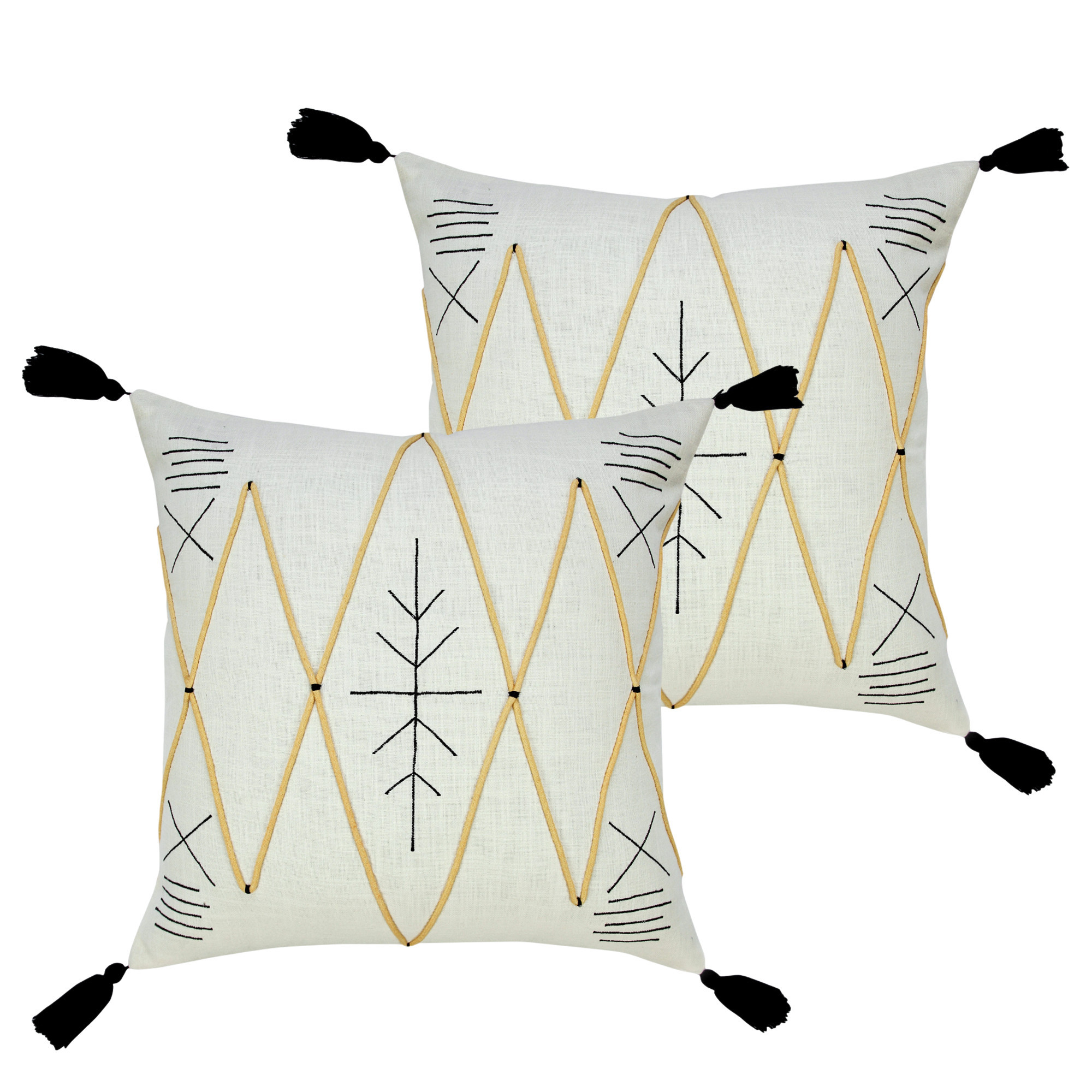 The perfect complement to your sofa, favorite chair, or bed, this set of two 20-inch white and black geometric cotton throw pillows is a great decorative accent. Ultra durable white and black cotton has been used to make this decorative pillow set a beautiful look that will stand the test of time. This soft polyester filled pillow not only is decorative but made to be comfy and cozy all day long. For anyone that loves to decorate or accent their space with color and texture. Decorative throw pillows not only add color and dimension to your space but can be comfy and supportive when you are lounging and cuddling as well. 20.00-inch h x 20.00-inch w x 4.00-inch d.