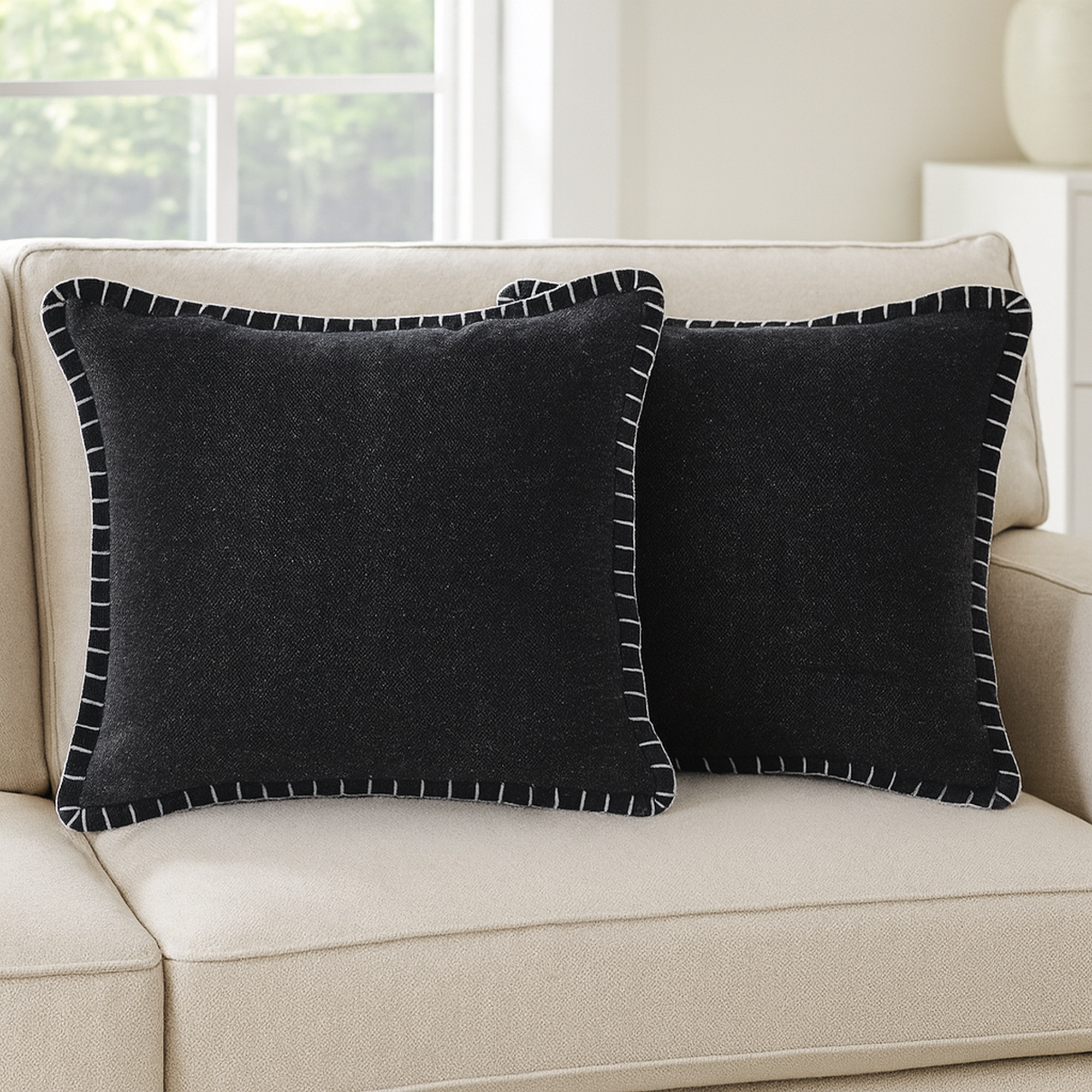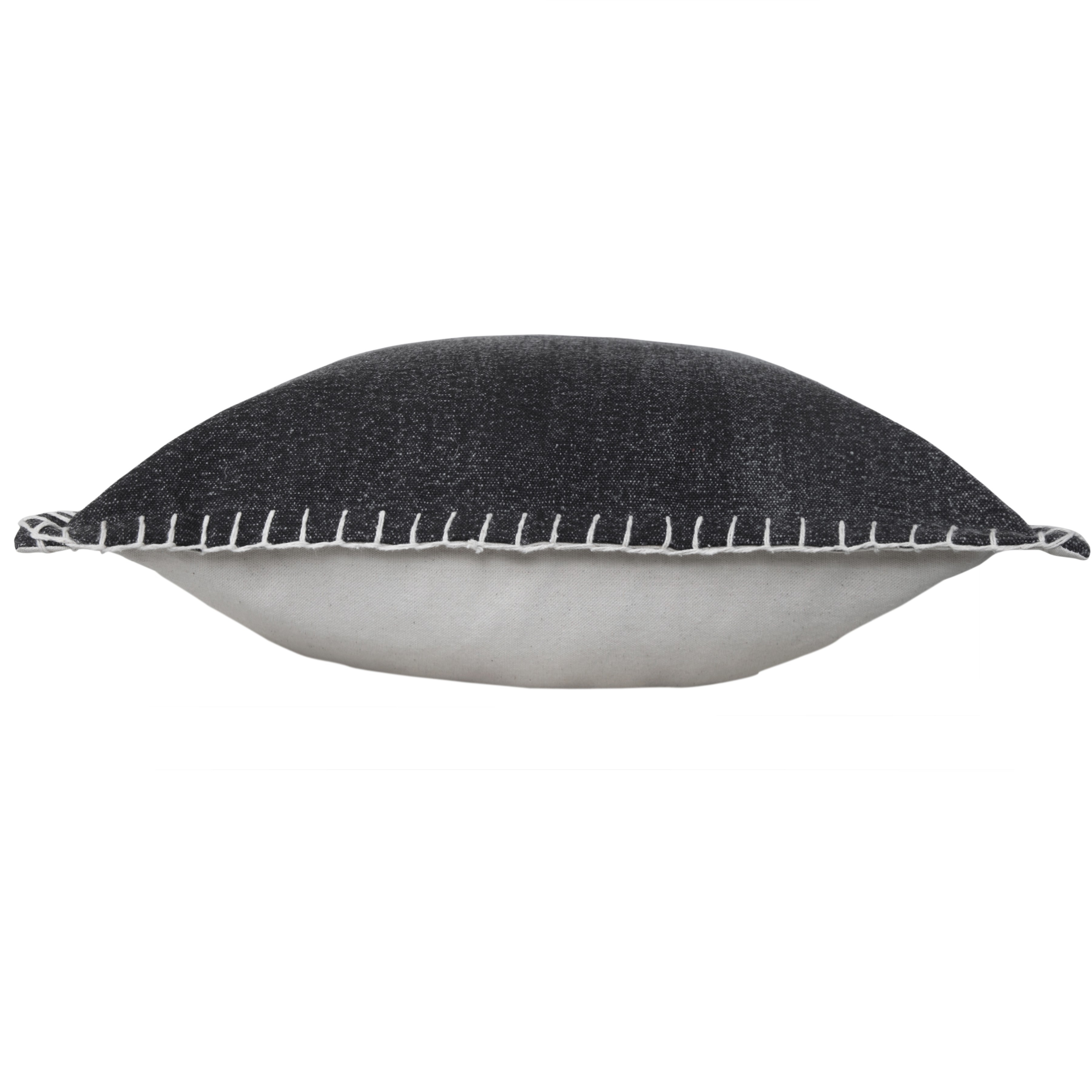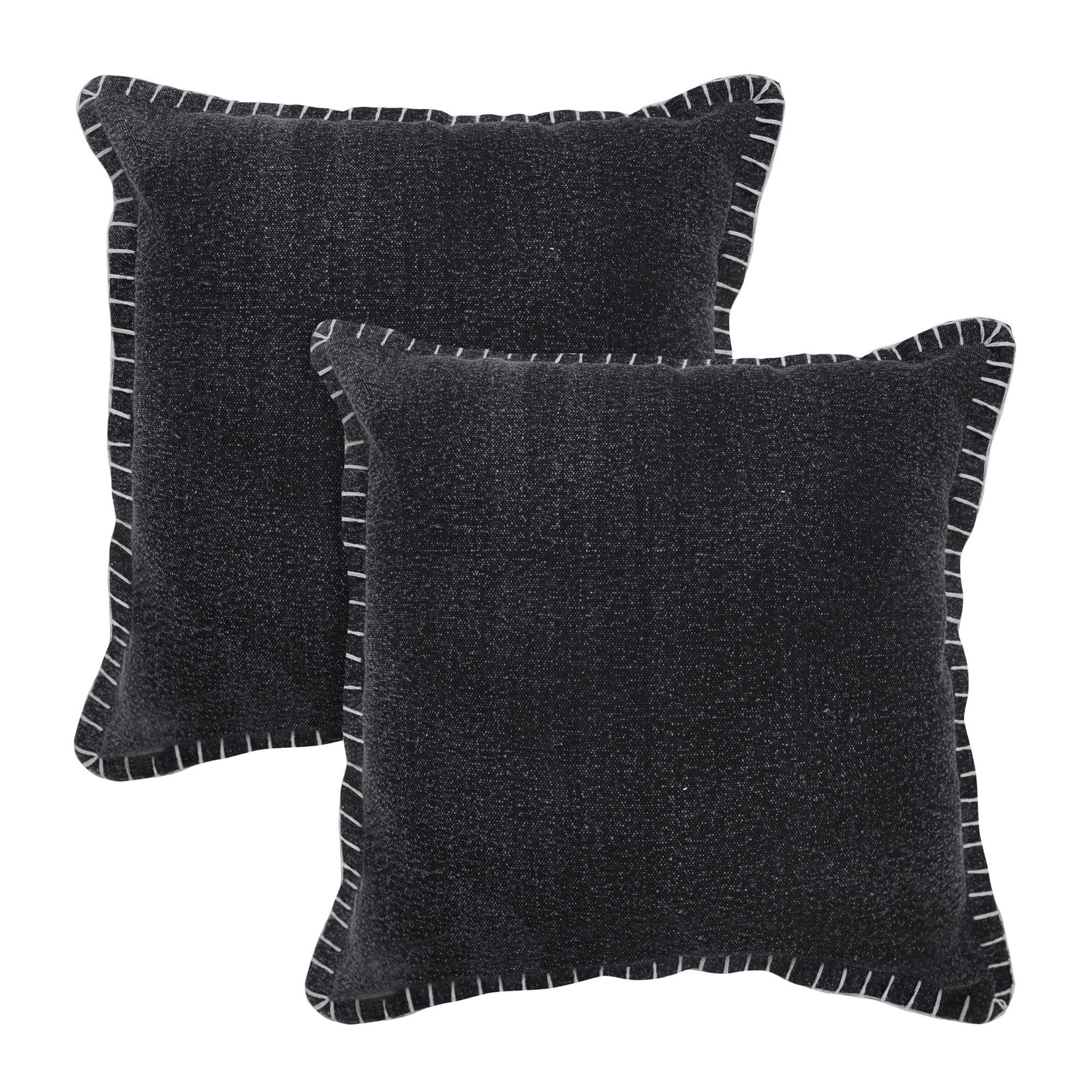 Bring a bit of fashion and zip to your space with this eye-catching and comfy set of two 20-inch black cotton throw pillows. Ultra durable black cotton has been used to make this decorative pillow set a beautiful look that will stand the test of time. Super soft and built to hold its shape, this polyester-filled pillow is a great option. For anyone that loves to decorate or accent their space with color and texture. Decorative throw pillows not only add color and dimension to your space but can be comfy and supportive when you are lounging and cuddling as well. 20.00-inch h x 20.00-inch w x 0.50-inch d.
