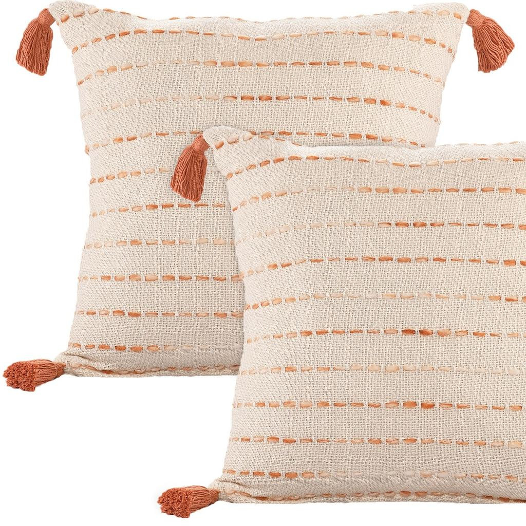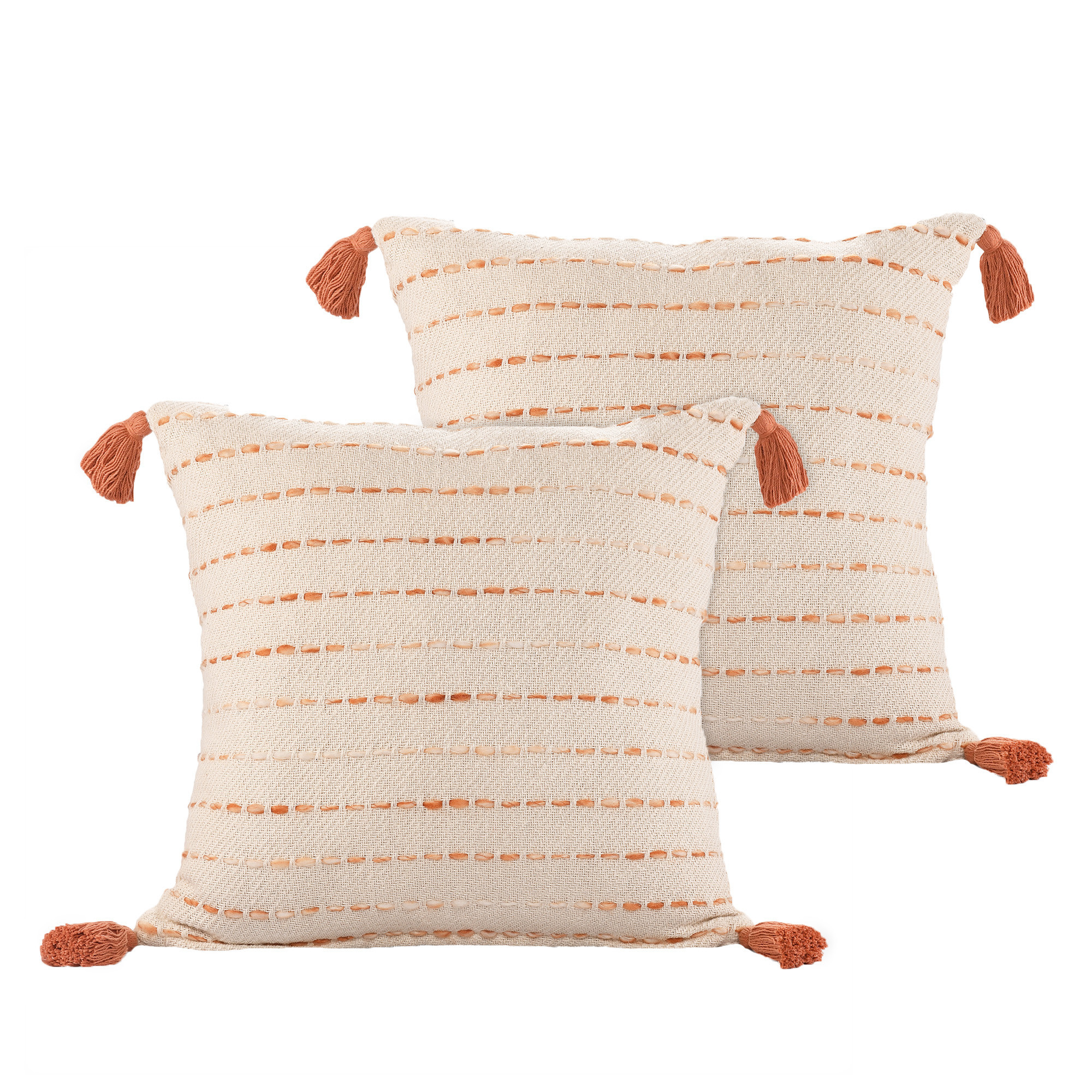 The set of two 20-inch beige and orange striped cotton blend throw pillows is the perfect decorative accessory for your home. The beige and orange coloring of the extremely durable and long lasting cotton blend pillows will add dimension and texture to your space. This soft polyester filled pillow not only is decorative but made to be comfy and cozy all day long. For anyone that loves to decorate or accent their space with color and texture. Decorative throw pillows not only add color and dimension to your space but can be comfy and supportive when you are lounging and cuddling as well. 20.00-inch h x 20.00-inch w x 4.00-inch d.