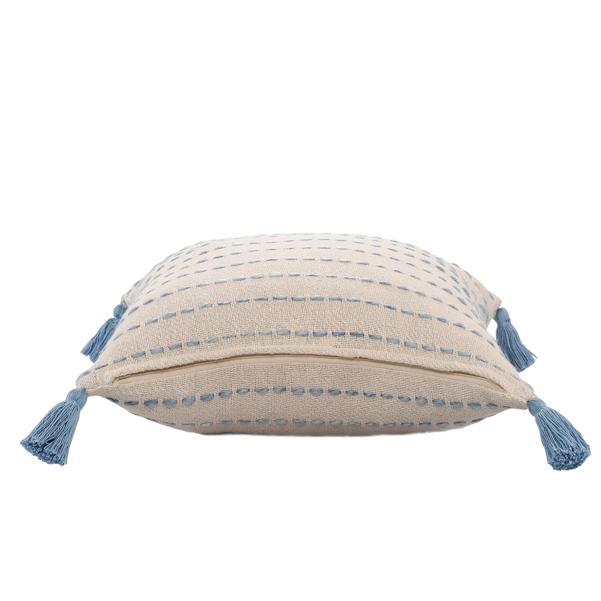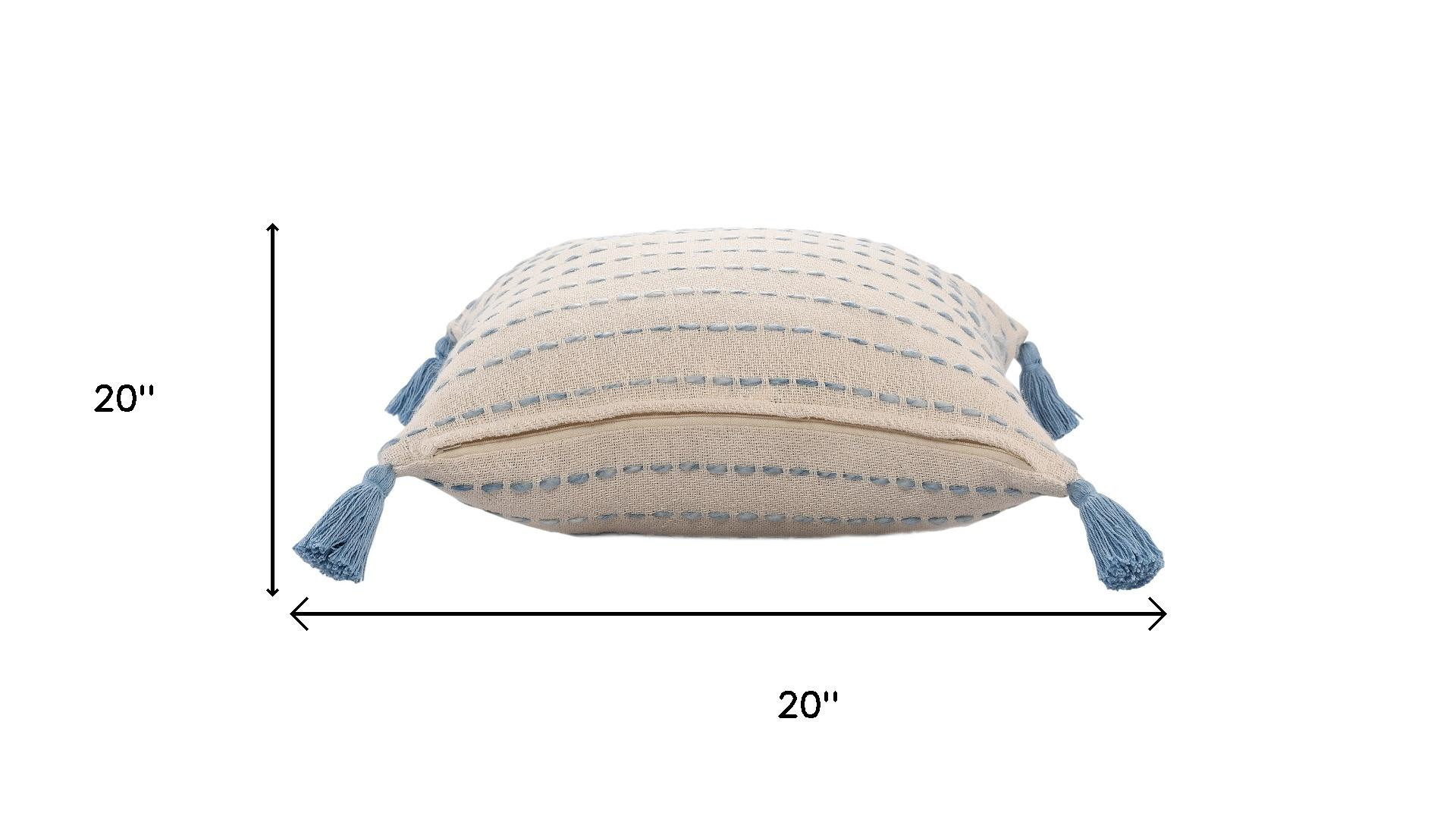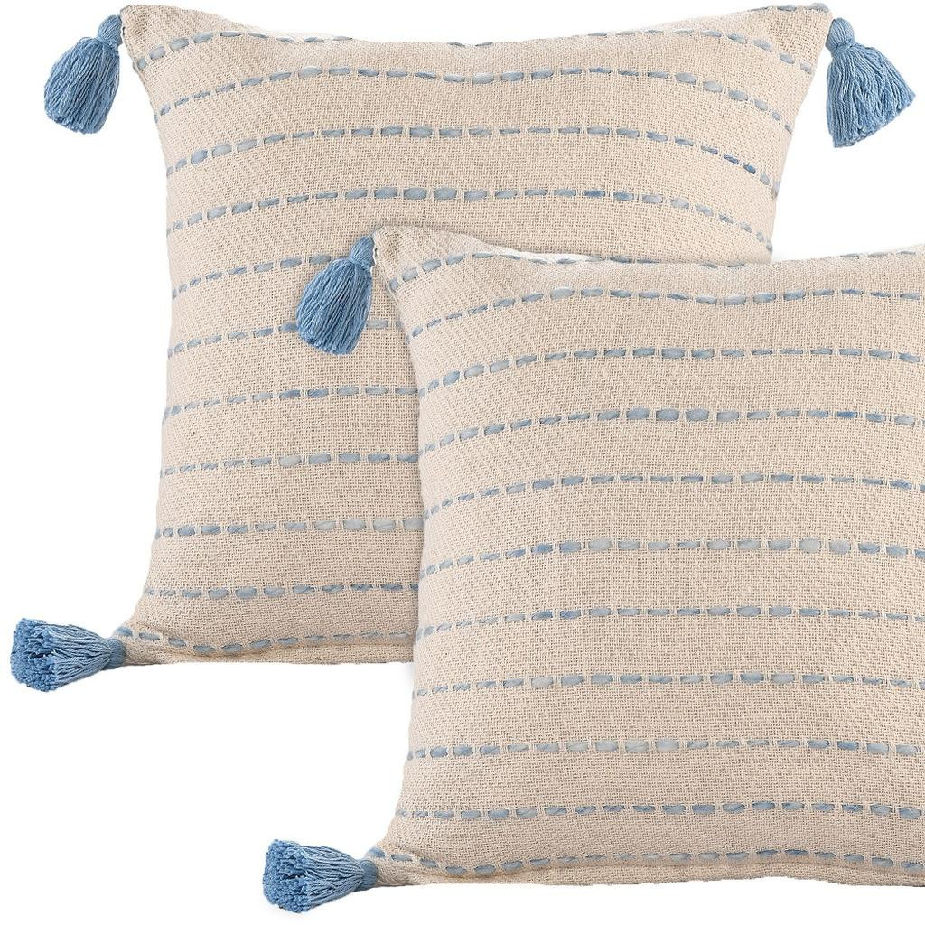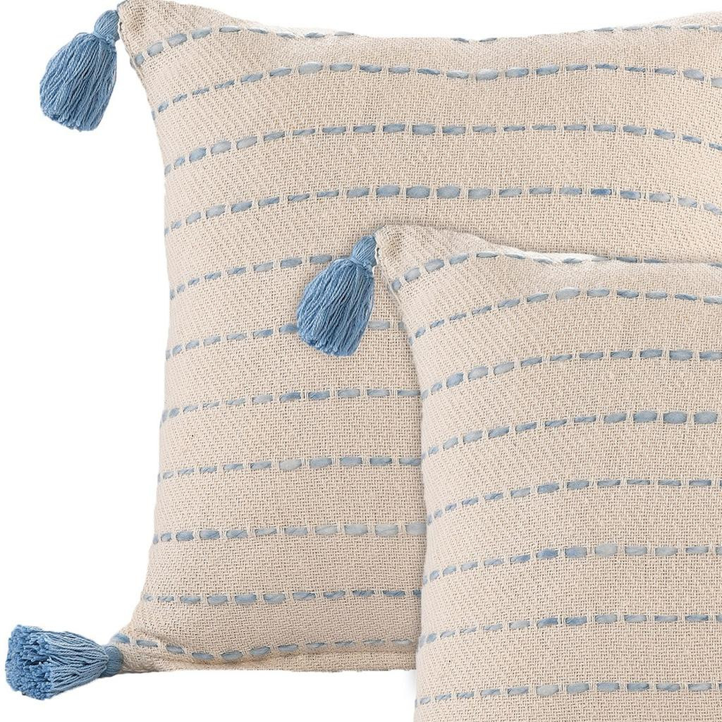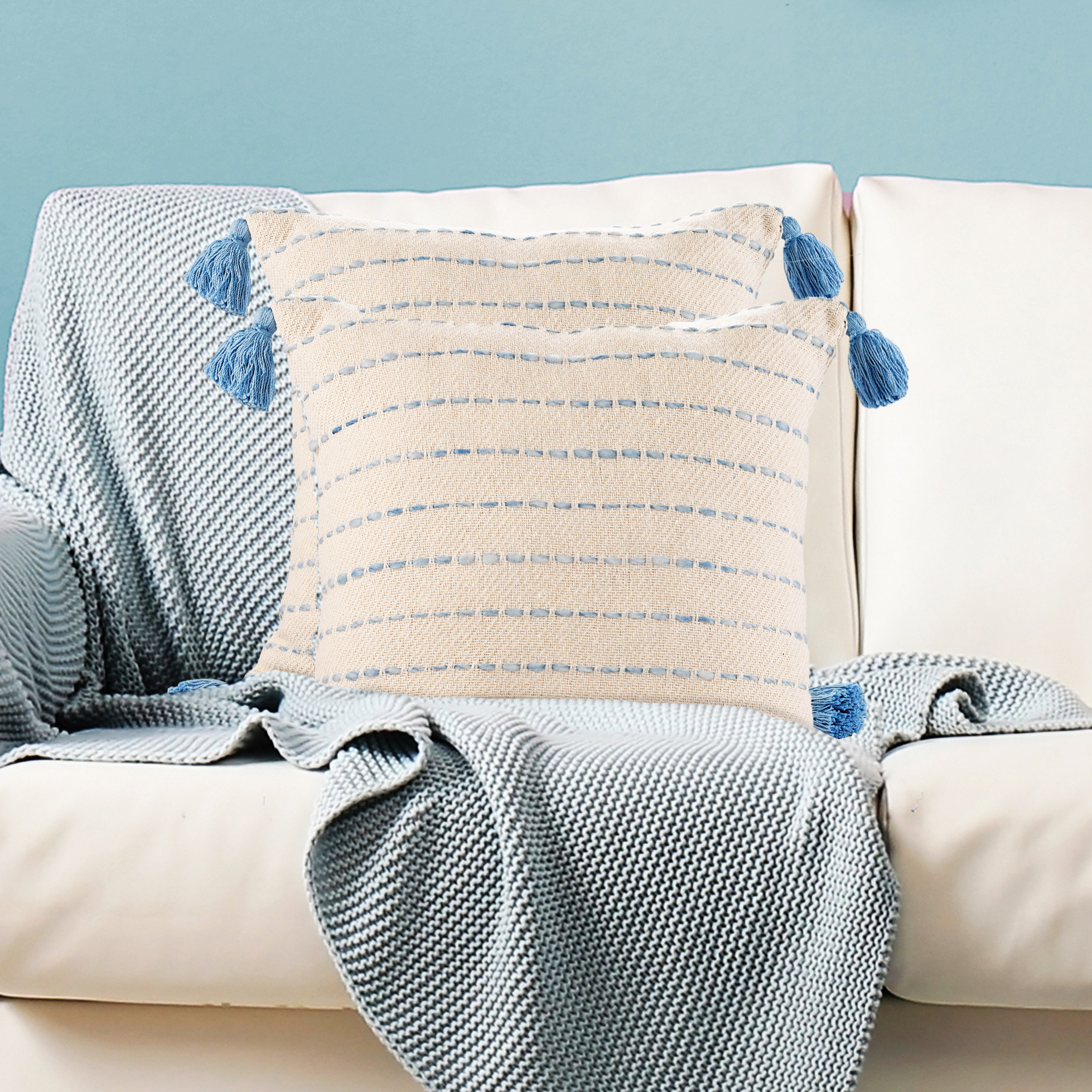 Bring a bit of fashion and zip to your space with this eye-catching and comfy set of two 20-inch blue and beige striped cotton blend throw pillows. These great looking soft decorative pillows are expertly made of durable and long lasting cotton blend in a blue and beige coloration. Super soft and built to hold its shape, this polyester-filled pillow is a great option. Decorative pillows are a great way to change up the look and feel of your space easily and quickly. Decorative throw pillows not only add color and dimension to your space but can be comfy and supportive when you are lounging and cuddling as well. 20.00-inch h x 20.00-inch w x 4.00-inch d.