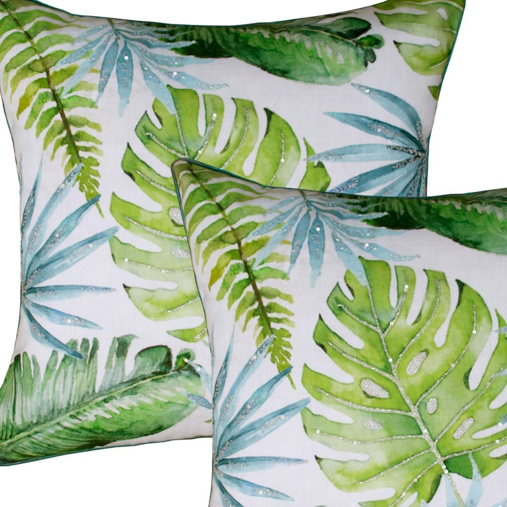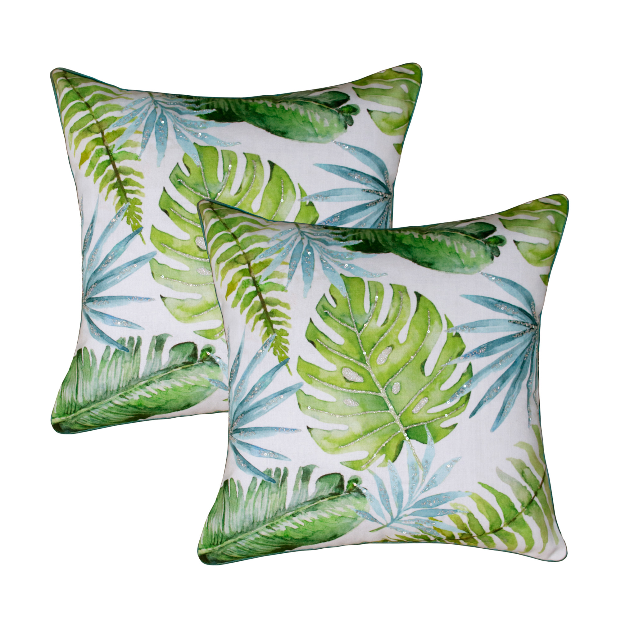 Add an air of fashion to your room and rejuvenate the space with this cute and fashionable set of two 20-inch green and blue beach tropical throw pillows. Ultra durable green and blue polyester has been used to make this decorative pillow set a beautiful look that will stand the test of time. Super soft and built to hold its shape, this polyester-filled pillow is a great option. Great to use on its own or mix with other decorations for the perfect look. Decorative throw pillows not only add color and dimension to your space but can be comfy and supportive when you are lounging and cuddling as well. 20.00-inch h x 20.00-inch w x 4.00-inch d.