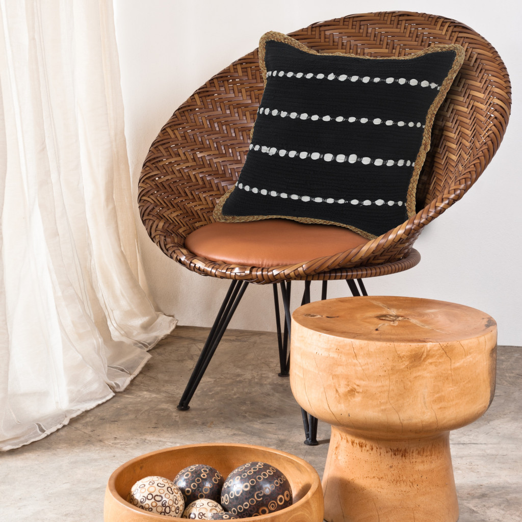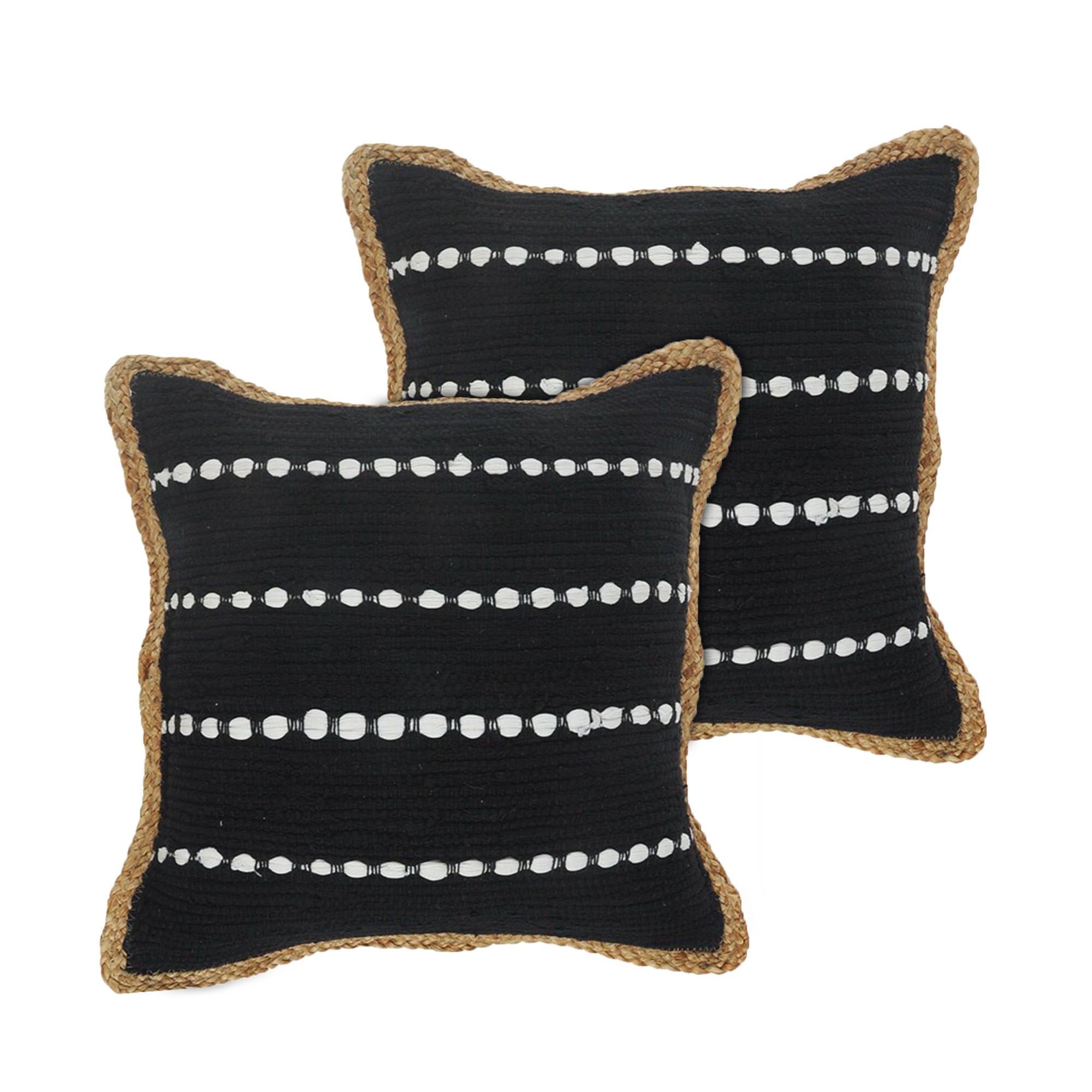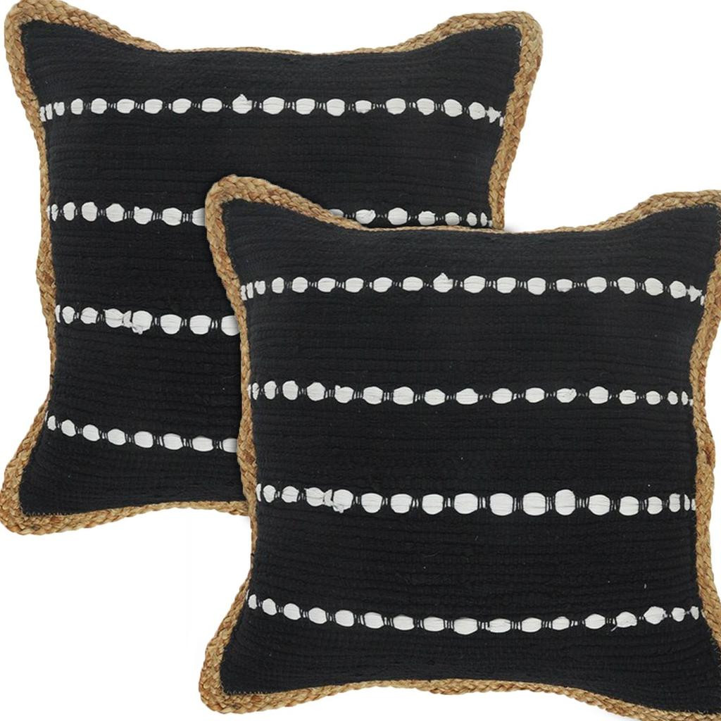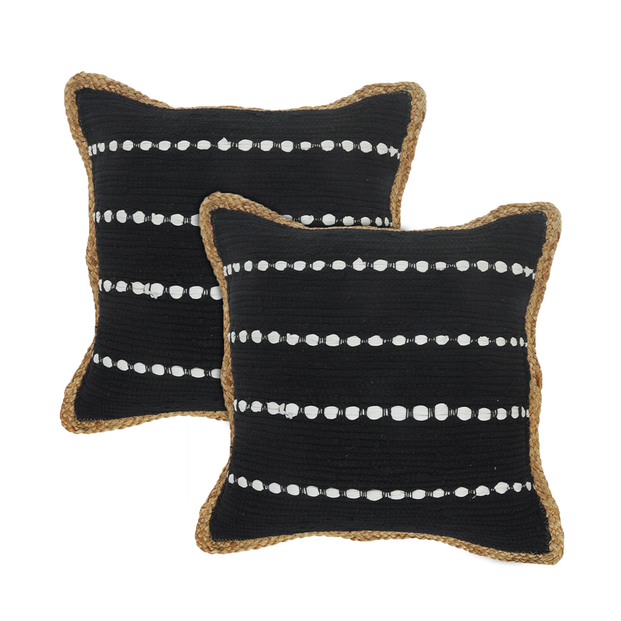 This set of two 18-inch black and white beach striped cotton blend throw pillows will add a beautiful decorative accent to your decor. Ultra durable black and white cotton blend has been used to make this decorative pillow set a beautiful look that will stand the test of time. Super soft and built to hold its shape, this polyester-filled pillow is a great option. For anyone that loves to decorate or accent their space with color and texture. A great decorative accessory to add color and dimension to your favorite chair, accent your sofa, or to use as part of your bed ensemble. 18.00-inch h x 18.00-inch w x 4.00-inch d.
