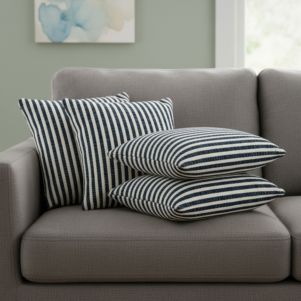 Add an air of fashion to your room and rejuvenate the space with this cute and fashionable set of four 22-inch blue and white striped cotton throw pillows. Ultra durable blue and white cotton has been used to make this decorative pillow set a beautiful look that will stand the test of time. This soft polyfill filled pillow not only is decorative but made to be comfy and cozy all day long. Emblazoned with the text these pillows add some visual interest and decor to your space. Decorative pillows are a great way to change up the look and feel of your space easily and quickly. Decorative throw pillows not only add color and dimension to your space but can be comfy and supportive when you are lounging and cuddling as well. 22.00-inch h x 22.00-inch w x 4.00-inch d.