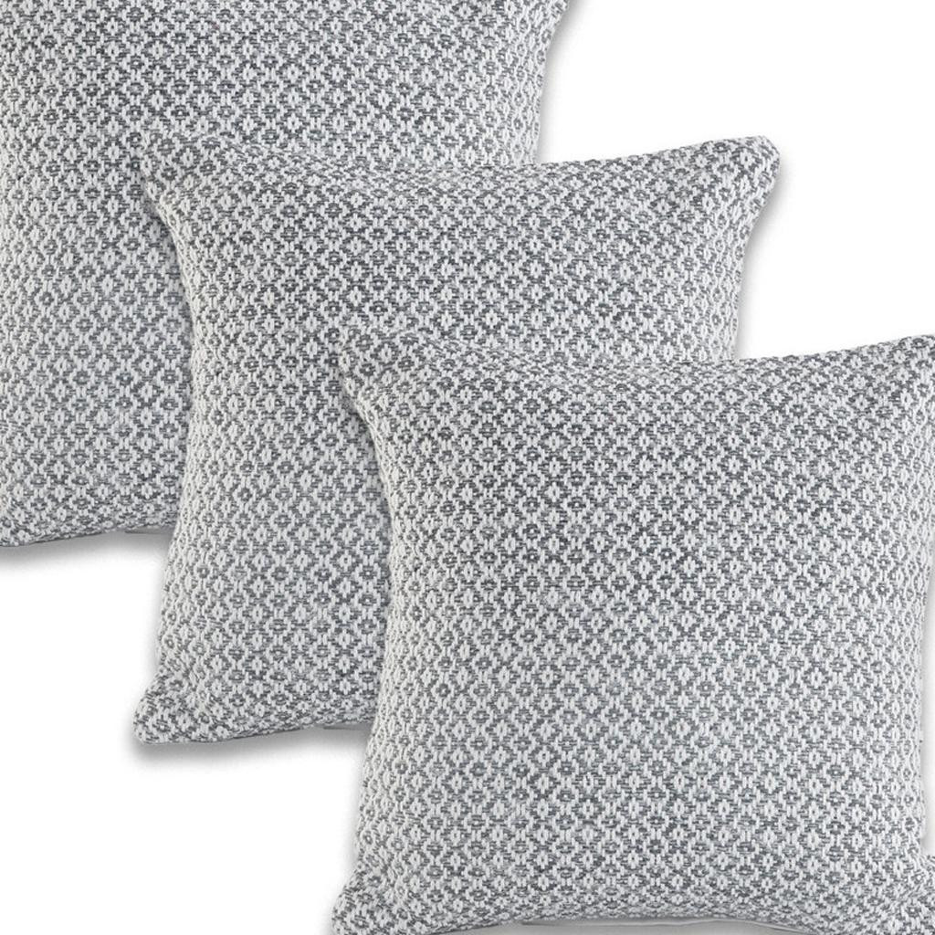 Unique and decorative, this comfortable set of four 18-inch gray and white geometric cotton throw pillows will leave a lasting impression. This gray and white colored decorative pillow set is made from high grade cotton that is durable and soft to the touch. This soft polyester filled pillow not only is decorative but made to be comfy and cozy all day long. Great to use on its own or mix with other decorations for the perfect look. A great decorative accessory to add color and dimension to your favorite chair, accent your sofa, or to use as part of your bed ensemble. 18.00-inch h x 18.00-inch w x 7.00-inch d.
