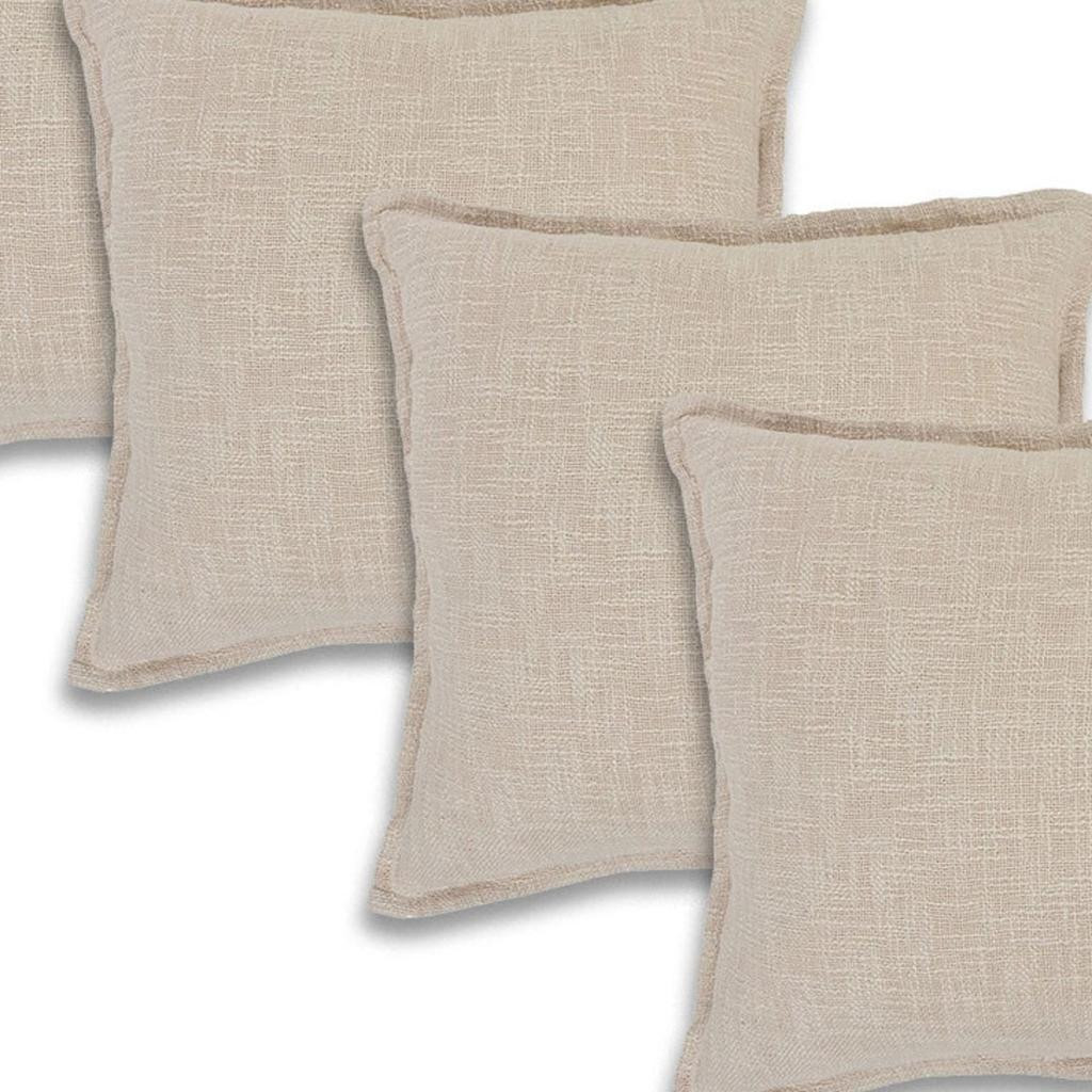 This set of four 20-inch beige cotton throw pillows will add a beautiful decorative accent to your decor. This beige colored decorative pillow set is made from high grade cotton that is durable and soft to the touch. This soft polyester filled pillow not only is decorative but made to be comfy and cozy all day long. For anyone that loves to decorate or accent their space with color and texture. Decorative throw pillows not only add color and dimension to your space but can be comfy and supportive when you are lounging and cuddling as well. 20.00-inch h x 20.00-inch w x 8.00-inch d.