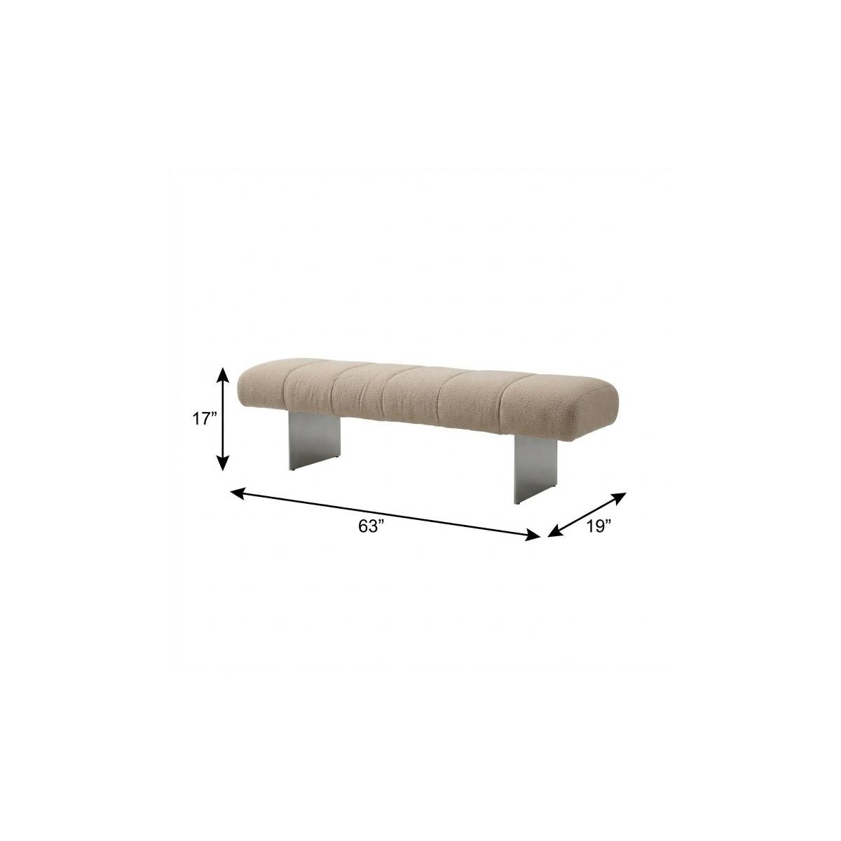 Optimize your space and add some charm to your room with the 63-inch beige and nickel boucle and steel upholstered bench. A nickel steel frame is finished off with a beige soft and textural boucle upholstery seat that is the epitome of quality construction and design. Adding this bench to the end of your bed is a great idea to help you get ready in the morning. Easy to blend into most any room, a bench is a way to add a good looking accent to your space that can also be practical and useful. 17.00-inch h x 63.00-inch w x 19.00-inch d.