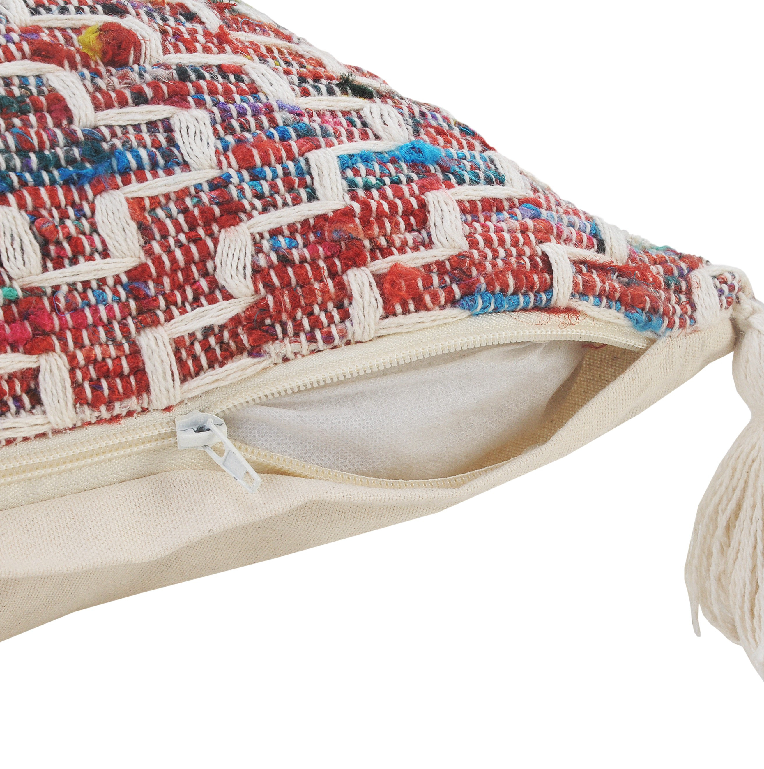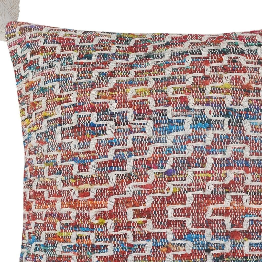 The 20-inch red blue and natural geometric polyester blend throw pillow cover with tassels is the perfect decorative accessory for your home. This blue, natural, and red hued, accent pillow cover, represents quality construction, expertly made from durable polyester blend that is not only long lasting but soft to the touch as well. Fun and decorative tassels add some high end and hand-crafted textural designer touches. Decorative pillow covers are a great way to change up the look and feel of your space easily and quickly. Combine with your own fill or insert to add decoration and dimension to your favorite chair, accent your sofa, or to use as part of your bed ensemble. 20.00-inch h x 20.00-inch w x 0.50-inch d.