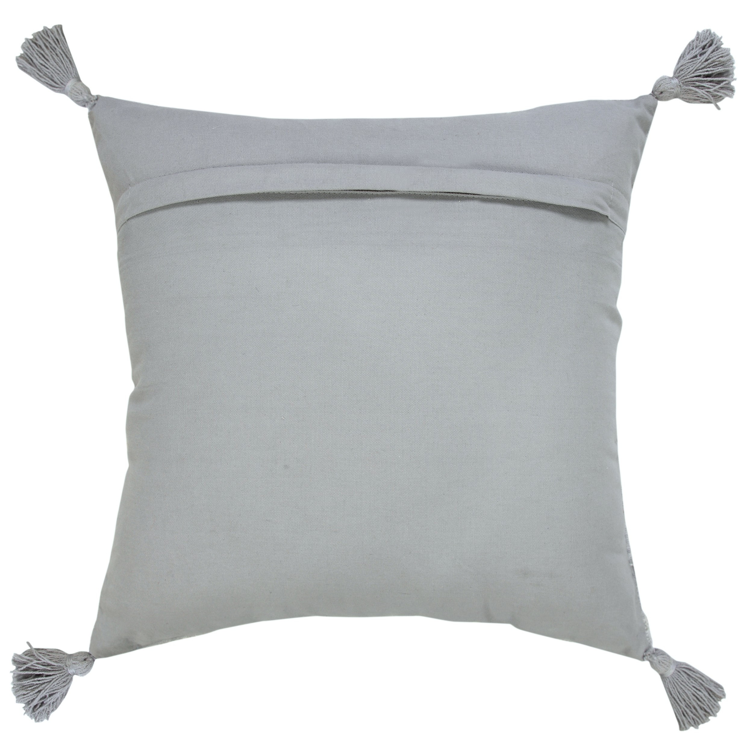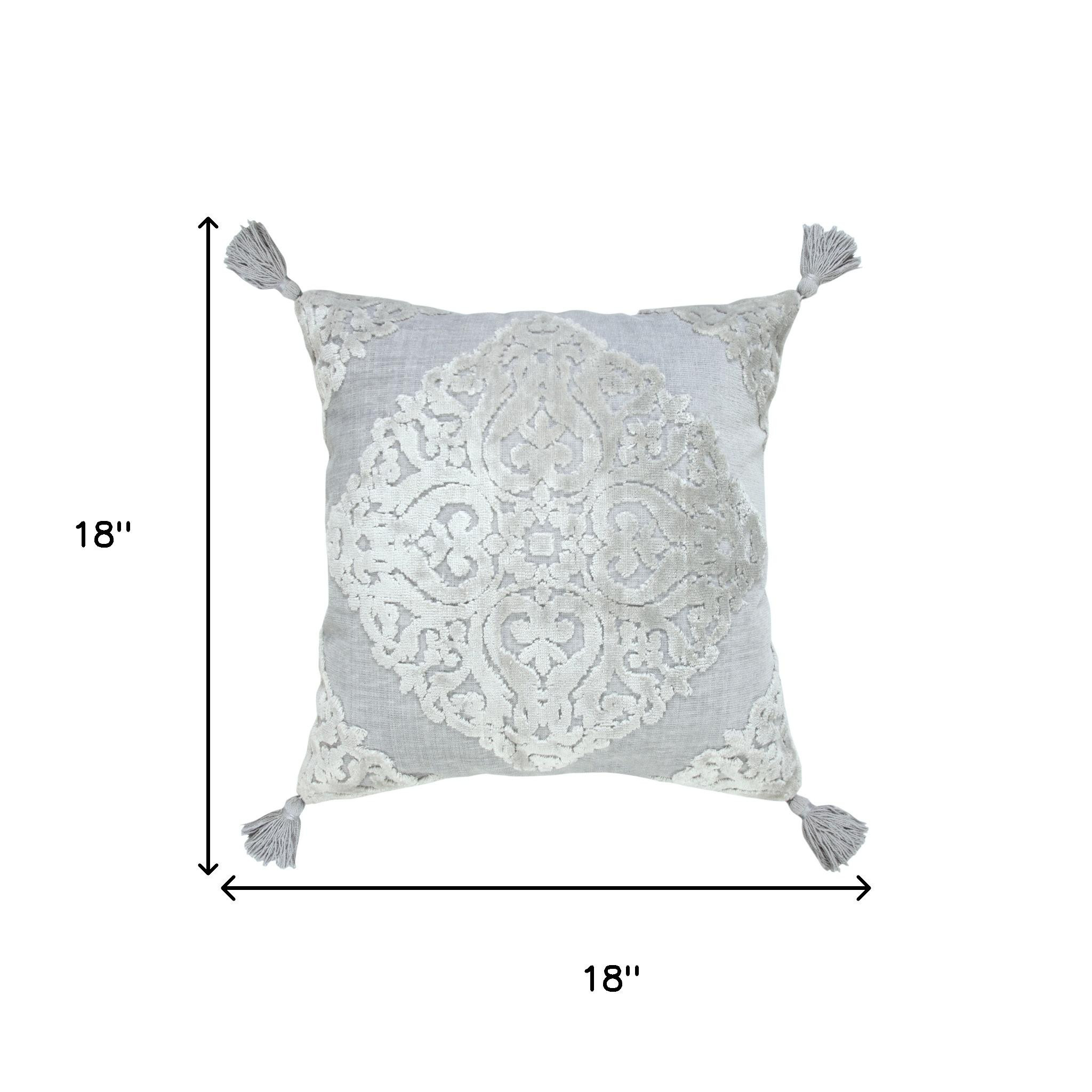 The 18-inch silver and gray medallion viscose throw pillow cover with tassels is the perfect decorative accessory for your home. This soft and durable decorative pillow cover is expertly made of high grade, long lasting viscose in a gray and silver coloration. Fun and decorative tassels add some high end and hand-crafted textural designer touches. Decorative pillow covers are a great way to change up the look and feel of your space easily and quickly. Combine with your own fill or insert to add decoration and dimension to your favorite chair, accent your sofa, or to use as part of your bed ensemble. 18.00-inch h x 18.00-inch w x 0.25-inch d.